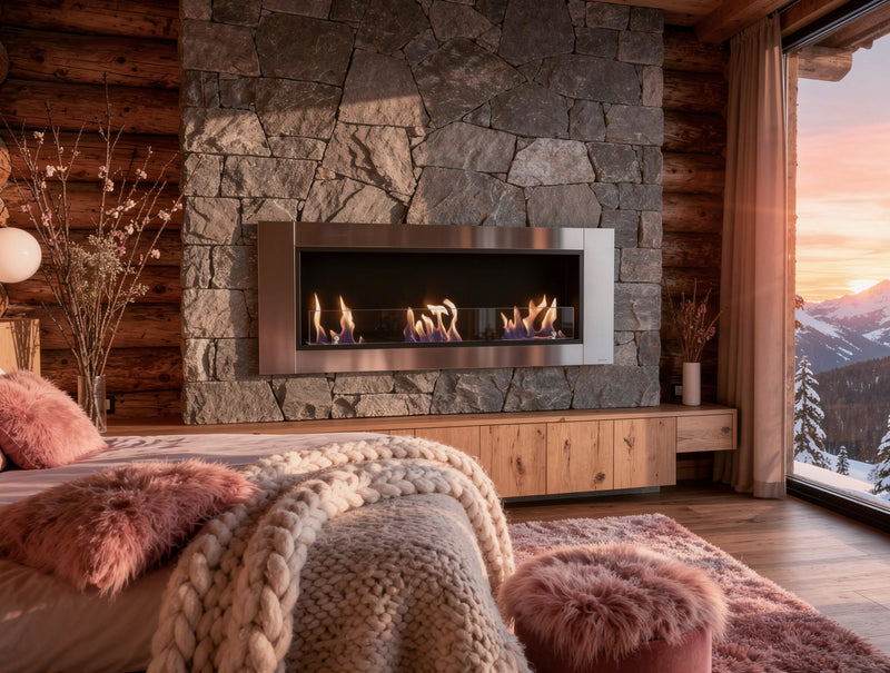 Biochimenea mural panorámica de acero. Ofrece llamas reales y sensación de calor inmediata sin humos ni olores. Diseño rectangular con cristal frontal templado.