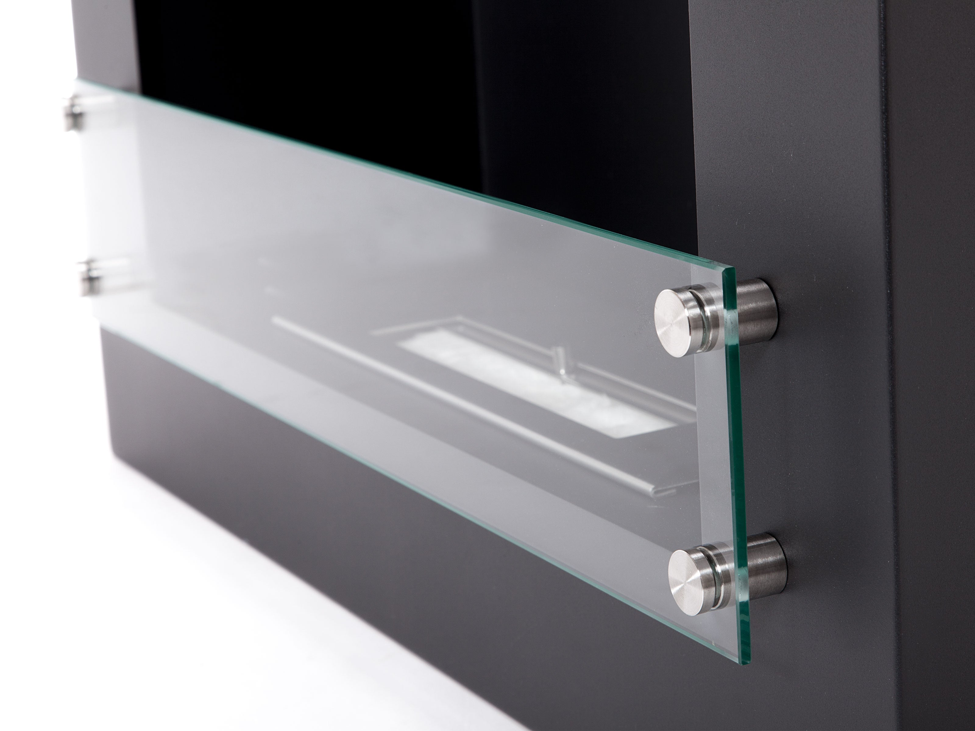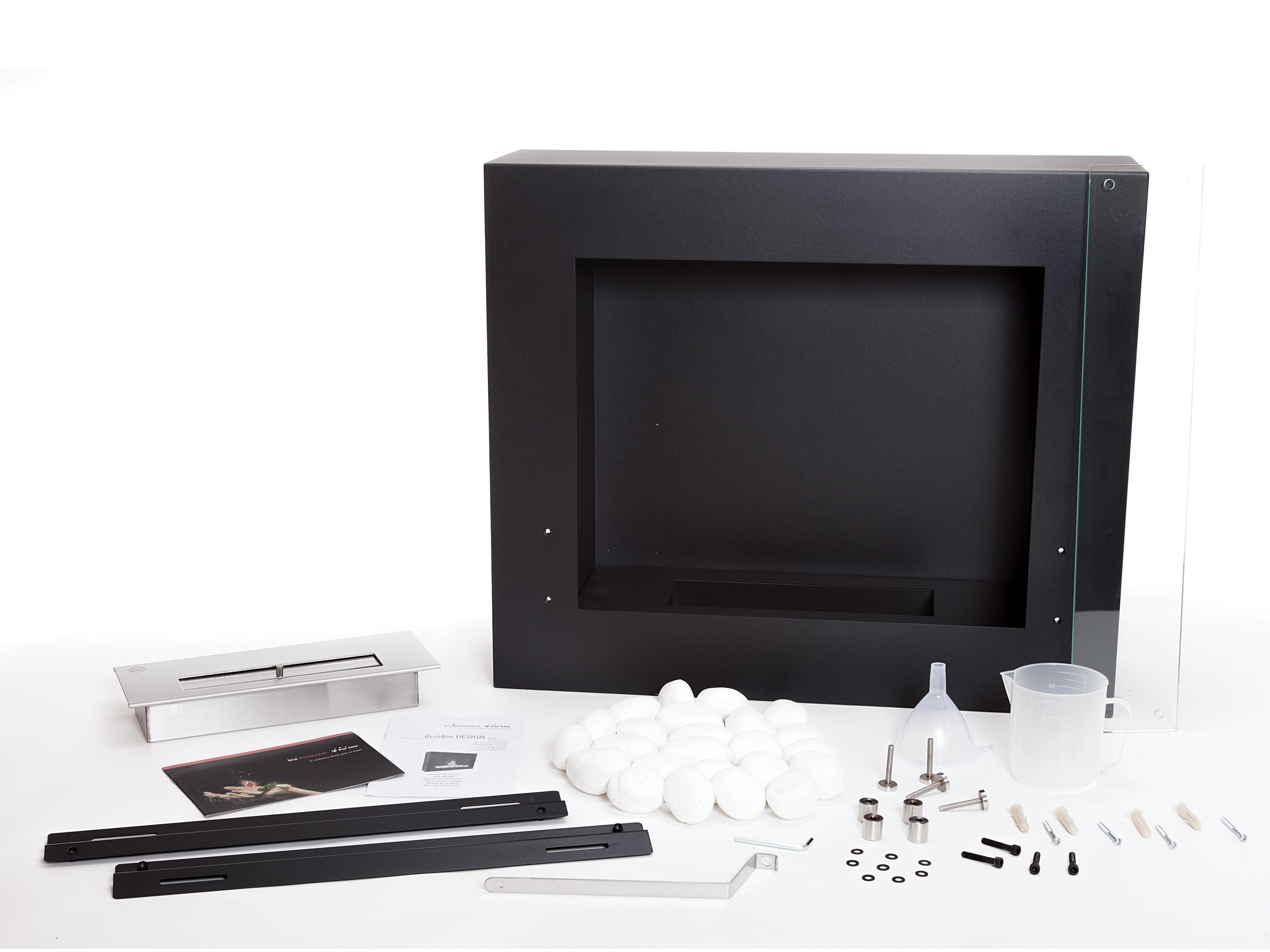 Chimenea de etanol de 2kW y 1.2L de capacidad. Diseño rectangular en acero lacado negro. Incluye un kit de piedras cerámicas. jarra y embudo para facilitar el llenado. Sin humos. olores ni cenizas.
