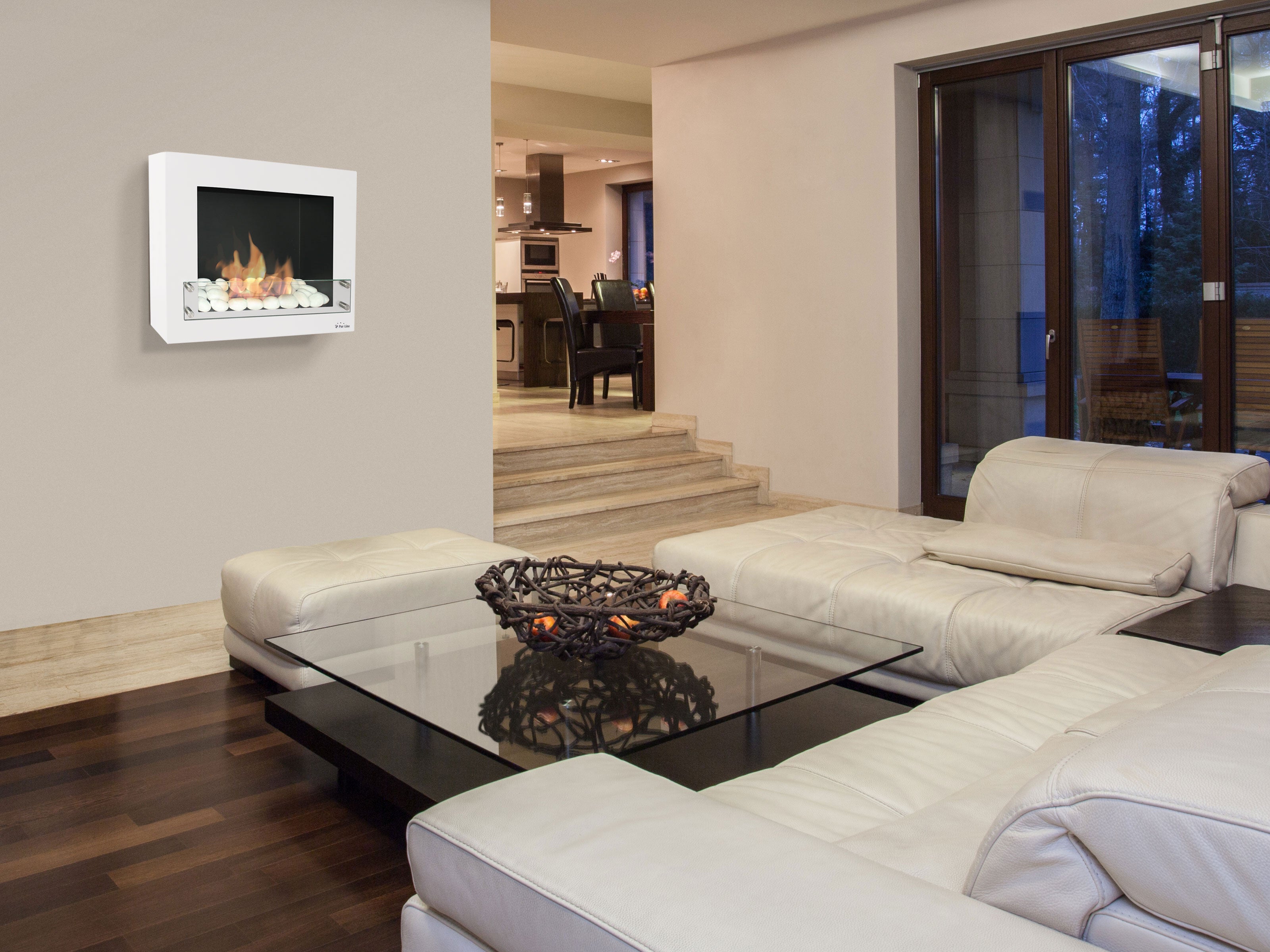 Chimenea de etanol mural en blanco con piedras cerámicas