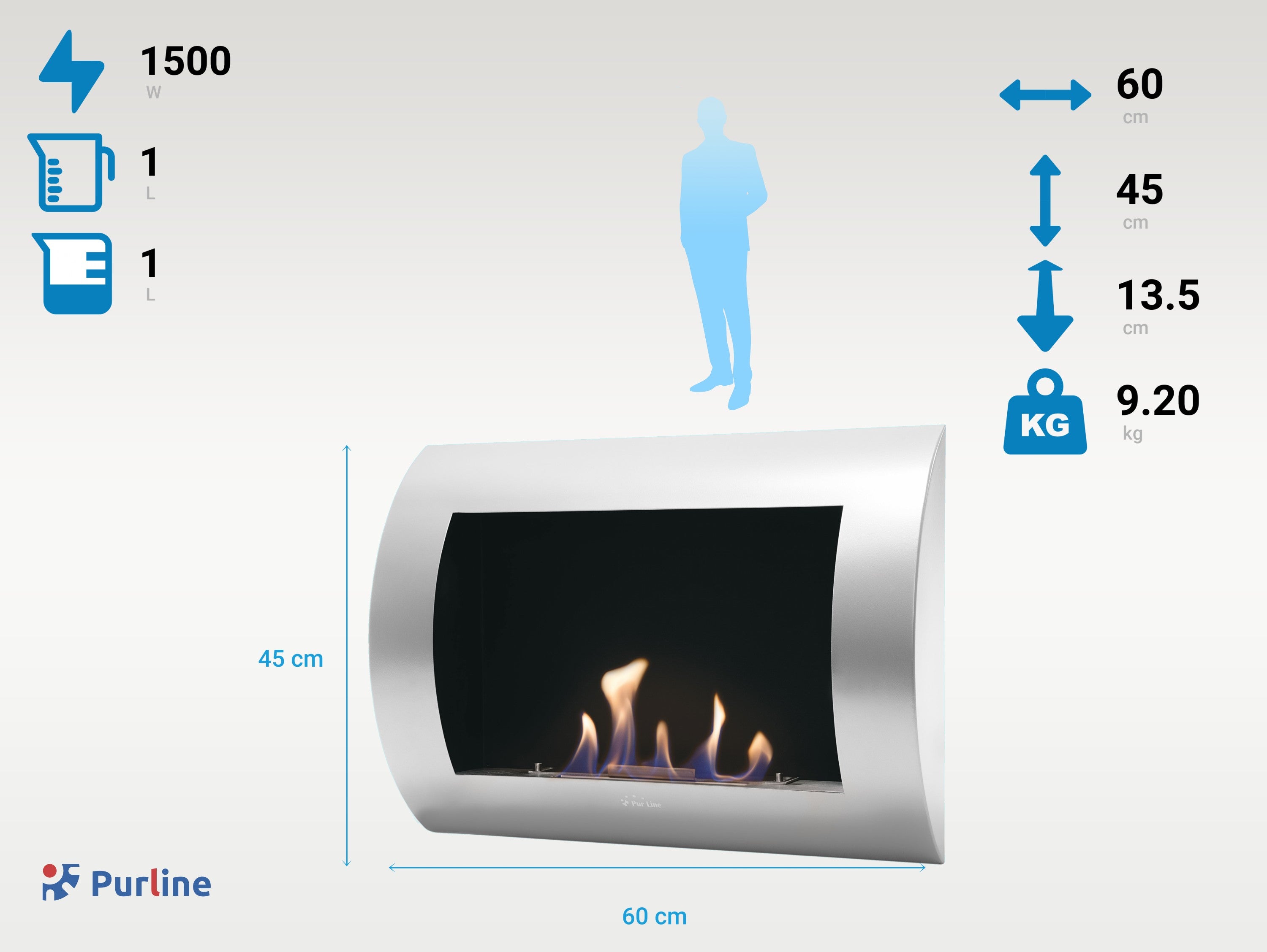 ¿Alguna vez pensaste tener una chimenea en tu casa? Gracias a Purline ya puedes conseguirlo, solo necesitas esta biochimenea, un poco de su combustible líquido de origen natural y rápidamente tendrás un fuego con llamas y calor reales en tu salón, dormitorio o despacho, limpia, sin humos ni cenizas y de fácil mantenimiento. Además incorpora fibra cerámica para garantizar su seguridad.Incluye kit de colgado, y su tamaño (LxPxH: 60 x 13.4 x 45 cm), su ligereza (8kg) y su diseño moderno la hacen perfecta para poner en la pared o encastrarla, sin necesidad de obras ni salida de humos, ayudando a crear un ambiente acogedor, cálido y genuino. La INOX CLASSIC es una biochimenea diseñada en forma de rectángulo, con un estilo muy sencillo pero que incorpora un panel frontal curvado que aportará un toque de modernidad y distinción a tu hogar. Fabricada en acero lacado plateado, incluye un depósito de 0.8L de capacidad cuya llama puede ser regulable, además su potencia calorífica es equivalente a 1.5KW.