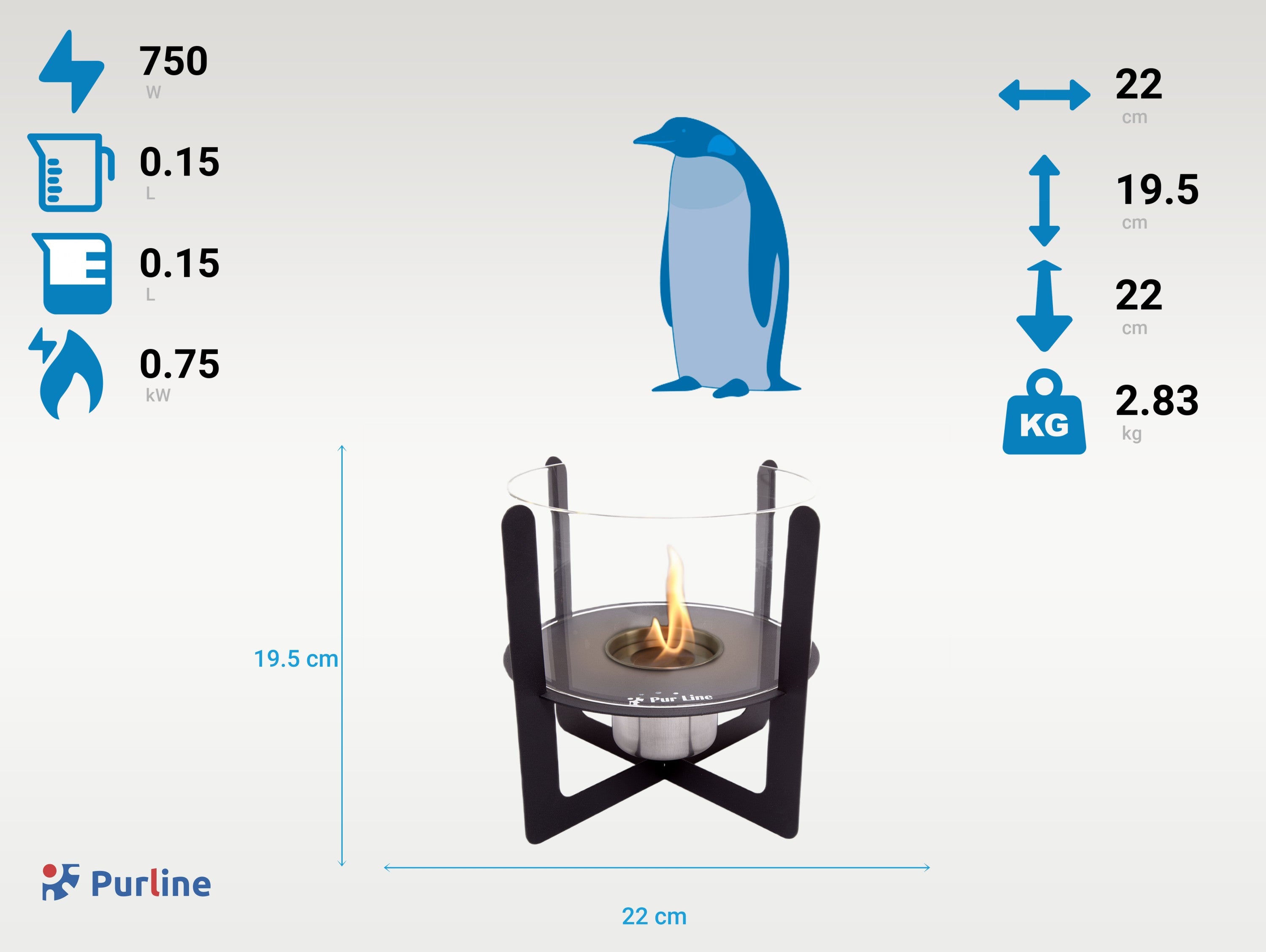 La chimenea tiene una potencia calorífica de 0.75 kW, lo que proporciona un calor agradable y suficiente para crear un ambiente cálido y acogedor en espacios pequeños como salones, dormitorios o terrazas.