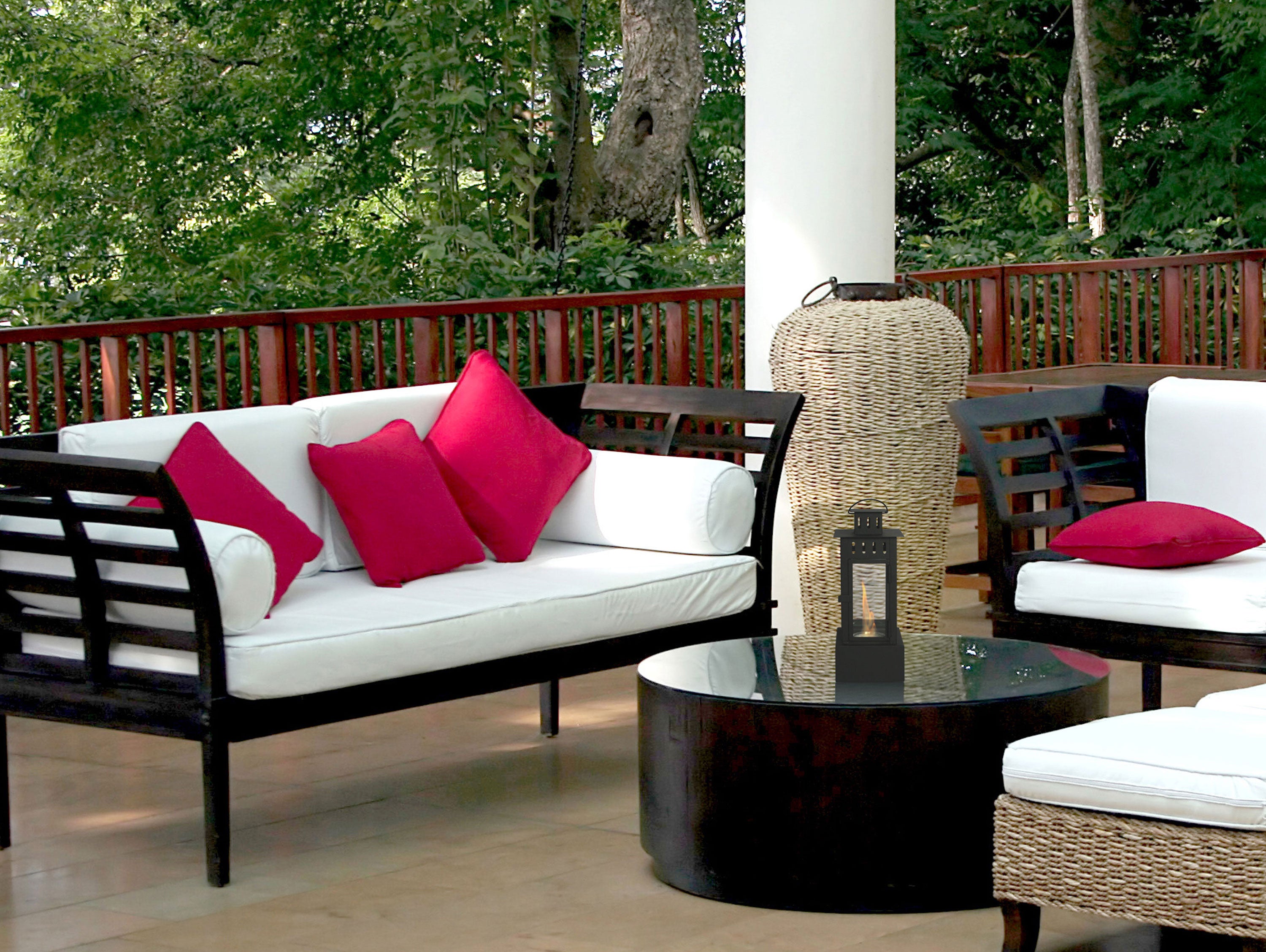 Su tamaño (LxPxH: 15 x 15 x 38 cm), su ligereza (2,8kg) y su diseño moderno la hacen perfecta para usar en terrazas y jardines, en suelo o sobre muebles, ayudando a crear un ambiente acogedor, cálido y genuino.