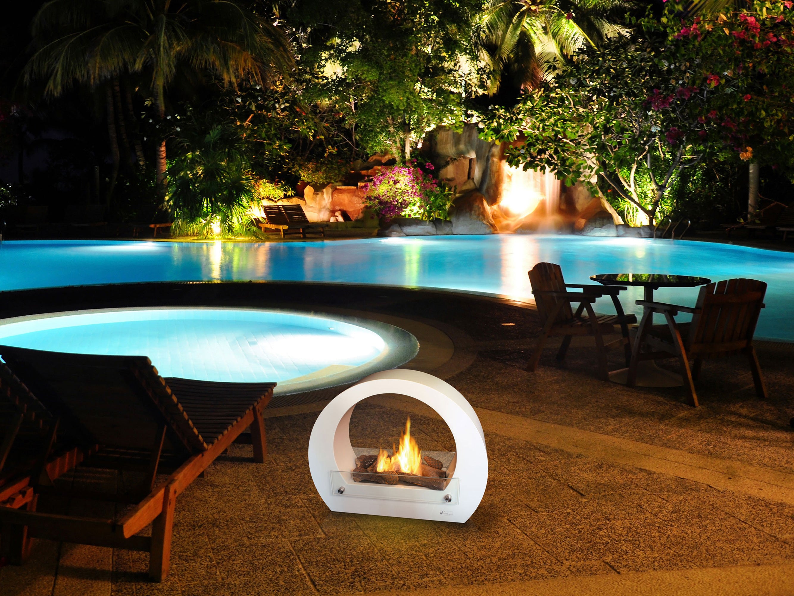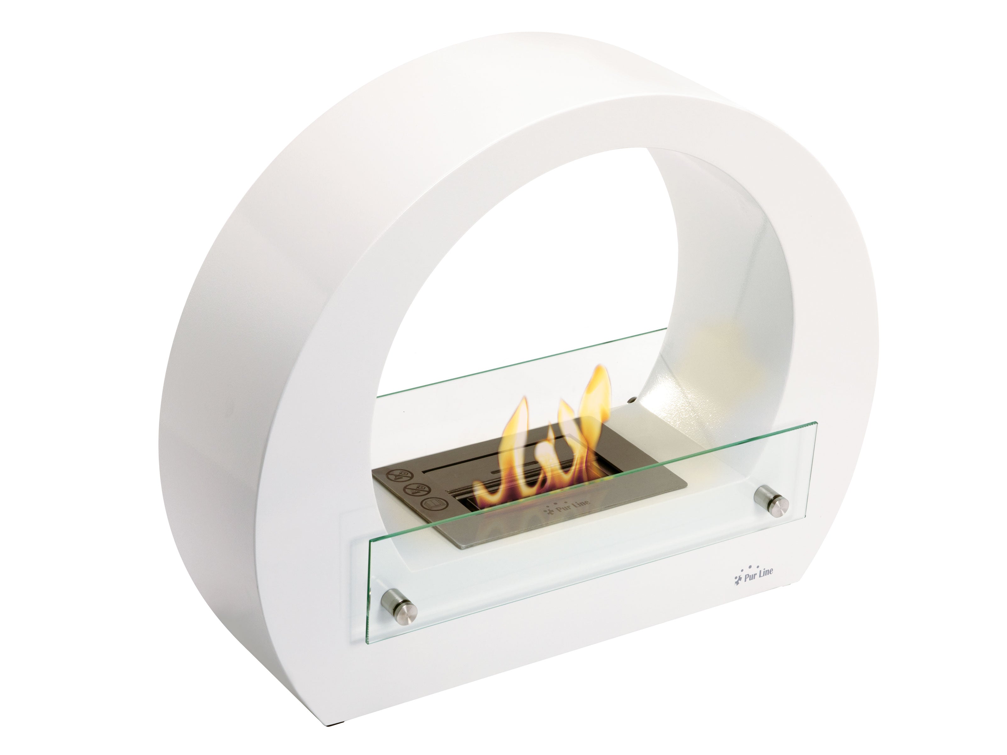 Chimenea en forma de semicírculo en acero inoxidable lacado en blanco y dos cristales de vidrio templado. Incluye un depósito de 1.5L cuya potencia calorífica es equivalente a 2KW. además su llama es regulable.