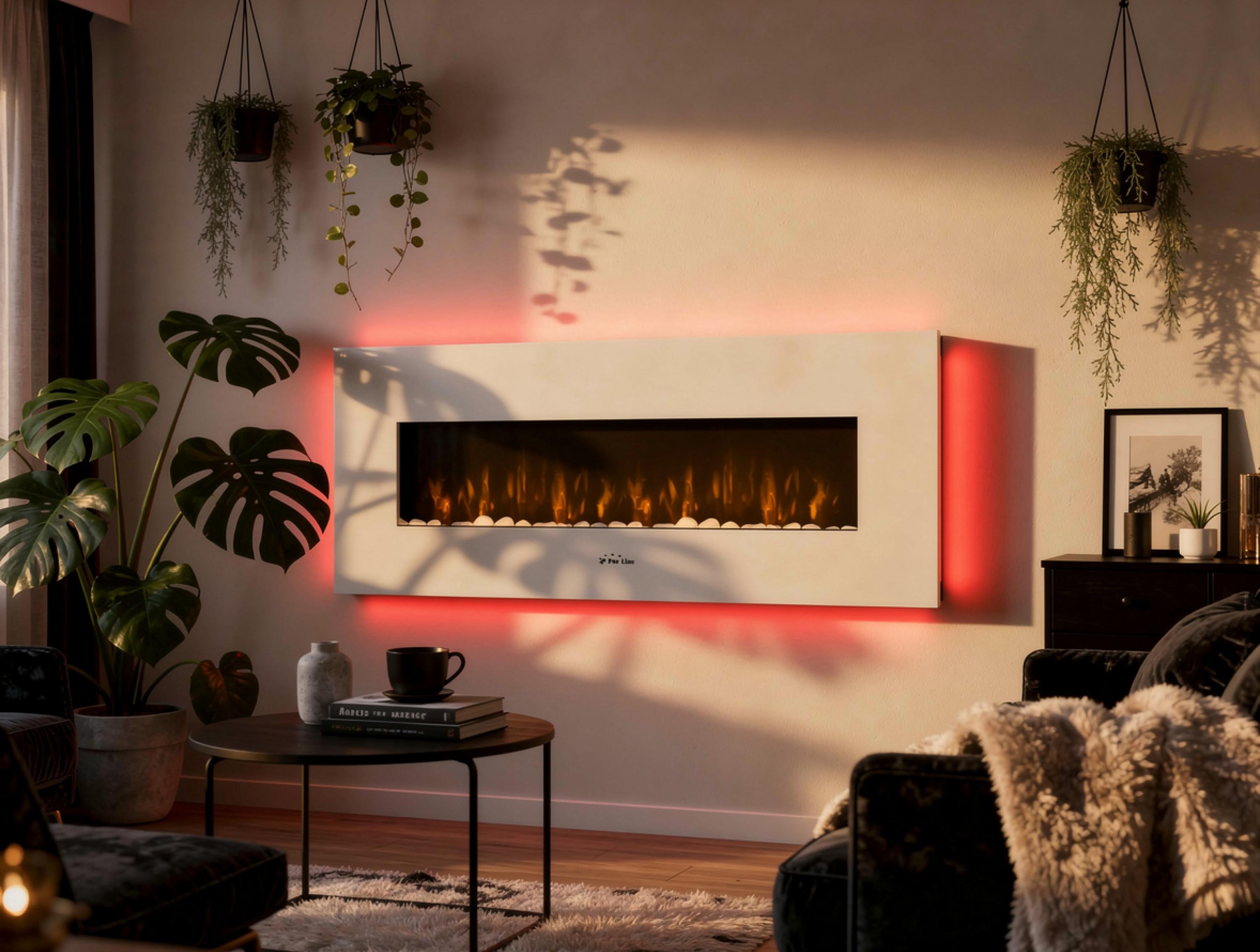 Chimenea Eléctrica Panorámica con luz LED ambiental y panel frontal blanco