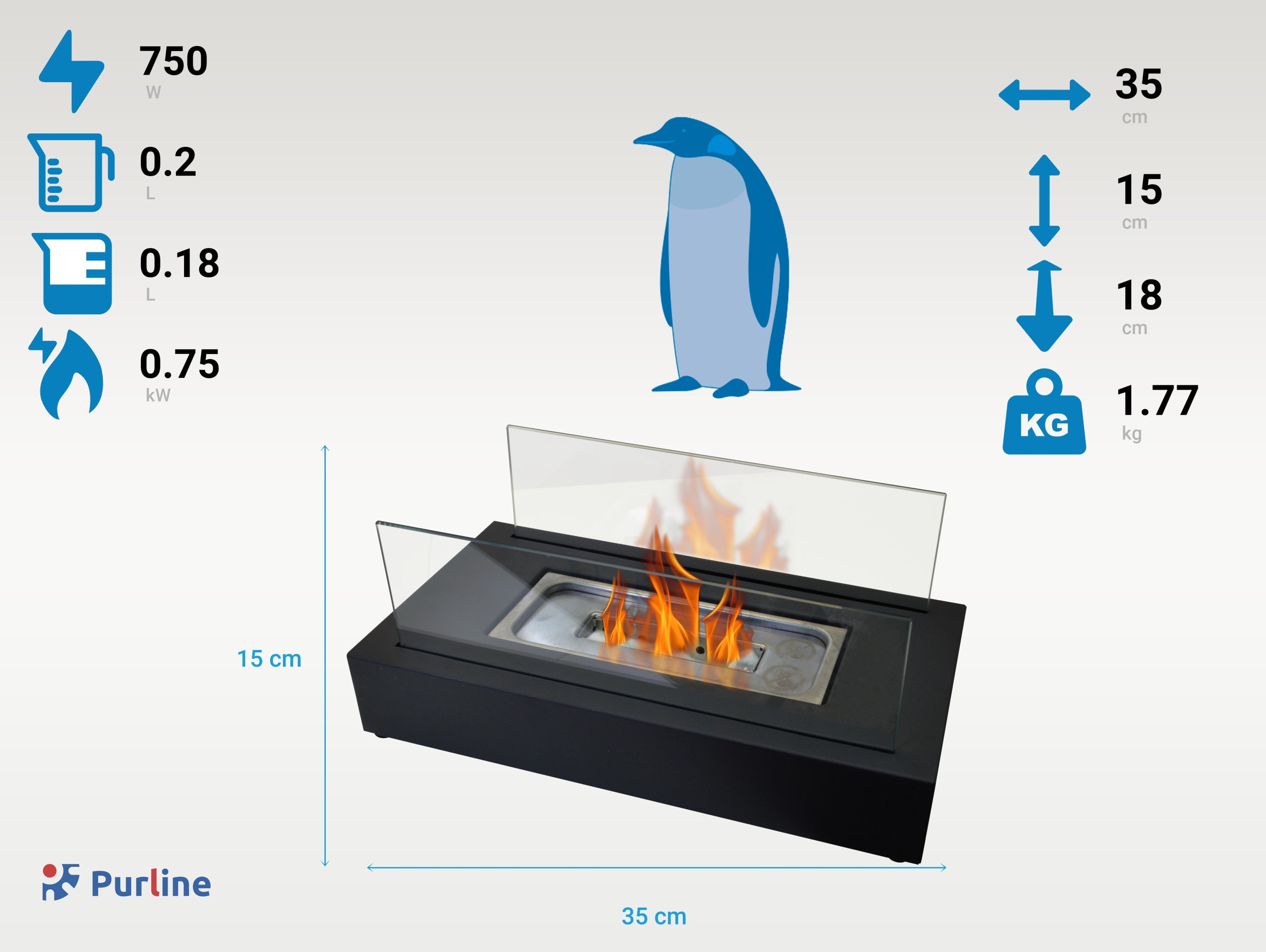 Esta chimenea tiene un tamaño de 35 x 15 x 18 cm (LxPxH) y un peso de 2 kg. Es compacta y ligera, lo que la hace perfecta para usar en terrazas, jardines y sobre muebles o mesas.