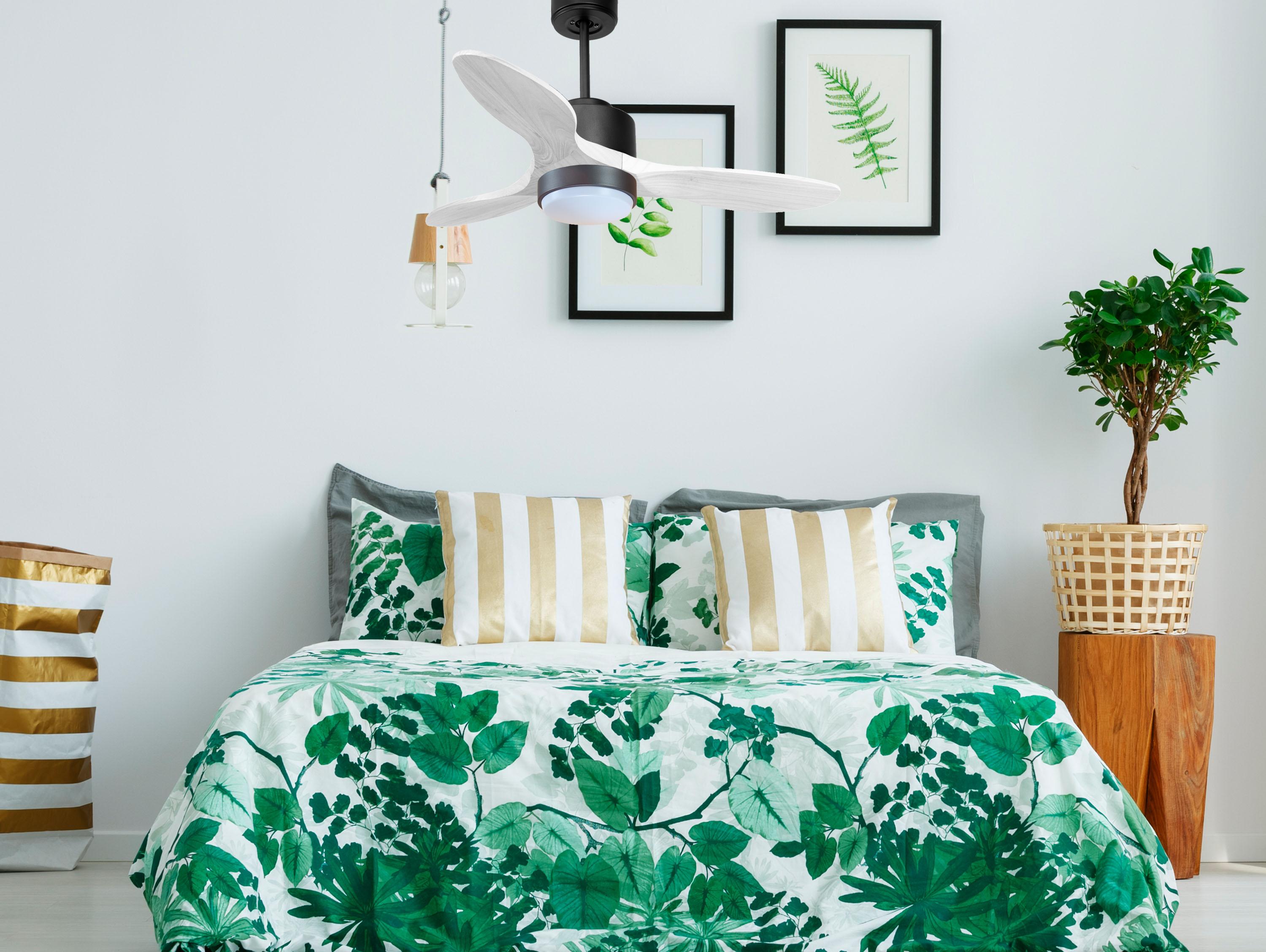 Las palas aerodinámicas de madera balsa maciza otorgan al ventilador una gran ligereza. Han sido artesanalmente tratadas para estar equilibradas y no producir ningún tipo de vibración. Este modelo de 3 aspas acabadas en madera blanca tiene un diámetro de 106 cm
