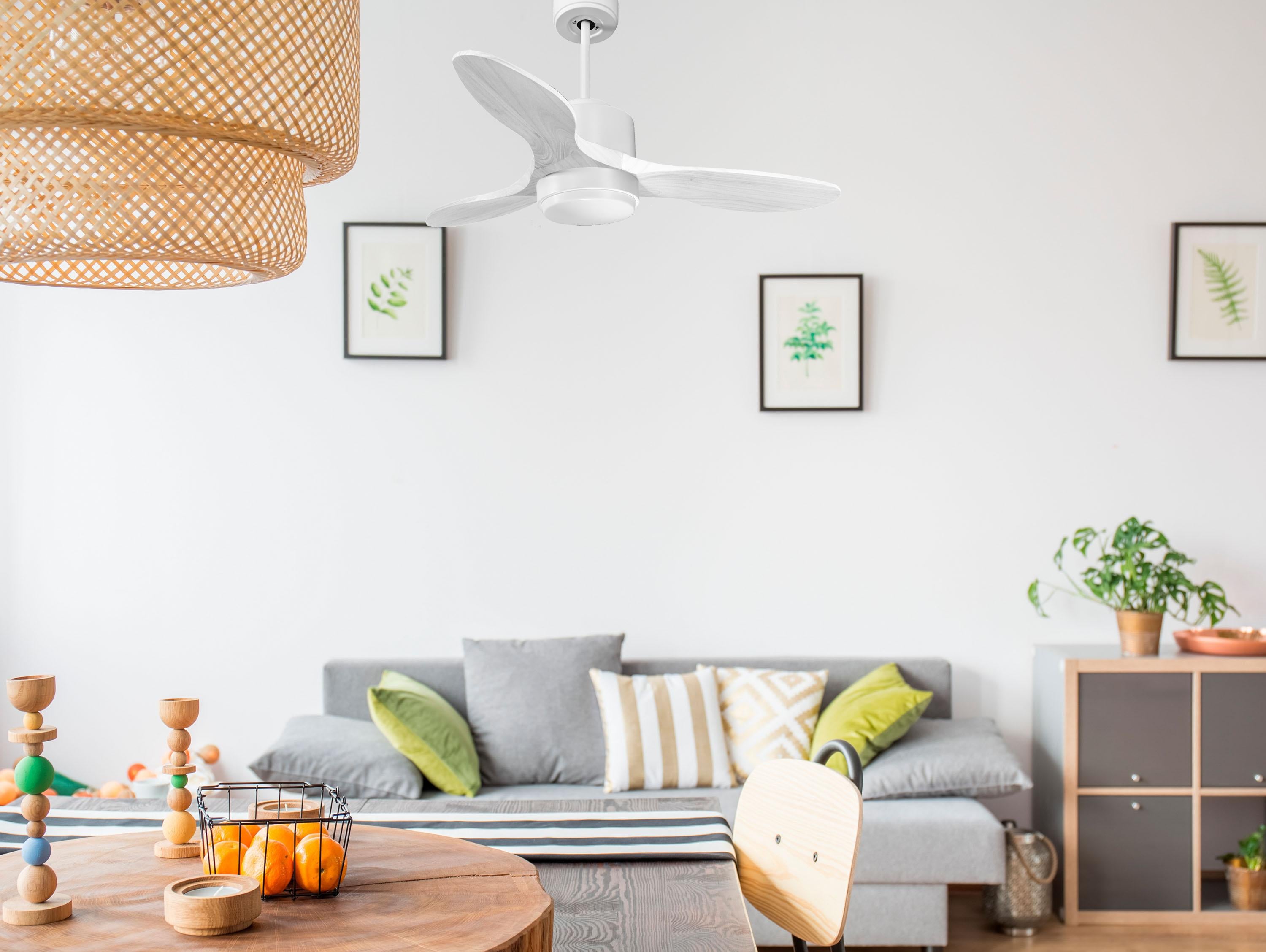 Ventilador de techo Modo Invierno/Verano Termostato Dimable Wifi Motor DC Techos Inclinados Mando a Distancia Luz tres tonos Hypersilence Memoria