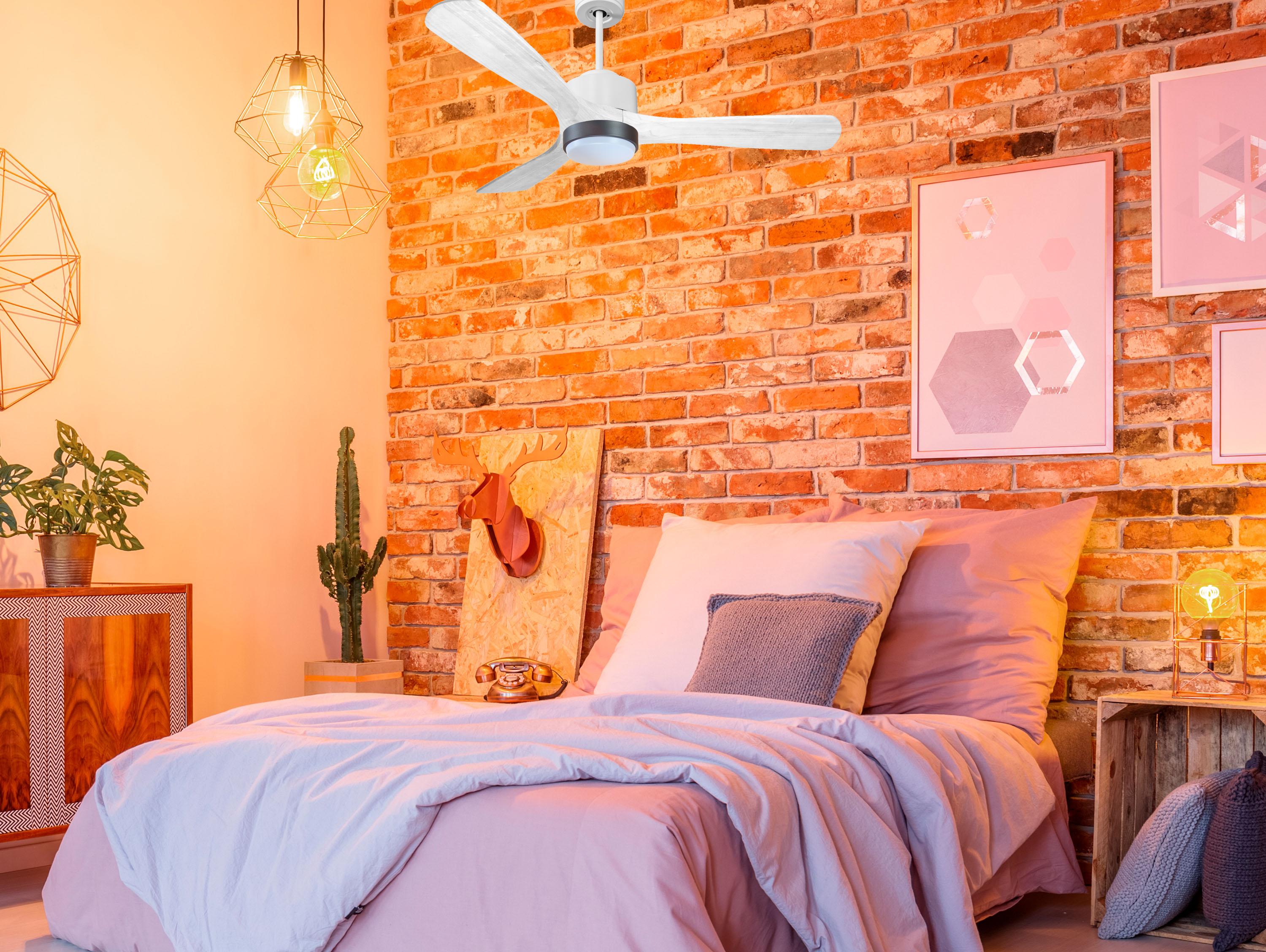 Ventilador de techo Modo Invierno/Verano Termostato Dimable Wifi Motor DC Techos Inclinados Mando a Distancia Luz tres tonos Hypersilence Memoria