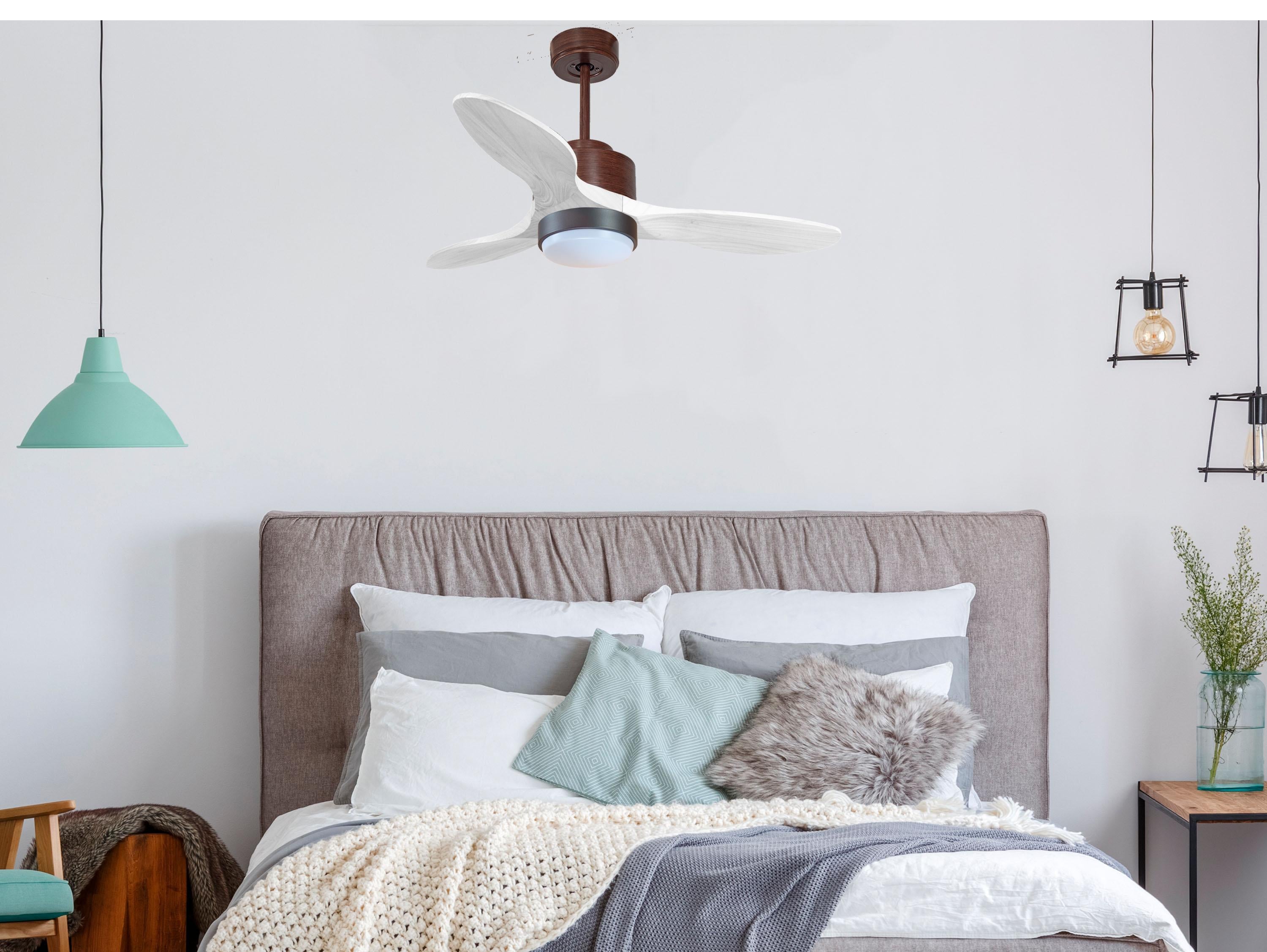 Ventilador de techo Reversible Termostato Dimable Wifi Motor DC Techos Inclinados Mando a Distancia Luz tres tonos Hypersilence Memoria