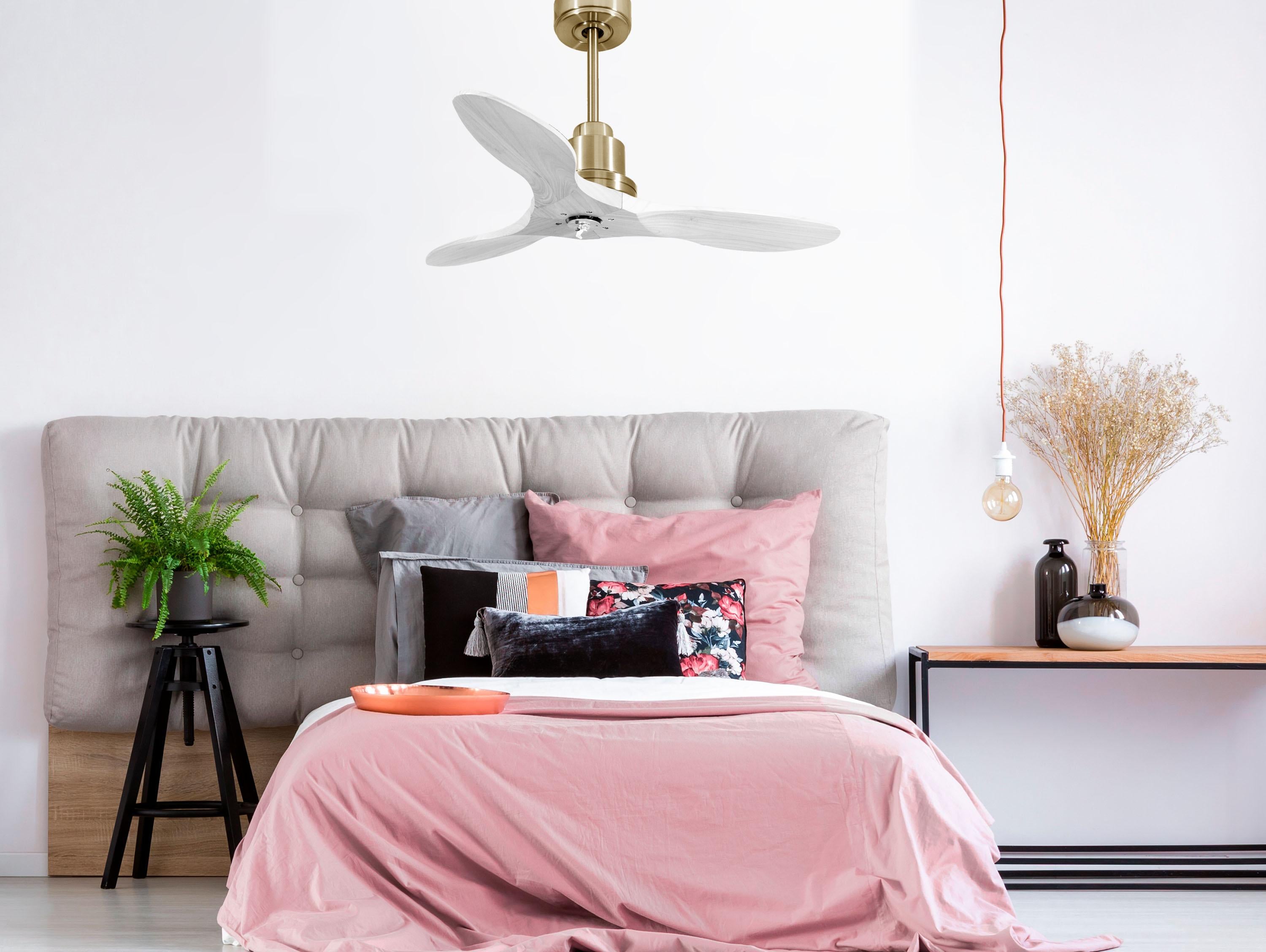 Las palas aerodinámicas de madera balsa maciza otorgan al ventilador una gran ligereza. Han sido artesanalmente tratadas para estar equilibradas y no producir ningún tipo de vibración. Este modelo de 3 aspas acabadas en madera blanca tiene un diámetro de 106 cm