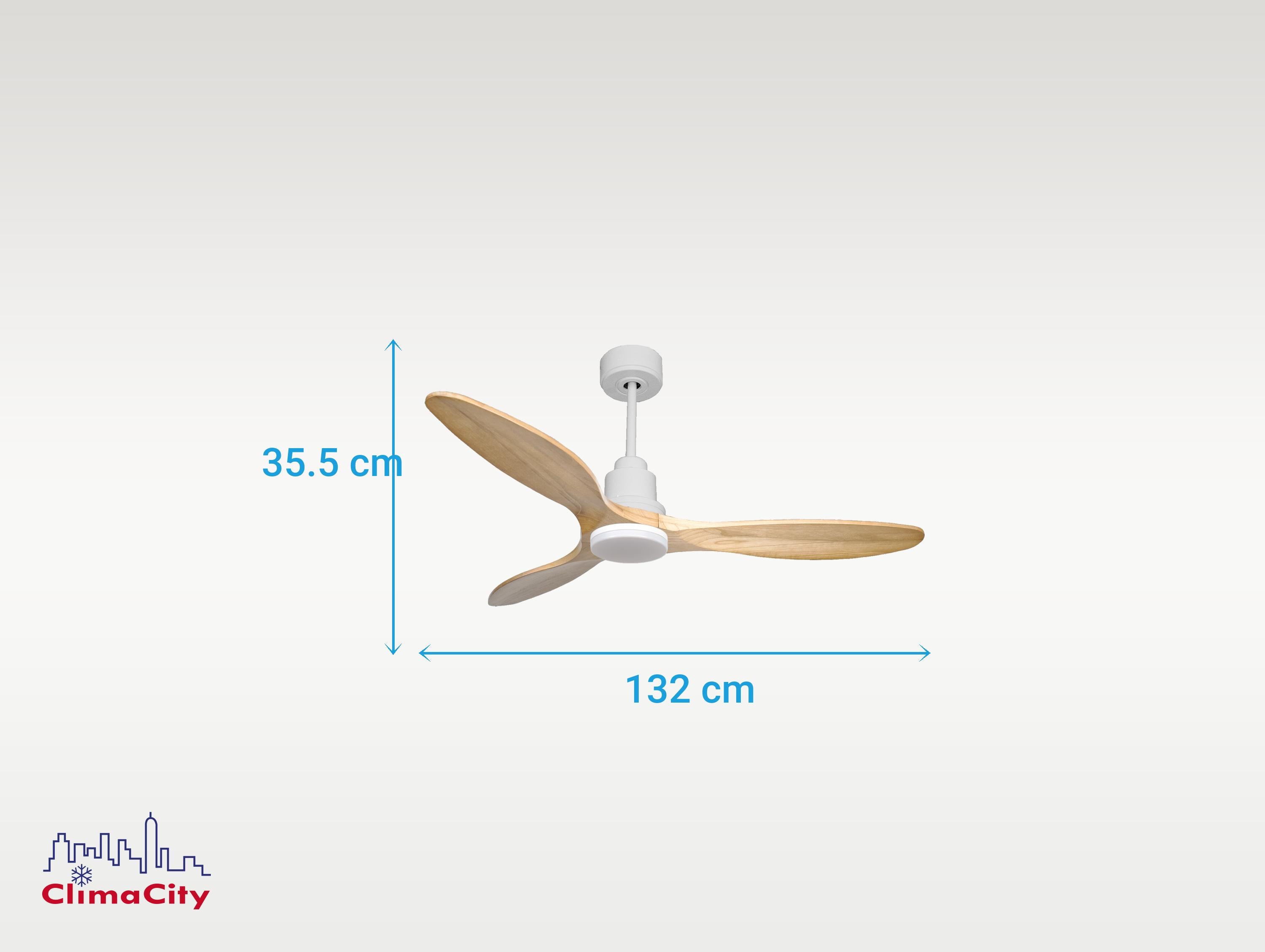 Las palas aerodinámicas de madera balsa maciza otorgan al ventilador una gran ligereza. Han sido artesanalmente tratadas para estar equilibradas y no producir ningún tipo de vibración. Este modelo de 3 aspas acabadas en madera clara tiene un diámetro de 132cm