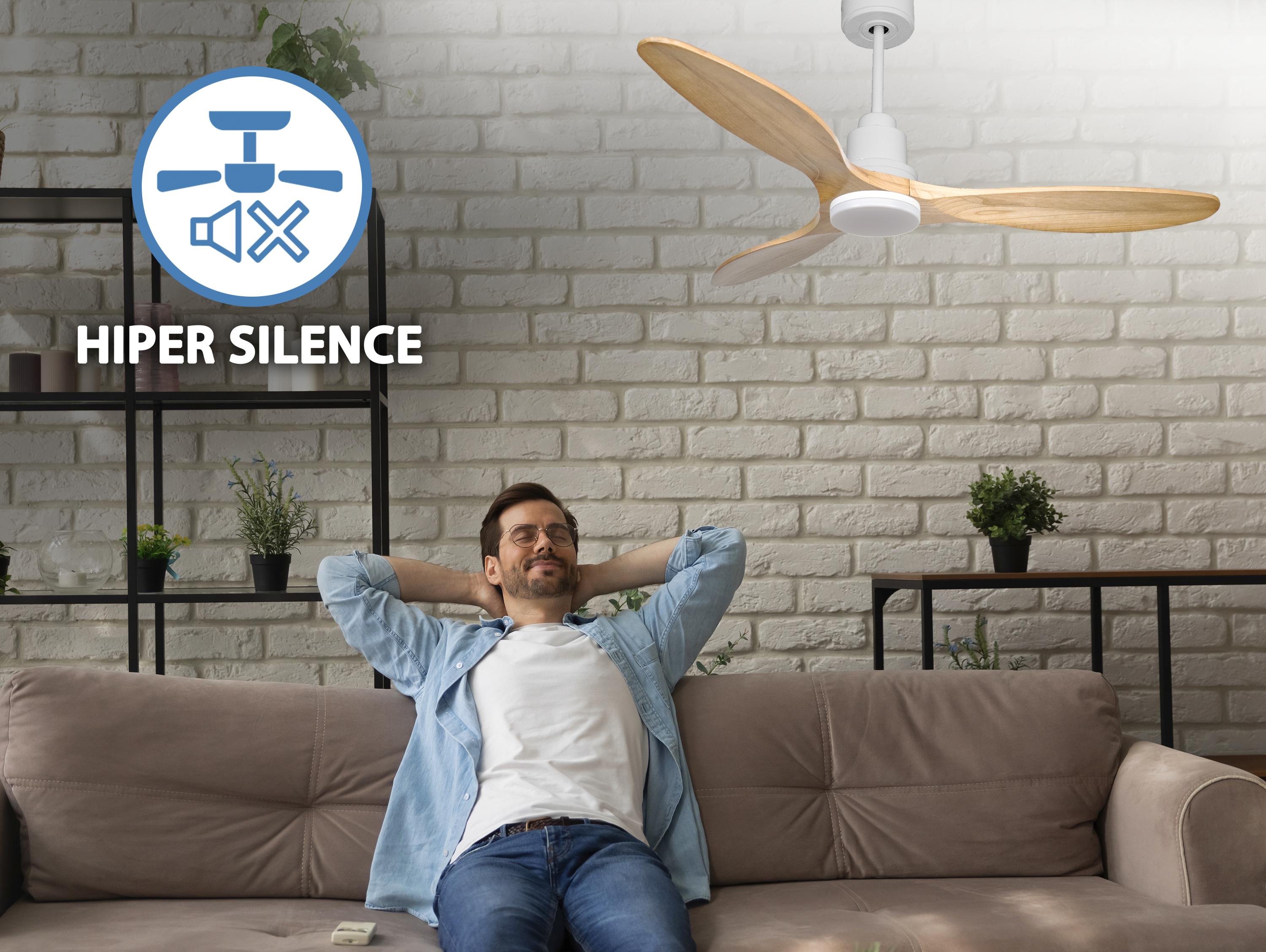 Ademas cuenta con multitud de ventajas adicionales como 6 velocidades programables (fullflow), temporizador (8h) y posibilidad de control remoto mediante mando a distancia, mando de pared y conexión WiFi con la aplicación Tuya Smart, para poder utilizar el ventilador desde cualquier dispositivo móvil. Cuenta también con sistema certificado Hypersilence, una tecnología súper silenciosa a velocidad 3 y que permite utilizar el ventilador por las noches o en momentos de descansos, ofreciendo un rendimiento muy silencioso y con un consumo muy reducido, pudiendo llegar de 3 a 5 W, con aspas de 106 cm.