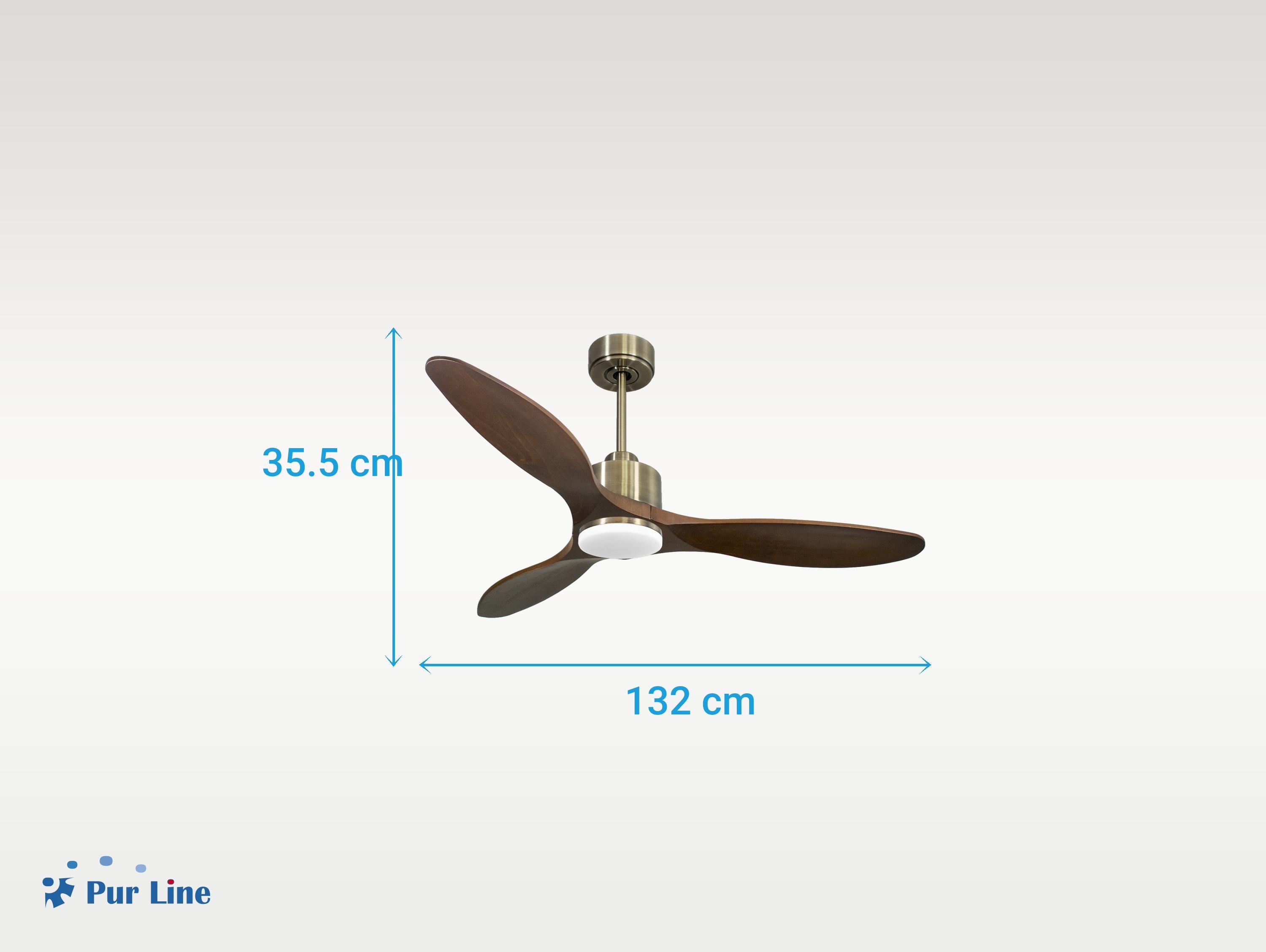 El motor de corriente continua (DC) Klassfan by Purline, es un motor de alta calidad con unas prestaciones de alto nivel. Permite instalaciones en techos de hasta 15º de inclinación y se sirve con dos tijas para que se instale a la altura adecuada (13.5 cm y 25 cm). Permite 2 o 3 aspas (dependiendo del modelo de aspa), pues dispone de una función de auto equilibrado. Todos los motores permite incluir un kit de luz.Es un motor con función Verano/Invierno (Desestratificador de aire), de forma que en invierno podrás invertir el movimiento del motor, para que su giro desplace el aire caliente hacia abajo, actuando como complemento de tu sistema de calefacción y favoreciendo un consumo optimizado con un importante ahorro energético. Además incluye un termostato en su base superior, que te permite programar el ventilador para funcione según la temperatura ambiente.Una ventaja muy destacada, es su sistema FullFlow patentado, que permite calibrar el consumo y la potencia del motor, a las necesidades de las palas elegidas, logrando unos resultados espectaculares en rendimiento energético. Nuestro sistema Fullflow permite una verdadera versatibilidad.Ademas cuenta con multitud de ventajas adicionales como 6 velocidades programables (fullflow), temporizador (8h) y posibilidad de control remoto mediante mando a distancia, mando de pared y conexión WiFi con la aplicación Tuya Smart, para poder utilizar el ventilador desde cualquier dispositivo móvil. Cuenta también con sistema certificado Hypersilence, una tecnología súper silenciosa a velocidad 3 y que permite utilizar el ventilador por las noches o en momentos de descansos, ofreciendo un rendimiento muy silencioso y con un consumo muy reducido, pudiendo llegar de 3 a 5 W, con aspas de 106 cm.También dispone de una función de memoria que guarda la configuración utilizada, tanto de velocidad como de luz, si así está equipado, de forma que cuando se apaga el ventilador se guarda y cuando se vuelve a encender arranca con la misma configuración. Las palas aerodinámicas de madera balsa maciza otorgan al ventilador una gran ligereza. Han sido artesanalmente tratadas para estar equilibradas y no producir ningún tipo de vibración. Este modelo de 3 aspas acabadas en madera oscura tiene un diámetro de 132 cm 132cm El kit de luz optimizará todas las posibilidades de tu ventilador, y su instalación es super sencilla... no más de 1 minuto.
