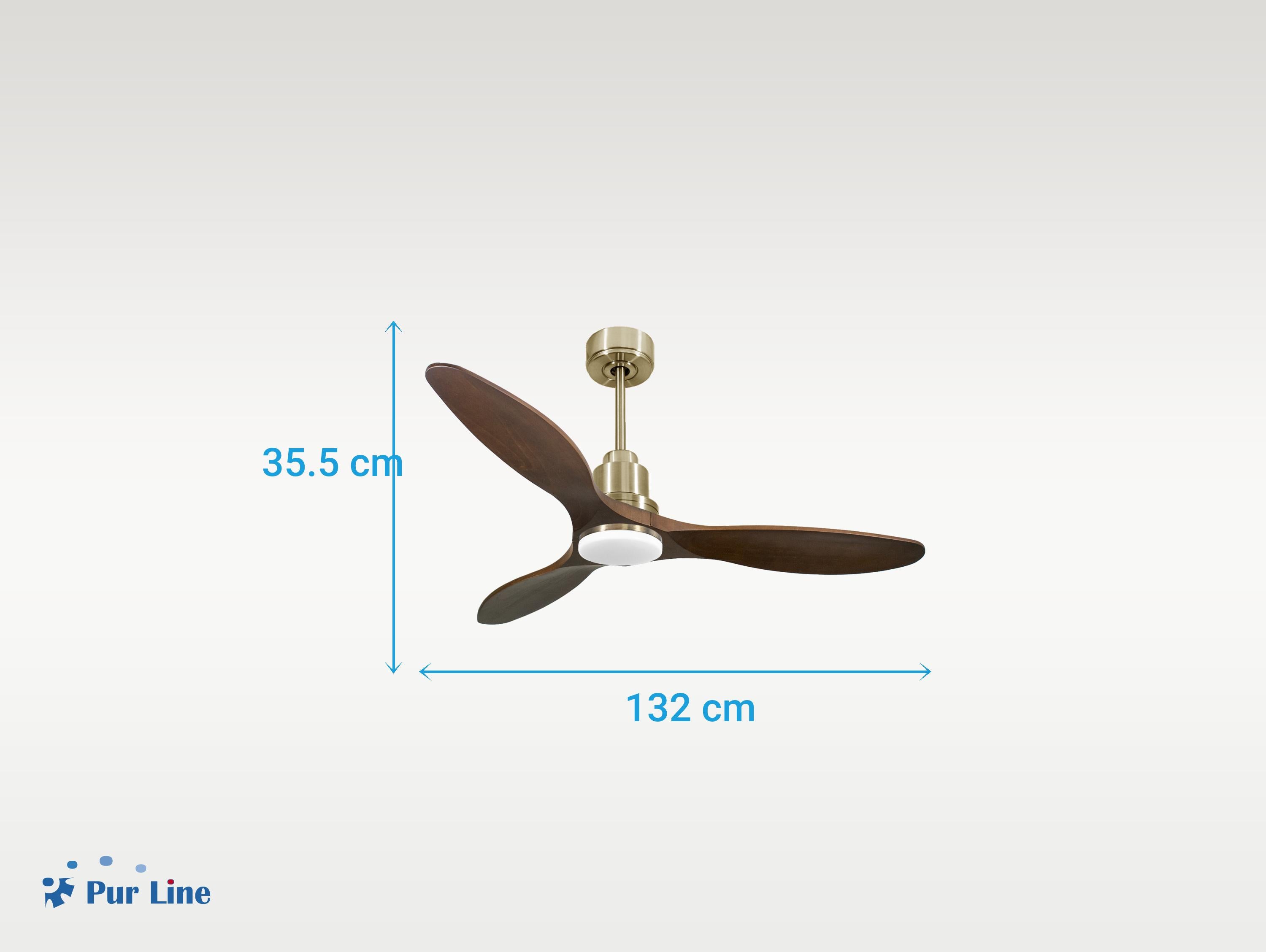 El motor de corriente continua (DC) Klassfan by Purline, es un motor de alta calidad con unas prestaciones de alto nivel. Permite instalaciones en techos de hasta 15º de inclinación y se sirve con dos tijas para que se instale a la altura adecuada (13.5 cm y 25 cm). Permite 2 o 3 aspas (dependiendo del modelo de aspa), pues dispone de una función de auto equilibrado. Todos los motores permite incluir un kit de luz.Es un motor con función Verano/Invierno (Desestratificador de aire), de forma que en invierno podrás invertir el movimiento del motor, para que su giro desplace el aire caliente hacia abajo, actuando como complemento de tu sistema de calefacción y favoreciendo un consumo optimizado con un importante ahorro energético. Además incluye un termostato en su base superior, que te permite programar el ventilador para funcione según la temperatura ambiente.Una ventaja muy destacada, es su sistema FullFlow patentado, que permite calibrar el consumo y la potencia del motor, a las necesidades de las palas elegidas, logrando unos resultados espectaculares en rendimiento energético. Nuestro sistema Fullflow permite una verdadera versatibilidad.Ademas cuenta con multitud de ventajas adicionales como 6 velocidades programables (fullflow), temporizador (8h) y posibilidad de control remoto mediante mando a distancia, mando de pared y conexión WiFi con la aplicación Tuya Smart, para poder utilizar el ventilador desde cualquier dispositivo móvil. Cuenta también con sistema certificado Hypersilence, una tecnología súper silenciosa a velocidad 3 y que permite utilizar el ventilador por las noches o en momentos de descansos, ofreciendo un rendimiento muy silencioso y con un consumo muy reducido, pudiendo llegar de 3 a 5 W, con aspas de 106 cm.También dispone de una función de memoria que guarda la configuración utilizada, tanto de velocidad como de luz, si así está equipado, de forma que cuando se apaga el ventilador se guarda y cuando se vuelve a encender arranca con la misma configuración. Las palas aerodinámicas de madera balsa maciza otorgan al ventilador una gran ligereza. Han sido artesanalmente tratadas para estar equilibradas y no producir ningún tipo de vibración. Este modelo de 3 aspas acabadas en madera oscura tiene un diámetro de 132 cm 132cm El kit de luz optimizará todas las posibilidades de tu ventilador, y su instalación es super sencilla... no más de 1 minuto.