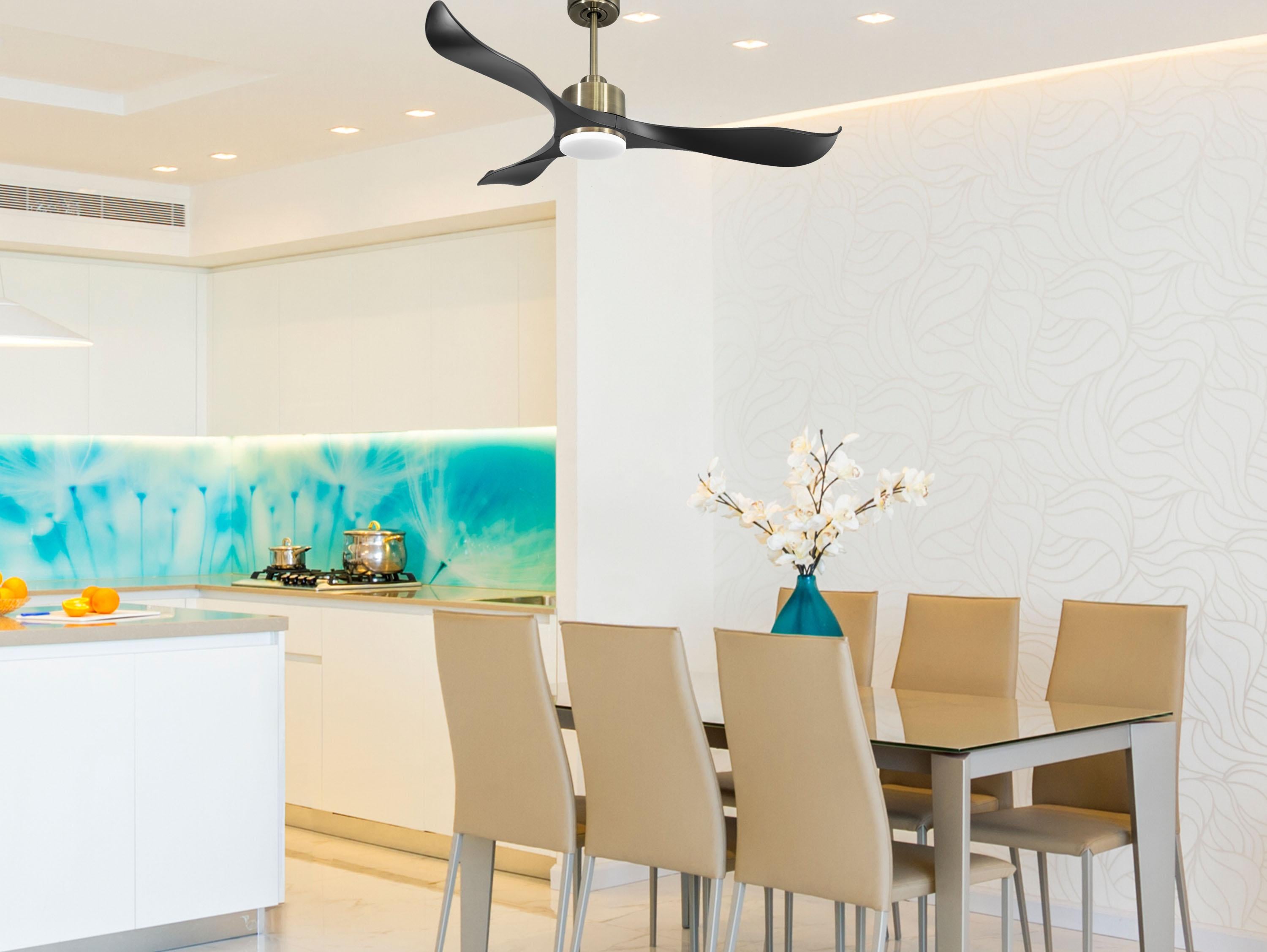 Ventilador de techo Reversible Termostato Dimable Wifi Motor DC Techos Inclinados Mando a Distancia Luz tres tonos Adaptador 2/3 Aspas Hypersilence Memoria