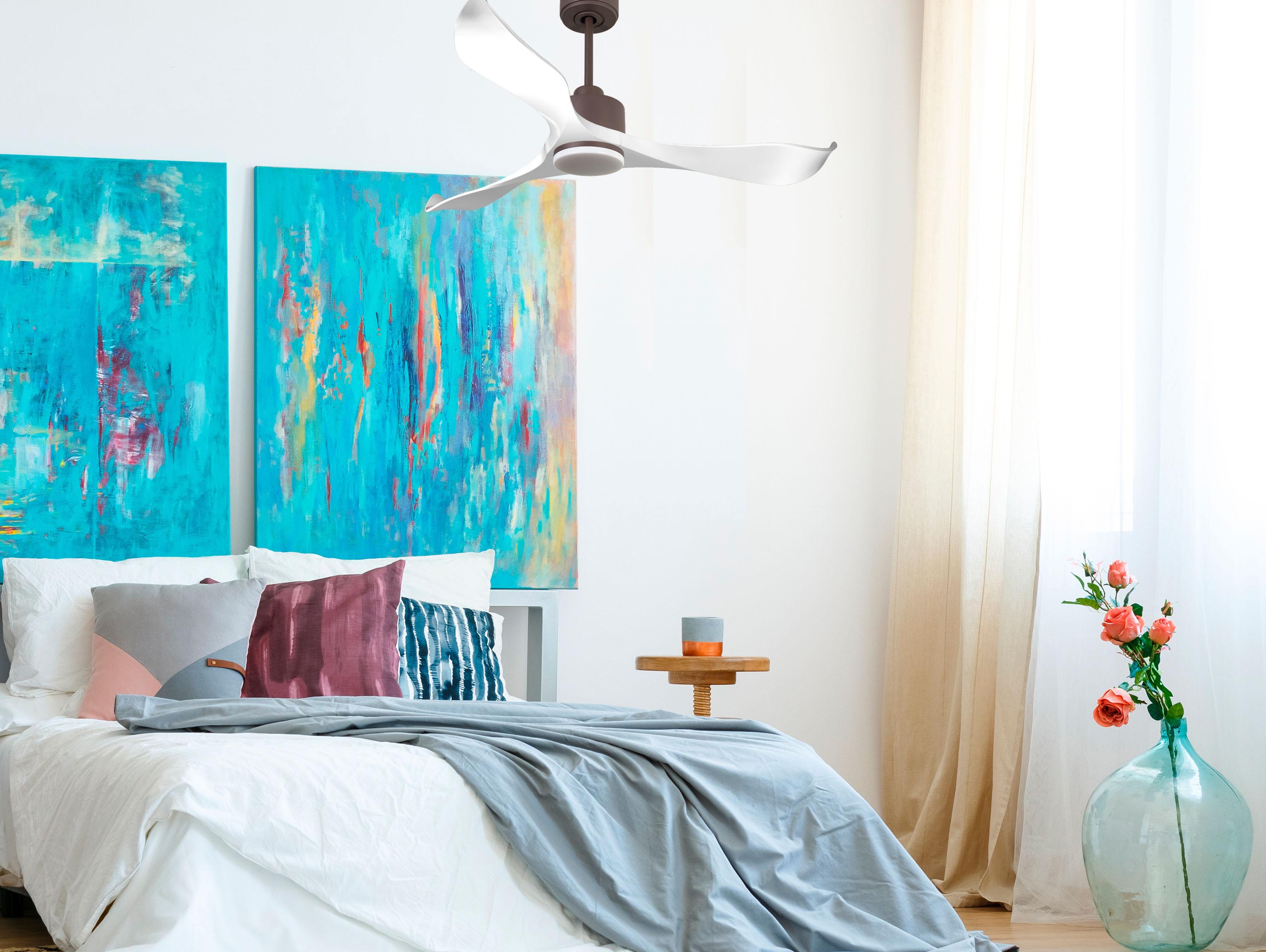 Ventilador de techo Reversible Termostato Dimable Wifi Motor DC Techos Inclinados Mando a Distancia Luz tres tonos Adaptador 2/3 Aspas Hypersilence Memoria