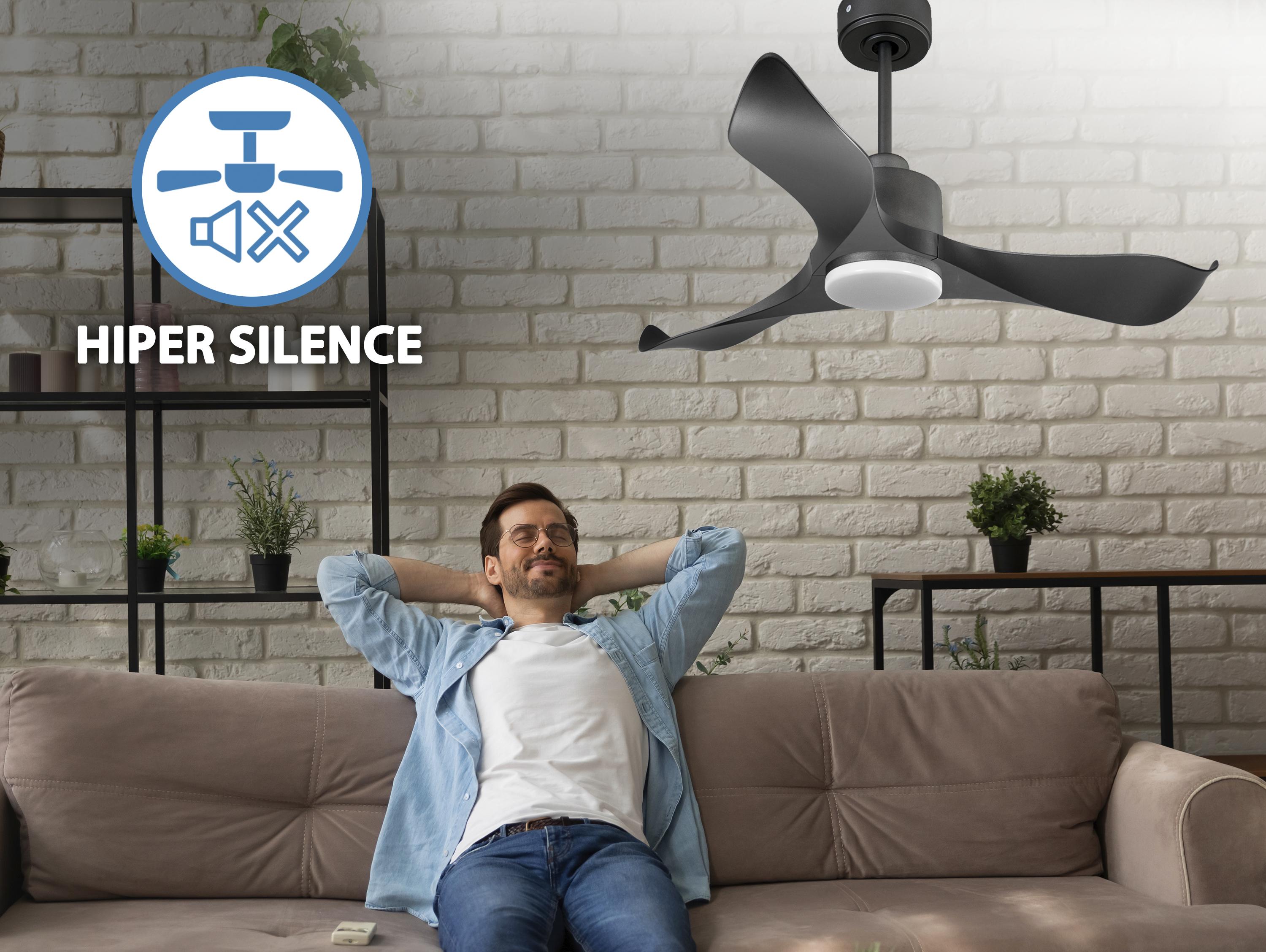 Ademas cuenta con multitud de ventajas adicionales como 6 velocidades programables (fullflow), temporizador (8h) y posibilidad de control remoto mediante mando a distancia, mando de pared y conexión WiFi con la aplicación Tuya Smart, para poder utilizar el ventilador desde cualquier dispositivo móvil. Cuenta también con sistema certificado Hypersilence, una tecnología súper silenciosa a velocidad 3 y que permite utilizar el ventilador por las noches o en momentos de descansos, ofreciendo un rendimiento muy silencioso y con un consumo muy reducido, pudiendo llegar de 3 a 5 W, con aspas de 106 cm.