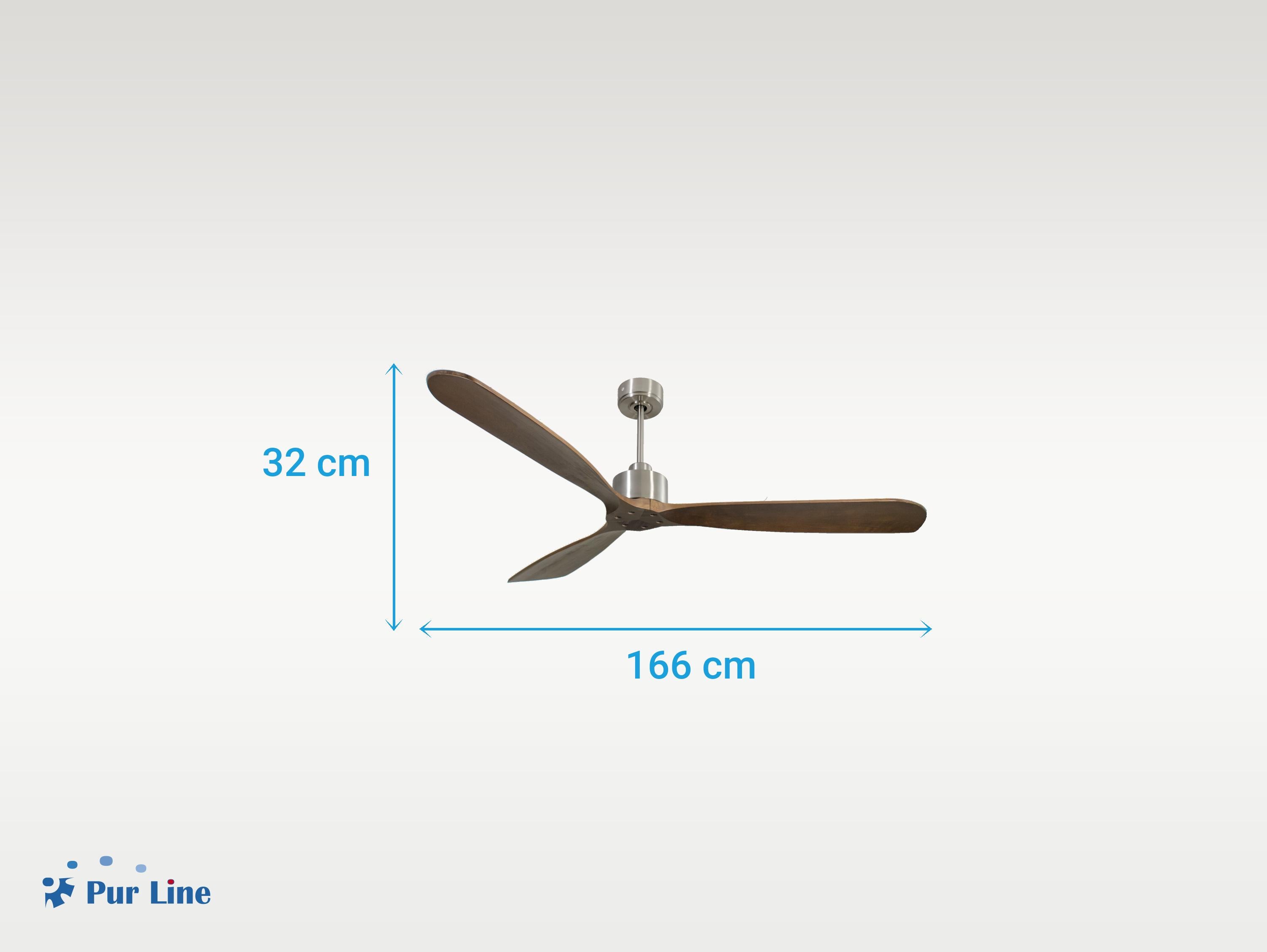 El motor de corriente continua (DC) Klassfan by Purline, es un motor de alta calidad con unas prestaciones de alto nivel. Permite instalaciones en techos de hasta 15º de inclinación y se sirve con dos tijas para que se instale a la altura adecuada (13.5 cm y 25 cm). Permite 2 o 3 aspas (dependiendo del modelo de aspa), pues dispone de una función de auto equilibrado. Todos los motores permite incluir un kit de luz.Es un motor con función Verano/Invierno (Desestratificador de aire), de forma que en invierno podrás invertir el movimiento del motor, para que su giro desplace el aire caliente hacia abajo, actuando como complemento de tu sistema de calefacción y favoreciendo un consumo optimizado con un importante ahorro energético. Además incluye un termostato en su base superior, que te permite programar el ventilador para funcione según la temperatura ambiente.Una ventaja muy destacada, es su sistema FullFlow patentado, que permite calibrar el consumo y la potencia del motor, a las necesidades de las palas elegidas, logrando unos resultados espectaculares en rendimiento energético. Nuestro sistema Fullflow permite una verdadera versatibilidad.Ademas cuenta con multitud de ventajas adicionales como 6 velocidades programables (fullflow), temporizador (8h) y posibilidad de control remoto mediante mando a distancia, mando de pared y conexión WiFi con la aplicación Tuya Smart, para poder utilizar el ventilador desde cualquier dispositivo móvil. Cuenta también con sistema certificado Hypersilence, una tecnología súper silenciosa a velocidad 3 y que permite utilizar el ventilador por las noches o en momentos de descansos, ofreciendo un rendimiento muy silencioso y con un consumo muy reducido, pudiendo llegar de 3 a 5 W, con aspas de 106 cm.También dispone de una función de memoria que guarda la configuración utilizada, tanto de velocidad como de luz, si así está equipado, de forma que cuando se apaga el ventilador se guarda y cuando se vuelve a encender arranca con la misma configuración. Las palas aerodinámicas de madera balsa maciza otorgan al ventilador una gran ligereza. Han sido artesanalmente tratadas para estar equilibradas y no producir ningún tipo de vibración. Este modelo de 3 aspas acabadas en madera oscura tiene un diámetro de 166