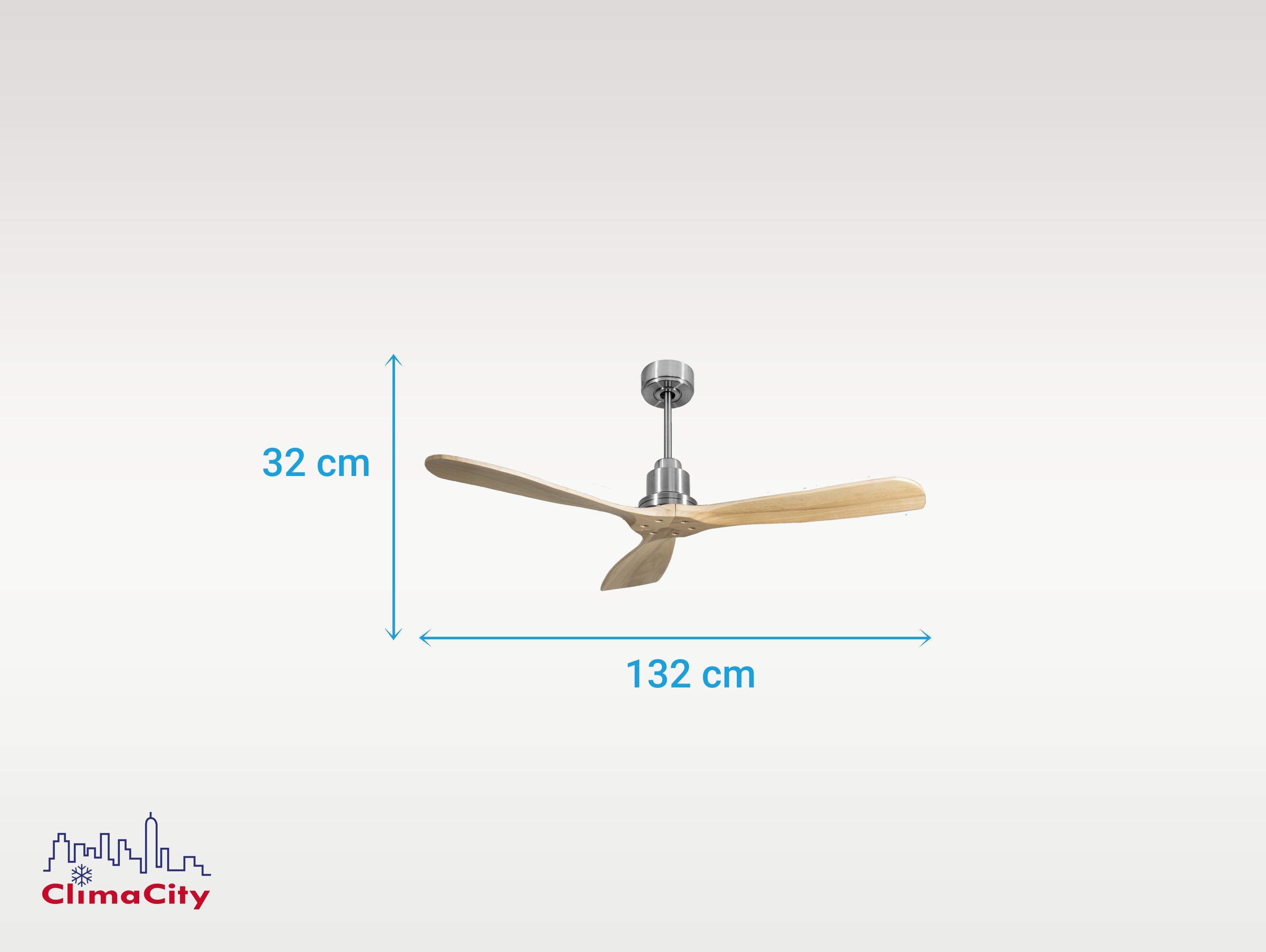 También dispone de una función de memoria que guarda la configuración utilizada, tanto de velocidad como de luz, si así está equipado, de forma que cuando se apaga el ventilador se guarda y cuando se vuelve a encender arranca con la misma configuración. Las palas aerodinámicas de madera balsa maciza otorgan al ventilador una gran ligereza. Han sido artesanalmente tratadas para estar equilibradas y no producir ningún tipo de vibración. Este modelo de 3 aspas acabadas en madera clara tiene un diámetro de 132 cm