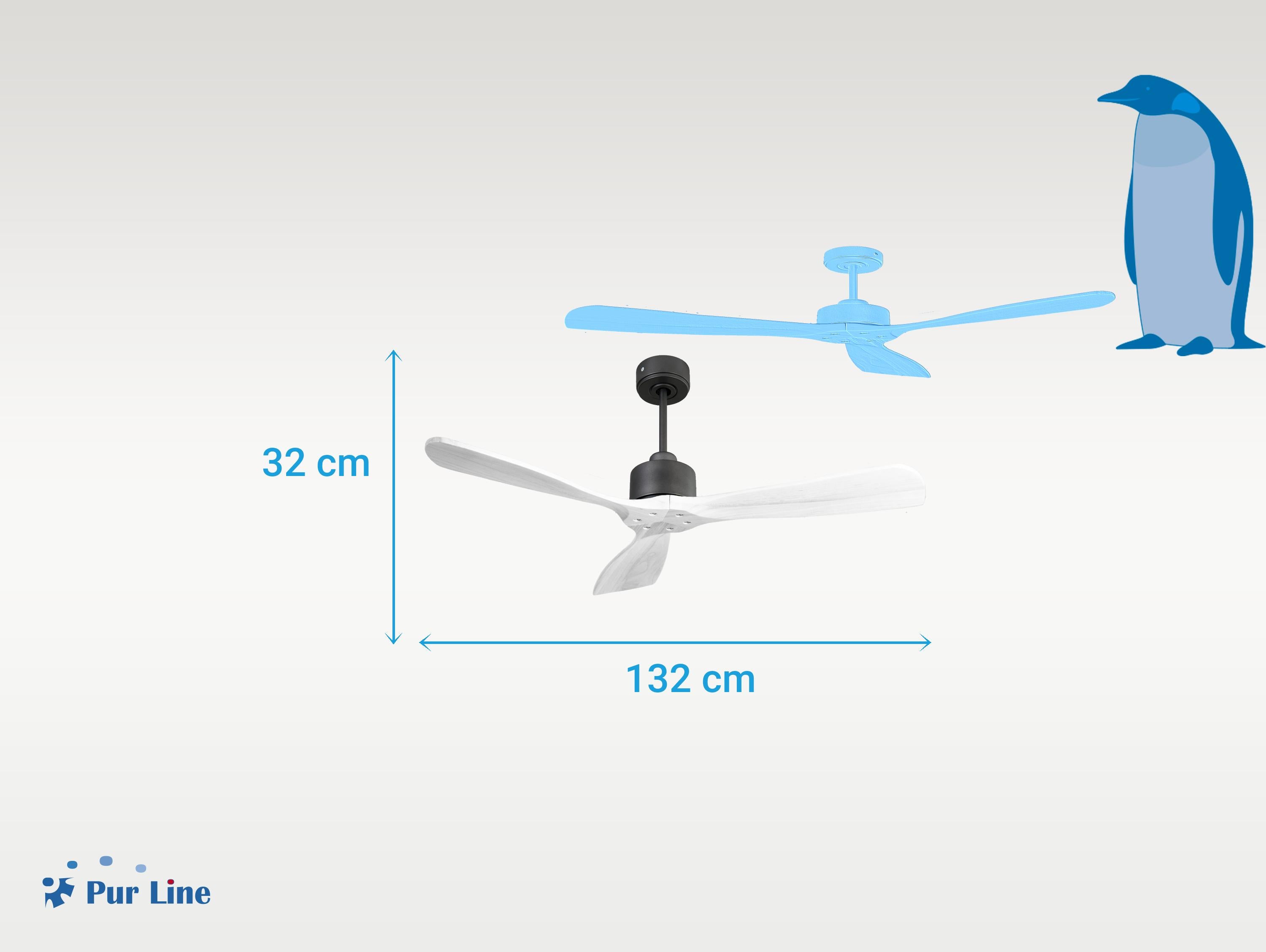 El motor de corriente continua (DC) Klassfan by Purline, es un motor de alta calidad con unas prestaciones de alto nivel. Permite instalaciones en techos de hasta 15º de inclinación y se sirve con dos tijas para que se instale a la altura adecuada (13.5 cm y 25 cm). Permite 2 o 3 aspas (dependiendo del modelo de aspa), pues dispone de una función de auto equilibrado. Todos los motores permite incluir un kit de luz.Es un motor con función Verano/Invierno (Desestratificador de aire), de forma que en invierno podrás invertir el movimiento del motor, para que su giro desplace el aire caliente hacia abajo, actuando como complemento de tu sistema de calefacción y favoreciendo un consumo optimizado con un importante ahorro energético. Además incluye un termostato en su base superior, que te permite programar el ventilador para funcione según la temperatura ambiente.Una ventaja muy destacada, es su sistema FullFlow patentado, que permite calibrar el consumo y la potencia del motor, a las necesidades de las palas elegidas, logrando unos resultados espectaculares en rendimiento energético. Nuestro sistema Fullflow permite una verdadera versatibilidad.Ademas cuenta con multitud de ventajas adicionales como 6 velocidades programables (fullflow), temporizador (8h) y posibilidad de control remoto mediante mando a distancia, mando de pared y conexión WiFi con la aplicación Tuya Smart, para poder utilizar el ventilador desde cualquier dispositivo móvil. Cuenta también con sistema certificado Hypersilence, una tecnología súper silenciosa a velocidad 3 y que permite utilizar el ventilador por las noches o en momentos de descansos, ofreciendo un rendimiento muy silencioso y con un consumo muy reducido, pudiendo llegar de 3 a 5 W, con aspas de 106 cm.También dispone de una función de memoria que guarda la configuración utilizada, tanto de velocidad como de luz, si así está equipado, de forma que cuando se apaga el ventilador se guarda y cuando se vuelve a encender arranca con la misma configuración. Las palas aerodinámicas de madera balsa maciza otorgan al ventilador una gran ligereza. Han sido artesanalmente tratadas para estar equilibradas y no producir ningún tipo de vibración. Este modelo de 3 aspas acabadas en madera blanca tiene un diámetro de 132 cm