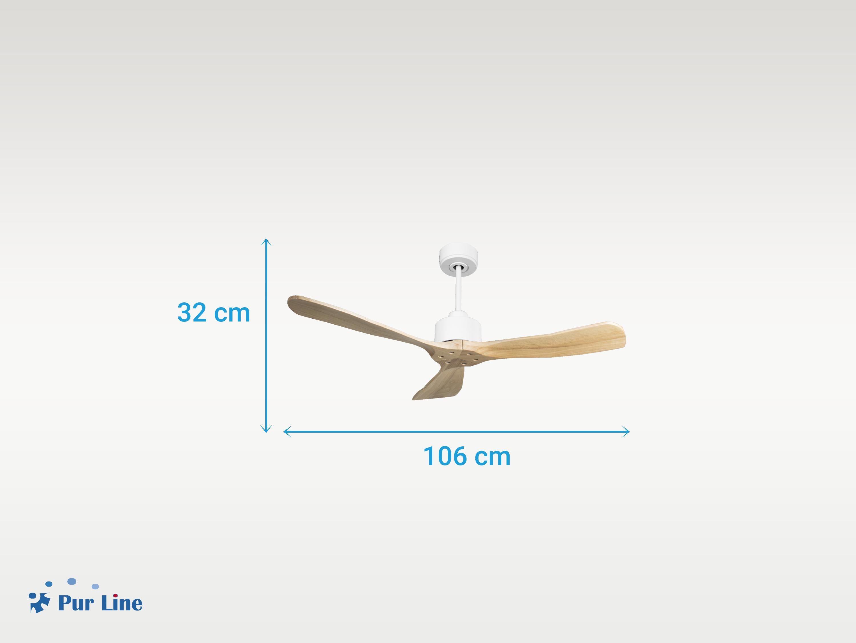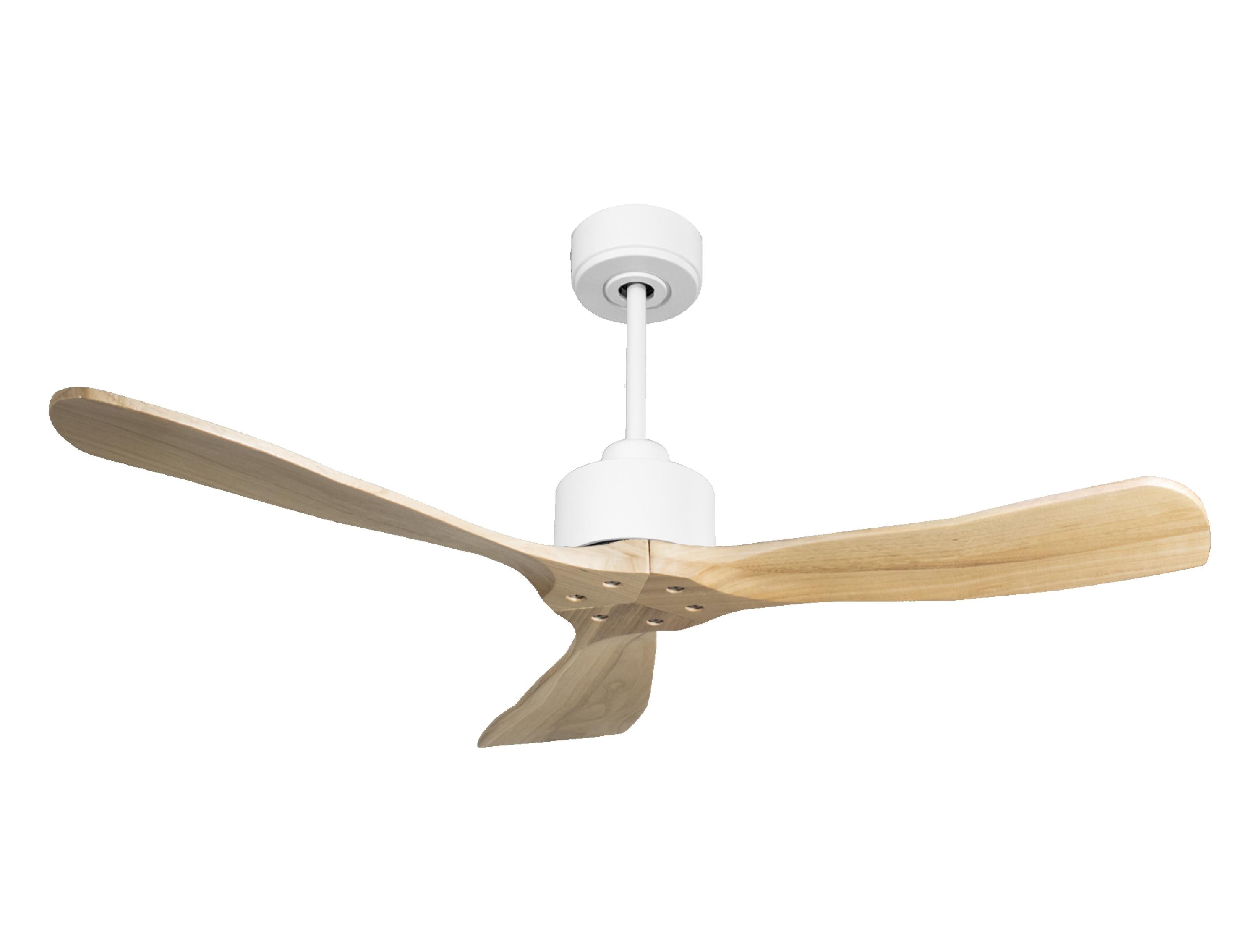 Las palas aerodinámicas de madera balsa maciza otorgan al ventilador una gran ligereza. Han sido artesanalmente tratadas para estar equilibradas y no producir ningún tipo de vibración. Este modelo de 3 aspas acabadas en madera clara tiene un diámetro de 106 cm
