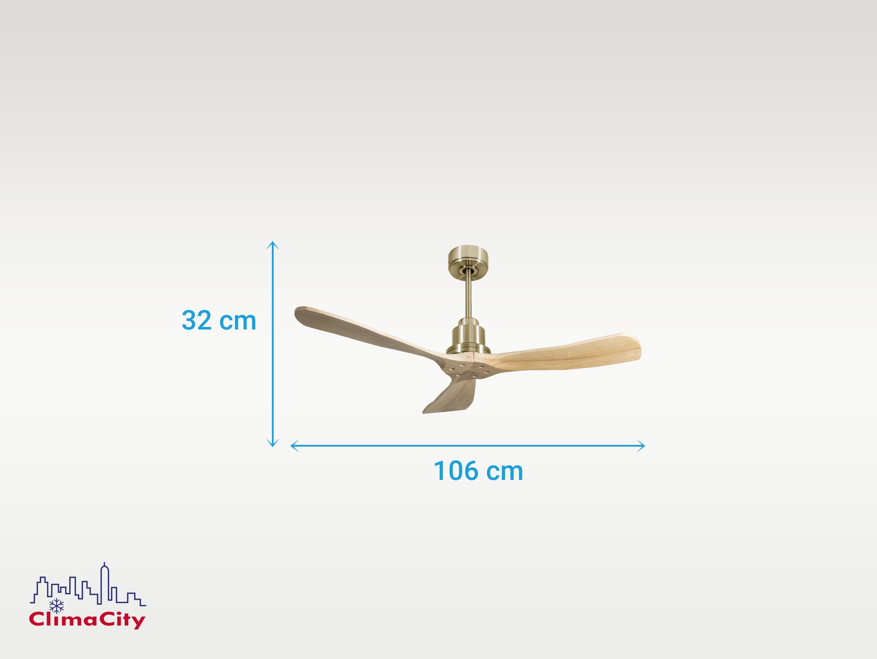 También dispone de una función de memoria que guarda la configuración utilizada, tanto de velocidad como de luz, si así está equipado, de forma que cuando se apaga el ventilador se guarda y cuando se vuelve a encender arranca con la misma configuración. Las palas aerodinámicas de madera balsa maciza otorgan al ventilador una gran ligereza. Han sido artesanalmente tratadas para estar equilibradas y no producir ningún tipo de vibración. Este modelo de 3 aspas acabadas en madera clara tiene un diámetro de 106 cm