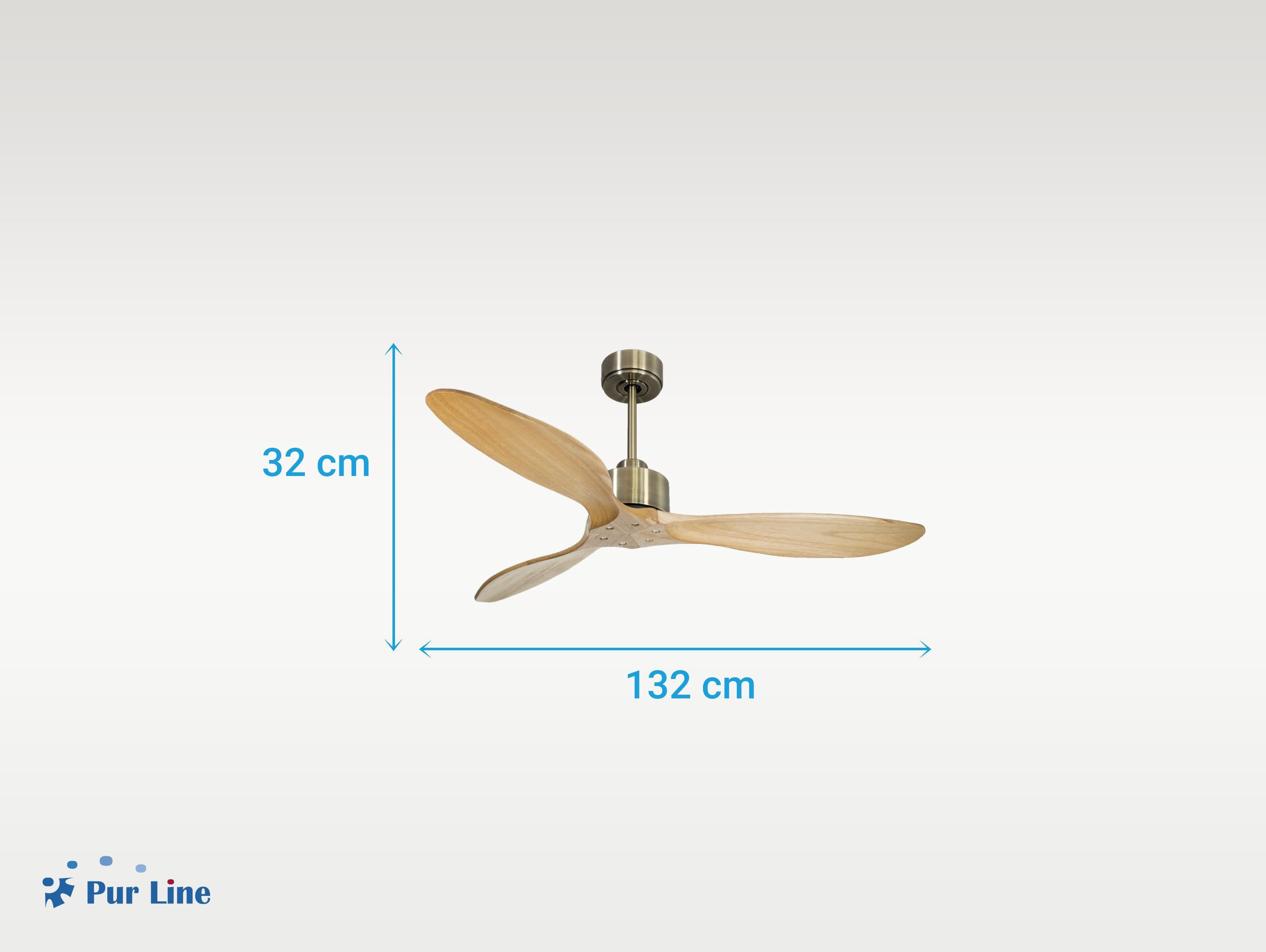 El motor de corriente continua (DC) Klassfan by Purline, es un motor de alta calidad con unas prestaciones de alto nivel. Permite instalaciones en techos de hasta 15º de inclinación y se sirve con dos tijas para que se instale a la altura adecuada (13.5 cm y 25 cm). Permite 2 o 3 aspas (dependiendo del modelo de aspa), pues dispone de una función de auto equilibrado. Todos los motores permite incluir un kit de luz.Es un motor con función Verano/Invierno (Desestratificador de aire), de forma que en invierno podrás invertir el movimiento del motor, para que su giro desplace el aire caliente hacia abajo, actuando como complemento de tu sistema de calefacción y favoreciendo un consumo optimizado con un importante ahorro energético. Además incluye un termostato en su base superior, que te permite programar el ventilador para funcione según la temperatura ambiente.Una ventaja muy destacada, es su sistema FullFlow patentado, que permite calibrar el consumo y la potencia del motor, a las necesidades de las palas elegidas, logrando unos resultados espectaculares en rendimiento energético. Nuestro sistema Fullflow permite una verdadera versatibilidad.Ademas cuenta con multitud de ventajas adicionales como 6 velocidades programables (fullflow), temporizador (8h) y posibilidad de control remoto mediante mando a distancia, mando de pared y conexión WiFi con la aplicación Tuya Smart, para poder utilizar el ventilador desde cualquier dispositivo móvil. Cuenta también con sistema certificado Hypersilence, una tecnología súper silenciosa a velocidad 3 y que permite utilizar el ventilador por las noches o en momentos de descansos, ofreciendo un rendimiento muy silencioso y con un consumo muy reducido, pudiendo llegar de 3 a 5 W, con aspas de 106 cm.También dispone de una función de memoria que guarda la configuración utilizada, tanto de velocidad como de luz, si así está equipado, de forma que cuando se apaga el ventilador se guarda y cuando se vuelve a encender arranca con la misma configuración.Las palas aerodinámicas de madera balsa maciza otorgan al ventilador una gran ligereza. Han sido artesanalmente tratadas para estar equilibradas y no producir ningún tipo de vibración. Este modelo de 3 aspas acabadas en madera clara tiene un diámetro de 132 cm.