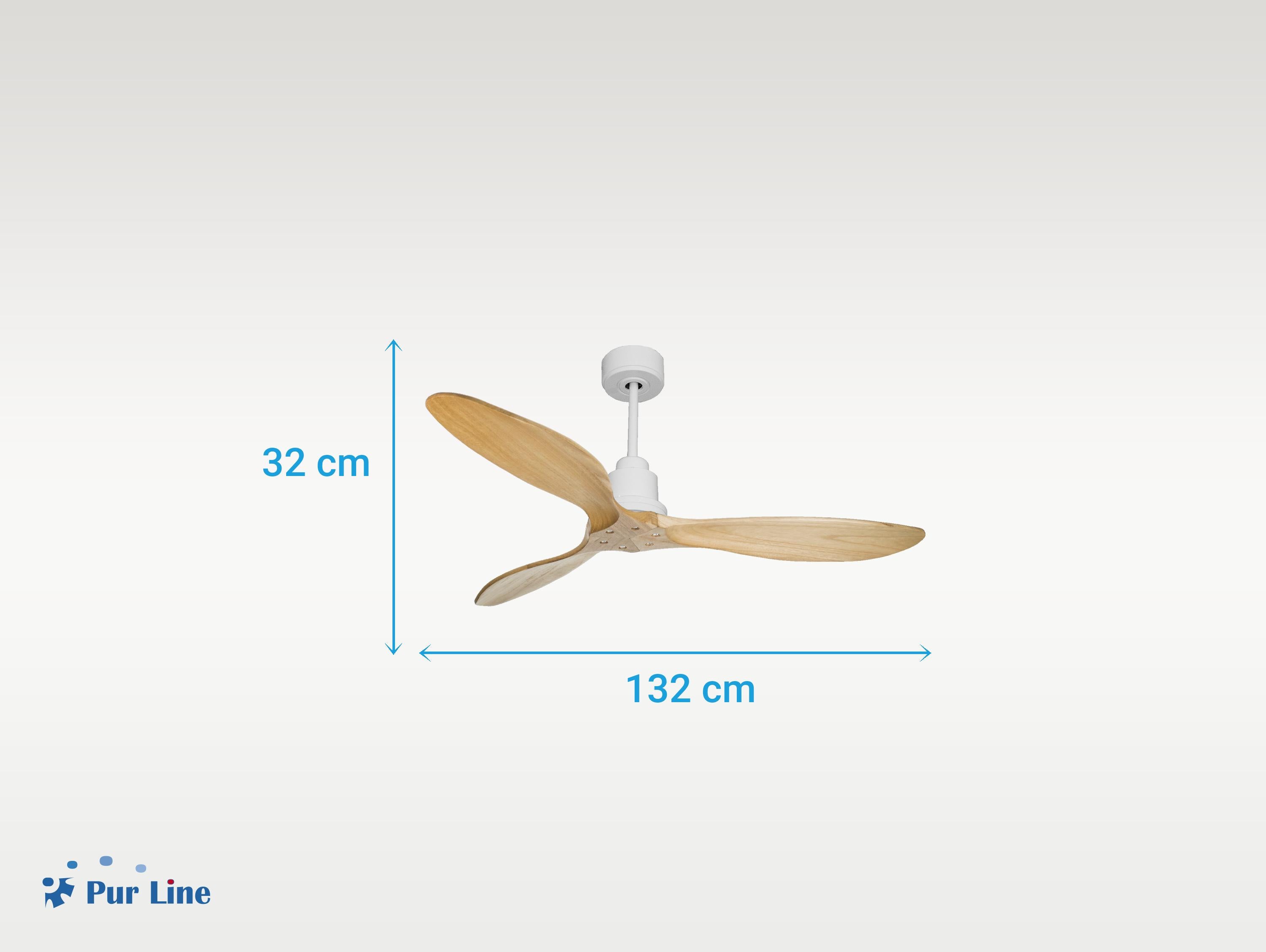También dispone de una función de memoria que guarda la configuración utilizada, tanto de velocidad como de luz, si así está equipado, de forma que cuando se apaga el ventilador se guarda y cuando se vuelve a encender arranca con la misma configuración. Las palas aerodinámicas de madera balsa maciza otorgan al ventilador una gran ligereza. Han sido artesanalmente tratadas para estar equilibradas y no producir ningún tipo de vibración. Este modelo de 3 aspas acabadas en madera clara tiene un diámetro de 132 cm.