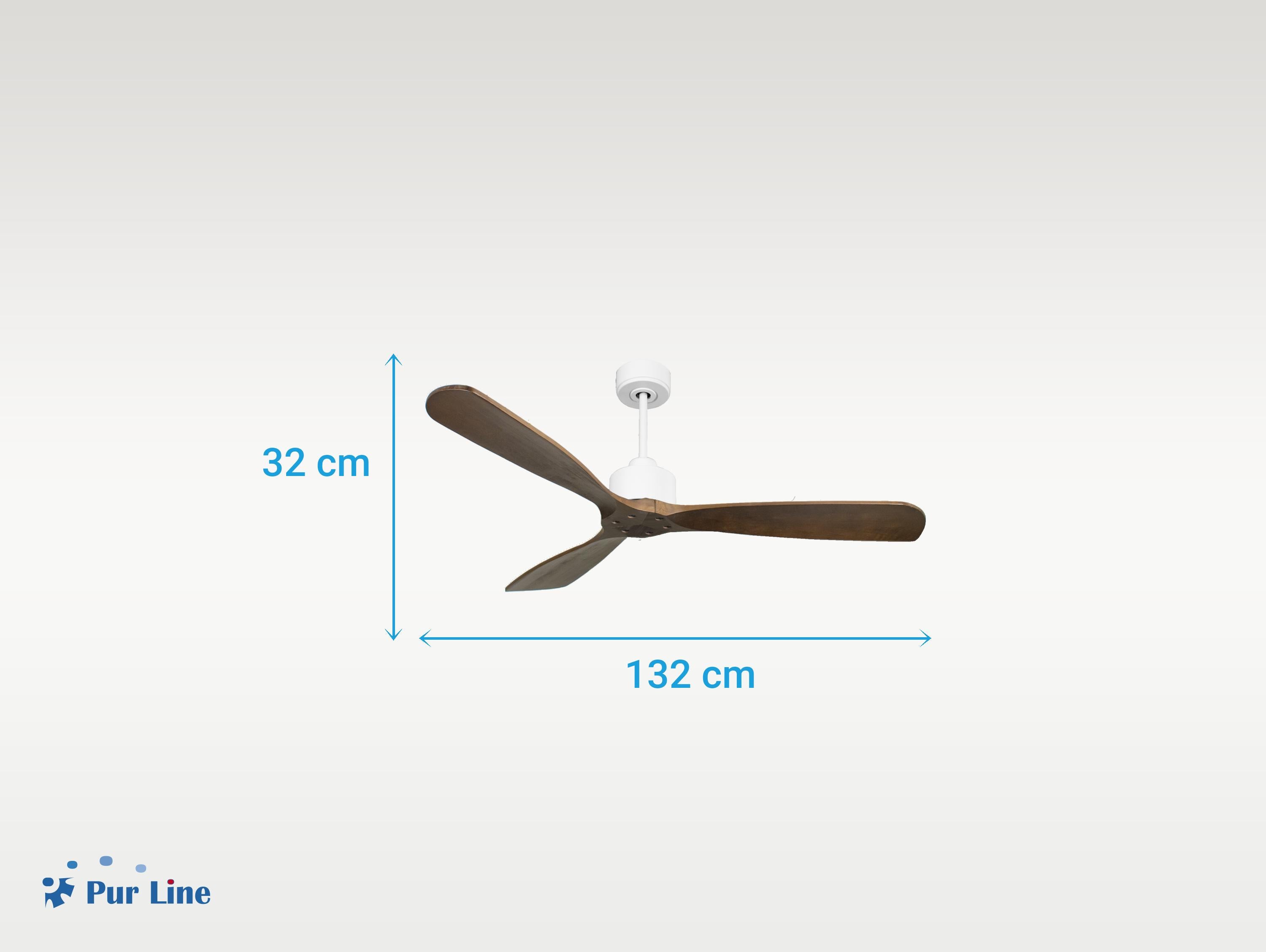 El motor de corriente continua (DC) Klassfan by Purline, es un motor de alta calidad con unas prestaciones de alto nivel. Permite instalaciones en techos de hasta 15º de inclinación y se sirve con dos tijas para que se instale a la altura adecuada (13.5 cm y 25 cm). Permite 2 o 3 aspas (dependiendo del modelo de aspa), pues dispone de una función de auto equilibrado. Todos los motores permite incluir un kit de luz.Es un motor con función Verano/Invierno (Desestratificador de aire), de forma que en invierno podrás invertir el movimiento del motor, para que su giro desplace el aire caliente hacia abajo, actuando como complemento de tu sistema de calefacción y favoreciendo un consumo optimizado con un importante ahorro energético. Además incluye un termostato en su base superior, que te permite programar el ventilador para funcione según la temperatura ambiente.Una ventaja muy destacada, es su sistema FullFlow patentado, que permite calibrar el consumo y la potencia del motor, a las necesidades de las palas elegidas, logrando unos resultados espectaculares en rendimiento energético. Nuestro sistema Fullflow permite una verdadera versatibilidad.Ademas cuenta con multitud de ventajas adicionales como 6 velocidades programables (fullflow), temporizador (8h) y posibilidad de control remoto mediante mando a distancia, mando de pared y conexión WiFi con la aplicación Tuya Smart, para poder utilizar el ventilador desde cualquier dispositivo móvil. Cuenta también con sistema certificado Hypersilence, una tecnología súper silenciosa a velocidad 3 y que permite utilizar el ventilador por las noches o en momentos de descansos, ofreciendo un rendimiento muy silencioso y con un consumo muy reducido, pudiendo llegar de 3 a 5 W, con aspas de 106 cm.También dispone de una función de memoria que guarda la configuración utilizada, tanto de velocidad como de luz, si así está equipado, de forma que cuando se apaga el ventilador se guarda y cuando se vuelve a encender arranca con la misma configuración. Las palas aerodinámicas de madera balsa maciza otorgan al ventilador una gran ligereza. Han sido artesanalmente tratadas para estar equilibradas y no producir ningún tipo de vibración. Este modelo de 3 aspas acabadas en madera oscura tiene un diámetro de 132 cm
