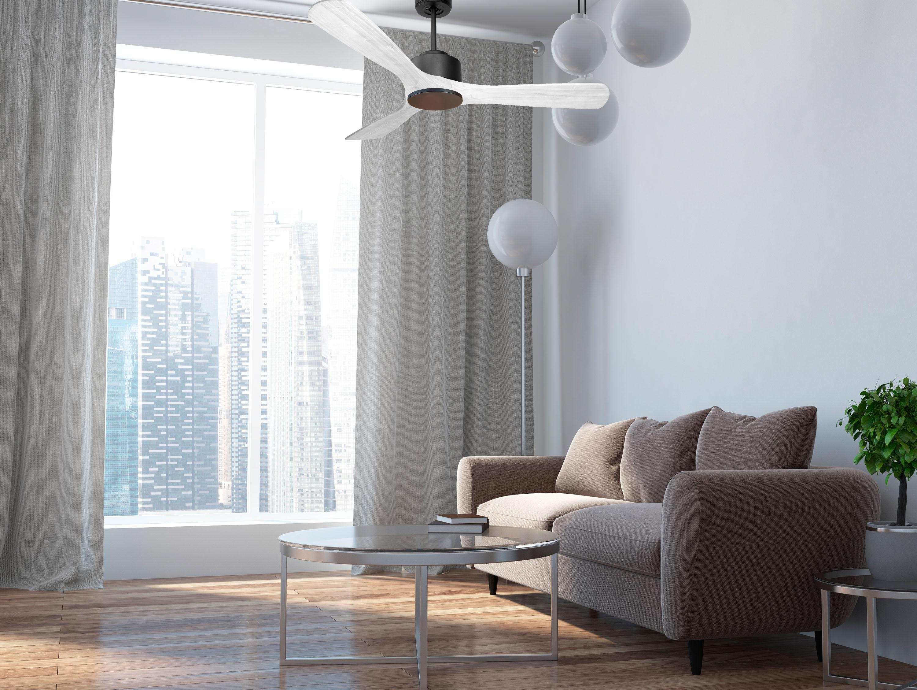 El motor de corriente continua (DC) Klassfan by Purline, es un motor de alta calidad con unas prestaciones de alto nivel. Permite instalaciones en techos de hasta 15º de inclinación y se sirve con dos tijas para que se instale a la altura adecuada (13.5 cm y 25 cm). Permite 2 o 3 aspas (dependiendo del modelo de aspa), pues dispone de una función de auto equilibrado. Todos los motores permite incluir un kit de luz.Es un motor con función Verano/Invierno (Desestratificador de aire), de forma que en invierno podrás invertir el movimiento del motor, para que su giro desplace el aire caliente hacia abajo, actuando como complemento de tu sistema de calefacción y favoreciendo un consumo optimizado con un importante ahorro energético. Además incluye un termostato en su base superior, que te permite programar el ventilador para funcione según la temperatura ambiente.Una ventaja muy destacada, es su sistema FullFlow patentado, que permite calibrar el consumo y la potencia del motor, a las necesidades de las palas elegidas, logrando unos resultados espectaculares en rendimiento energético. Nuestro sistema Fullflow permite una verdadera versatibilidad.Ademas cuenta con multitud de ventajas adicionales como 6 velocidades programables (fullflow), temporizador (8h) y posibilidad de control remoto mediante mando a distancia, mando de pared y conexión WiFi con la aplicación Tuya Smart, para poder utilizar el ventilador desde cualquier dispositivo móvil. Cuenta también con sistema certificado Hypersilence, una tecnología súper silenciosa a velocidad 3 y que permite utilizar el ventilador por las noches o en momentos de descansos, ofreciendo un rendimiento muy silencioso y con un consumo muy reducido, pudiendo llegar de 3 a 5 W, con aspas de 106 cm.También dispone de una función de memoria que guarda la configuración utilizada, tanto de velocidad como de luz, si así está equipado, de forma que cuando se apaga el ventilador se guarda y cuando se vuelve a encender arranca con la misma configuración. Las palas aerodinámicas de madera balsa maciza otorgan al ventilador una gran ligereza. Han sido artesanalmente tratadas para estar equilibradas y no producir ningún tipo de vibración. Este modelo de 3 aspas acabadas en madera blanca tiene un diámetro de 132 cm