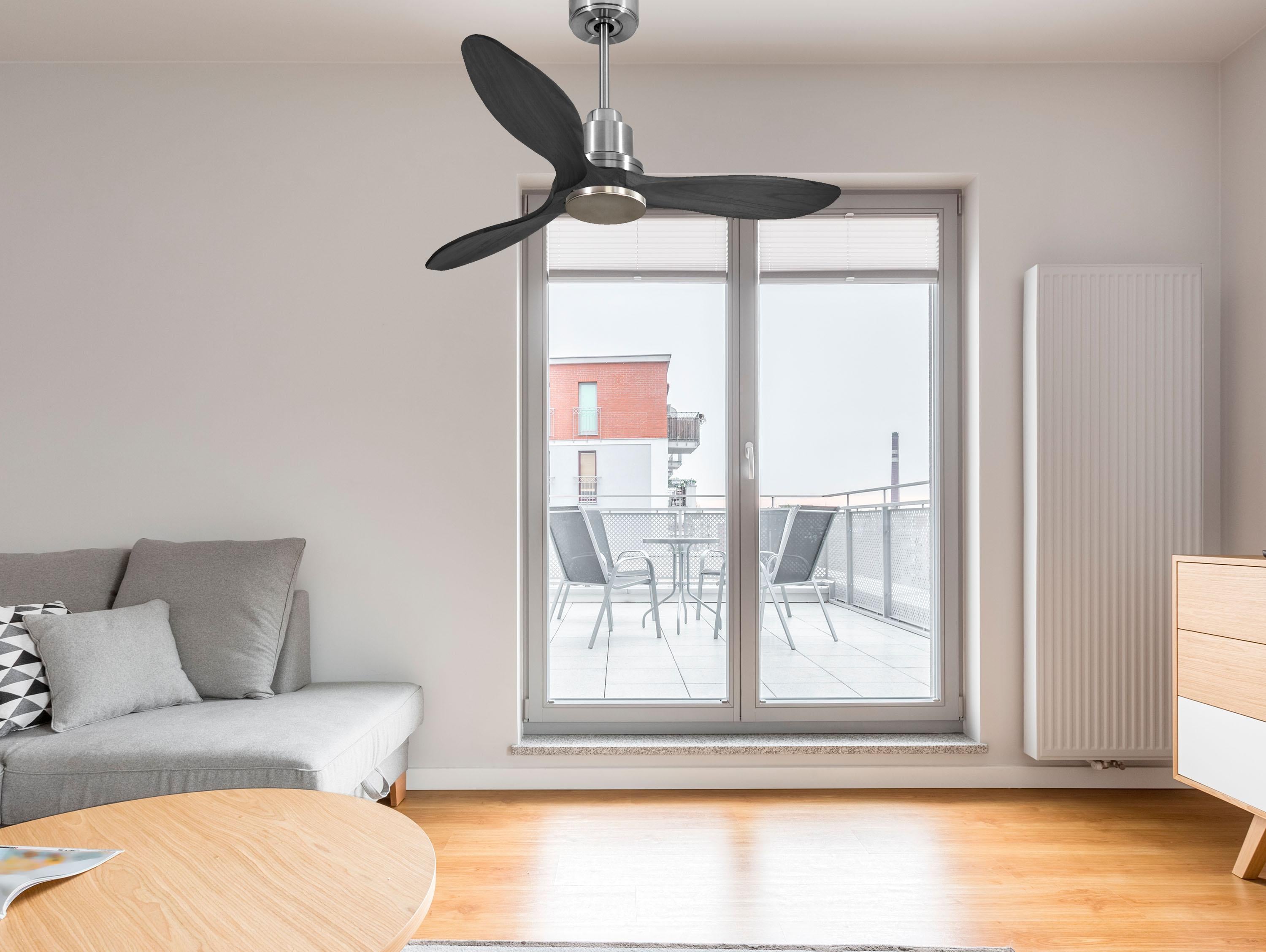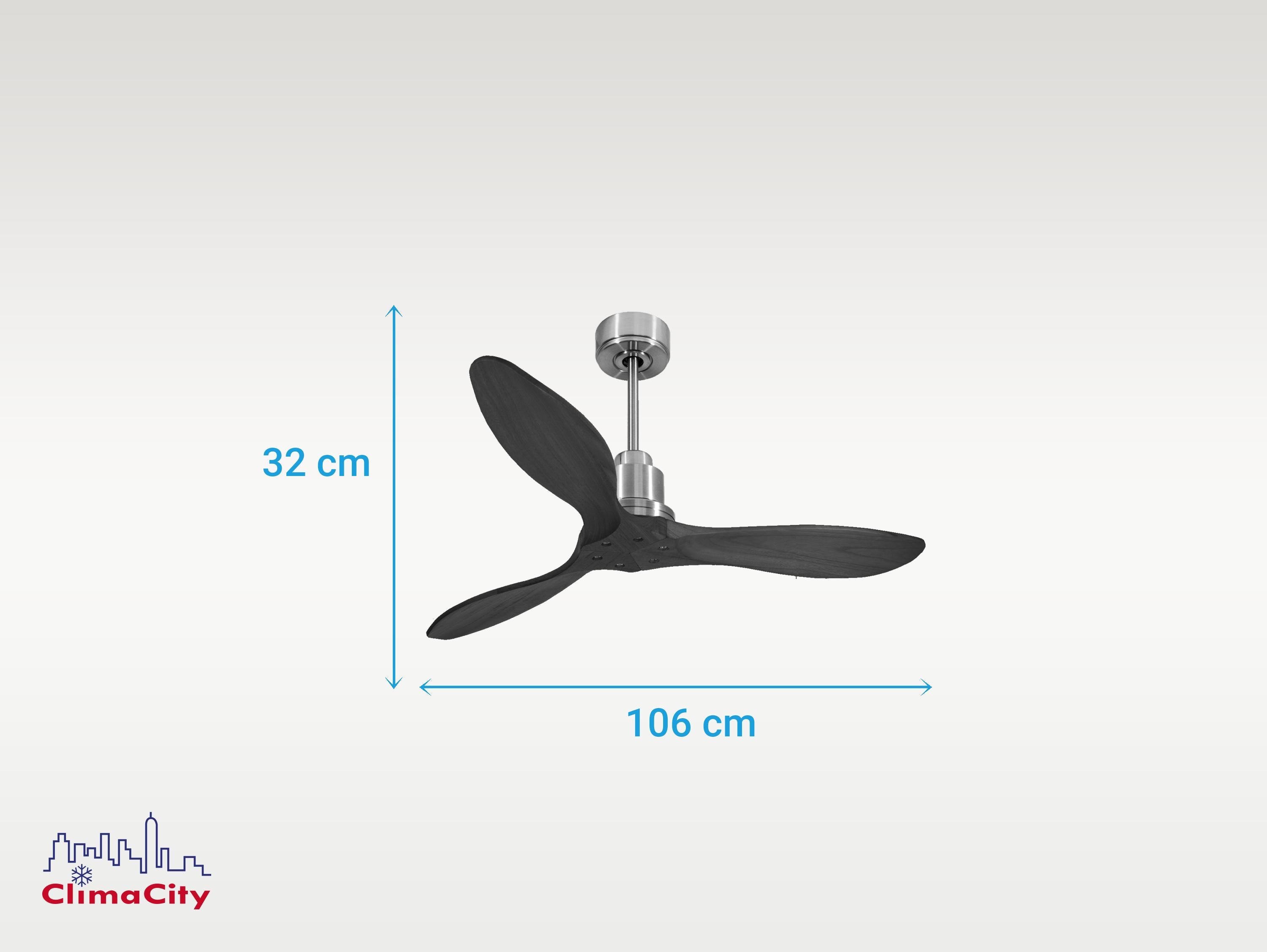 También dispone de una función de memoria que guarda la configuración utilizada, tanto de velocidad como de luz, si así está equipado, de forma que cuando se apaga el ventilador se guarda y cuando se vuelve a encender arranca con la misma configuración. Las palas aerodinámicas de madera balsa maciza otorgan al ventilador una gran ligereza. Han sido artesanalmente tratadas para estar equilibradas y no producir ningún tipo de vibración. Este modelo de 3 aspas acabadas en madera negra tiene un diámetro de 106 cm.