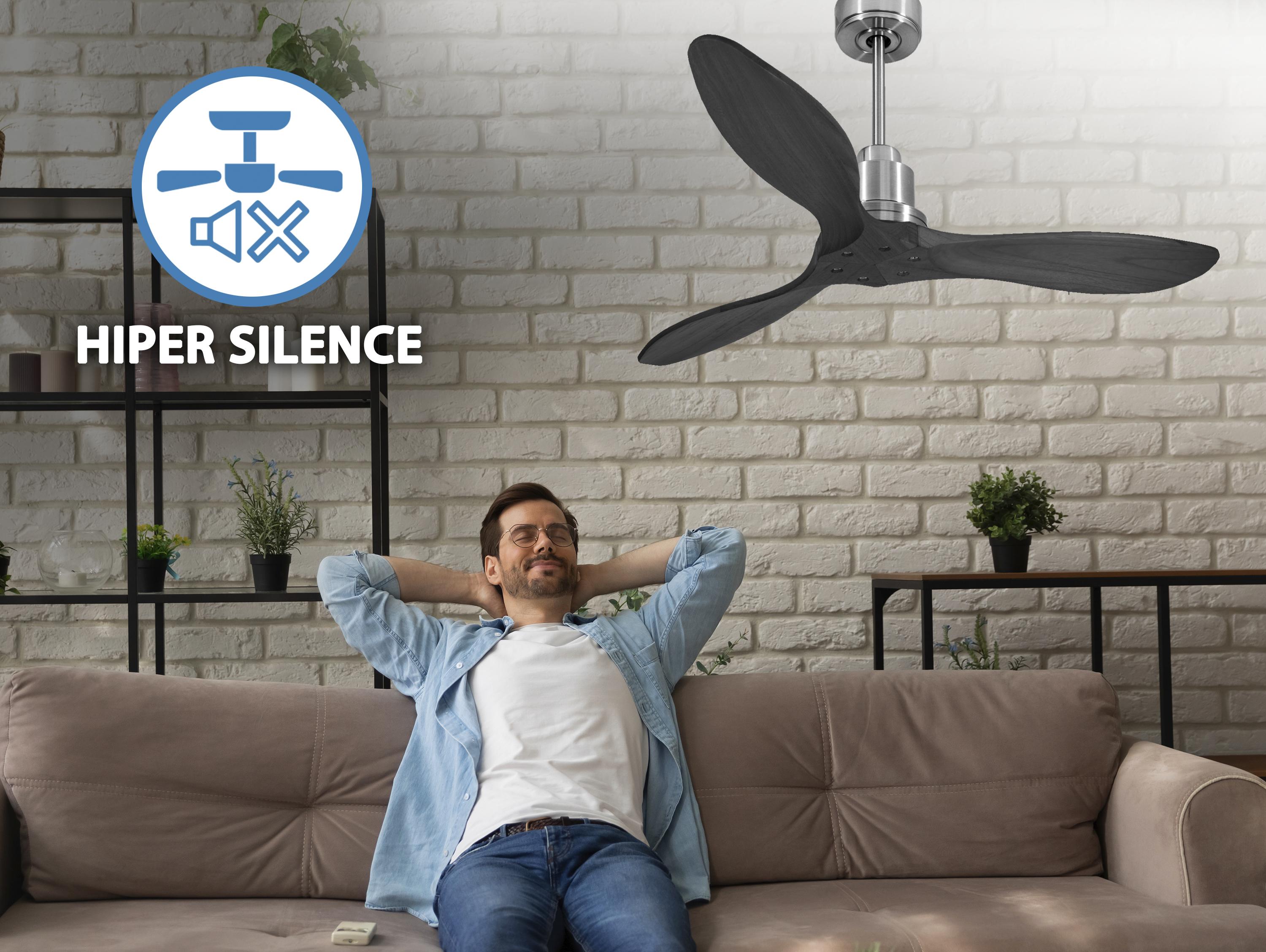Ademas cuenta con multitud de ventajas adicionales como 6 velocidades programables (fullflow), temporizador (8h) y posibilidad de control remoto mediante mando a distancia, mando de pared y conexión WiFi con la aplicación Tuya Smart, para poder utilizar el ventilador desde cualquier dispositivo móvil. Cuenta también con sistema certificado Hypersilence, una tecnología súper silenciosa a velocidad 3 y que permite utilizar el ventilador por las noches o en momentos de descansos, ofreciendo un rendimiento muy silencioso y con un consumo muy reducido, pudiendo llegar de 3 a 5 W, con aspas de 106 cm.