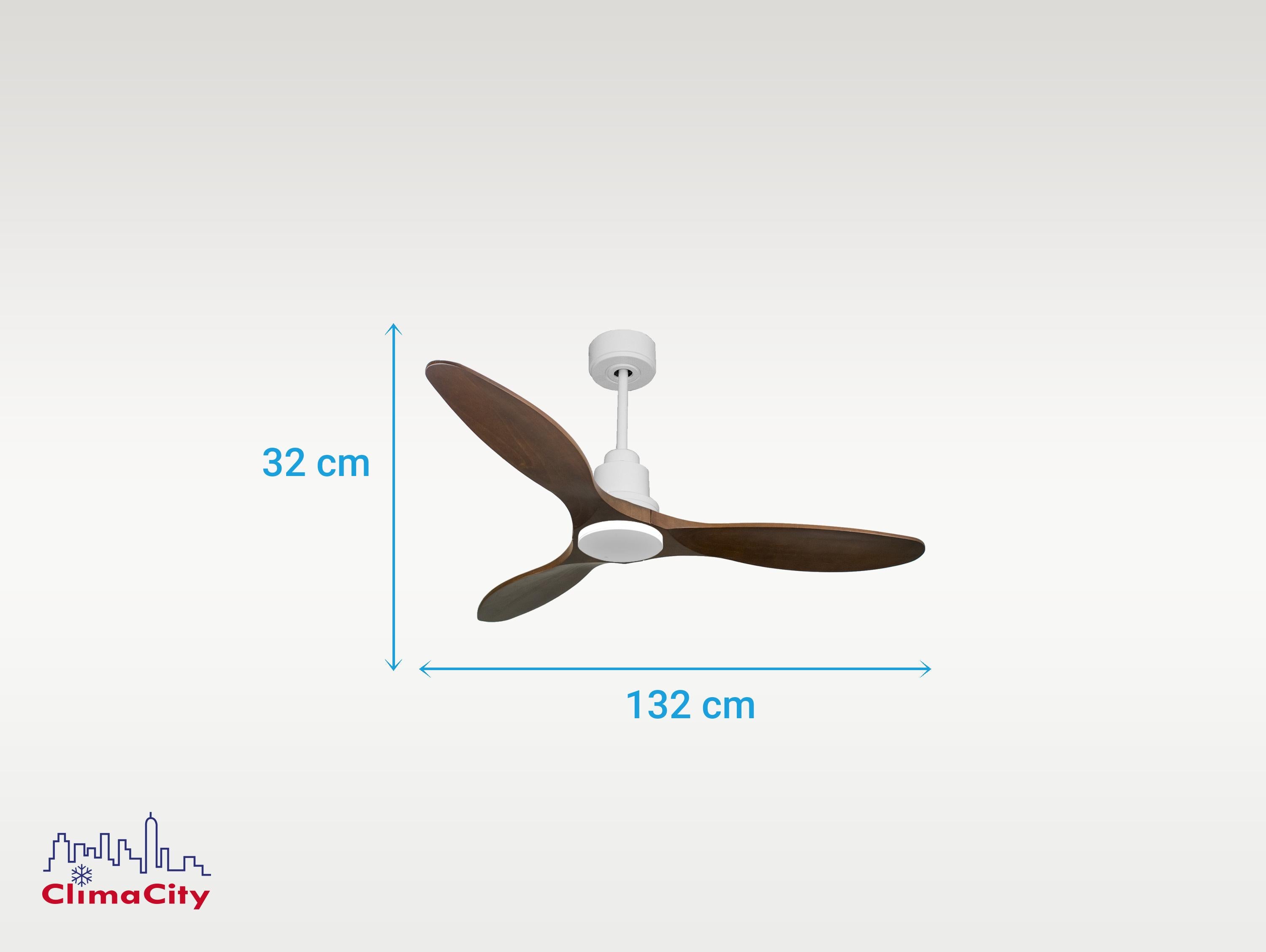 El motor de corriente continua (DC) Klassfan by Purline, es un motor de alta calidad con unas prestaciones de alto nivel. Permite instalaciones en techos de hasta 15º de inclinación y se sirve con dos tijas para que se instale a la altura adecuada (13.5 cm y 25 cm). Permite 2 o 3 aspas (dependiendo del modelo de aspa), pues dispone de una función de auto equilibrado. Todos los motores permite incluir un kit de luz.Es un motor con función Verano/Invierno (Desestratificador de aire), de forma que en invierno podrás invertir el movimiento del motor, para que su giro desplace el aire caliente hacia abajo, actuando como complemento de tu sistema de calefacción y favoreciendo un consumo optimizado con un importante ahorro energético. Además incluye un termostato en su base superior, que te permite programar el ventilador para funcione según la temperatura ambiente.Una ventaja muy destacada, es su sistema FullFlow patentado, que permite calibrar el consumo y la potencia del motor, a las necesidades de las palas elegidas, logrando unos resultados espectaculares en rendimiento energético. Nuestro sistema Fullflow permite una verdadera versatibilidad.Ademas cuenta con multitud de ventajas adicionales como 6 velocidades programables (fullflow), temporizador (8h) y posibilidad de control remoto mediante mando a distancia, mando de pared y conexión WiFi con la aplicación Tuya Smart, para poder utilizar el ventilador desde cualquier dispositivo móvil. Cuenta también con sistema certificado Hypersilence, una tecnología súper silenciosa a velocidad 3 y que permite utilizar el ventilador por las noches o en momentos de descansos, ofreciendo un rendimiento muy silencioso y con un consumo muy reducido, pudiendo llegar de 3 a 5 W, con aspas de 106 cm.También dispone de una función de memoria que guarda la configuración utilizada, tanto de velocidad como de luz, si así está equipado, de forma que cuando se apaga el ventilador se guarda y cuando se vuelve a encender arranca con la misma configuración. Las palas aerodinámicas de madera balsa maciza otorgan al ventilador una gran ligereza. Han sido artesanalmente tratadas para estar equilibradas y no producir ningún tipo de vibración. Este modelo de 3 aspas acabadas en madera oscura tiene un diámetro de 132 cm 132cm