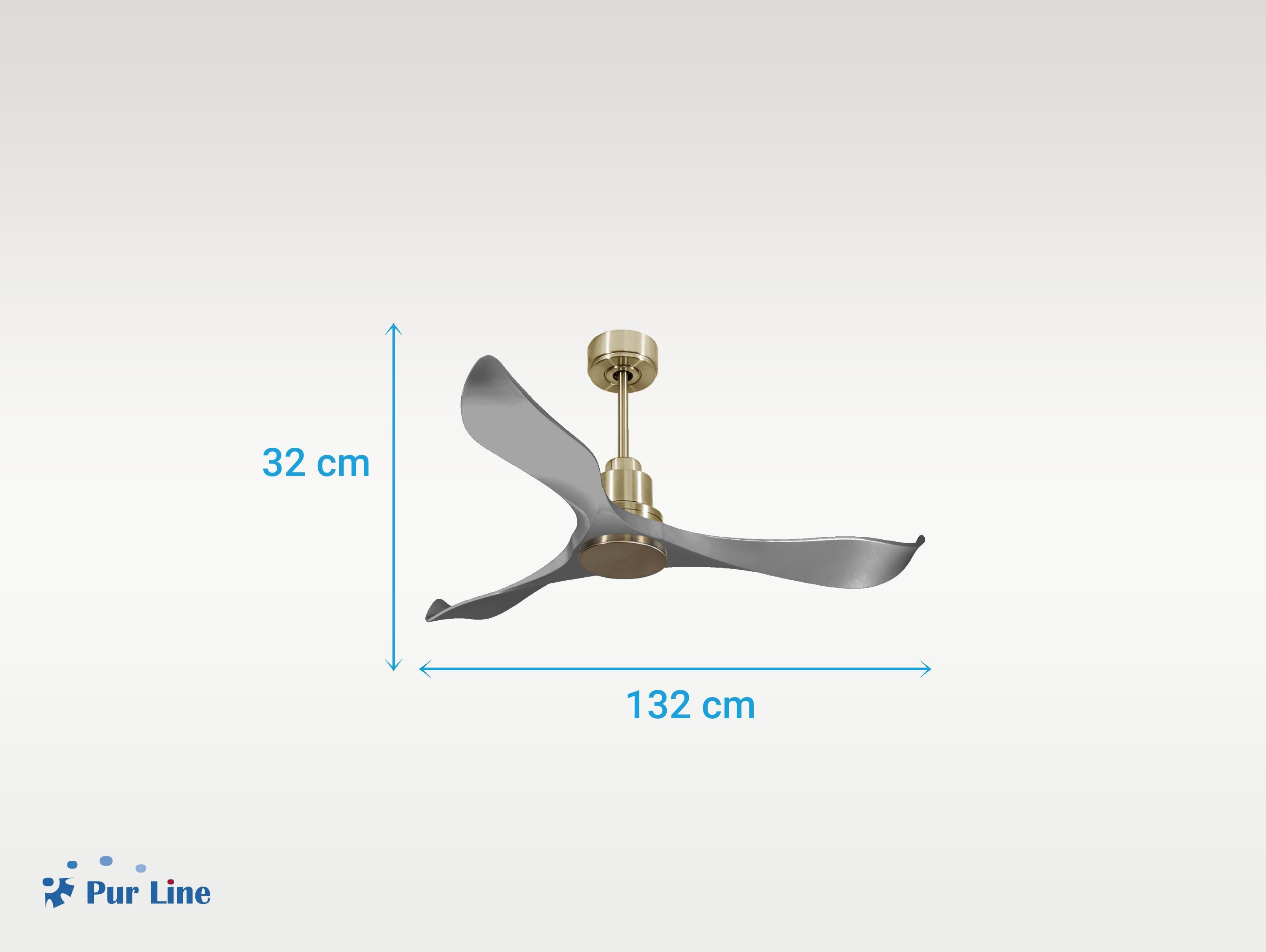 El motor de corriente continua (DC) Klassfan by Purline, es un motor de alta calidad con unas prestaciones de alto nivel. Permite instalaciones en techos de hasta 15º de inclinación y se sirve con dos tijas para que se instale a la altura adecuada (13.5 cm y 25 cm). Permite 2 o 3 aspas (dependiendo del modelo de aspa), pues dispone de una función de auto equilibrado. Todos los motores permite incluir un kit de luz.Es un motor con función Verano/Invierno (Desestratificador de aire), de forma que en invierno podrás invertir el movimiento del motor, para que su giro desplace el aire caliente hacia abajo, actuando como complemento de tu sistema de calefacción y favoreciendo un consumo optimizado con un importante ahorro energético. Además incluye un termostato en su base superior, que te permite programar el ventilador para funcione según la temperatura ambiente.Una ventaja muy destacada, es su sistema FullFlow patentado, que permite calibrar el consumo y la potencia del motor, a las necesidades de las palas elegidas, logrando unos resultados espectaculares en rendimiento energético. Nuestro sistema Fullflow permite una verdadera versatibilidad.Ademas cuenta con multitud de ventajas adicionales como 6 velocidades programables (fullflow), temporizador (8h) y posibilidad de control remoto mediante mando a distancia, mando de pared y conexión WiFi con la aplicación Tuya Smart, para poder utilizar el ventilador desde cualquier dispositivo móvil. Cuenta también con sistema certificado Hypersilence, una tecnología súper silenciosa a velocidad 3 y que permite utilizar el ventilador por las noches o en momentos de descansos, ofreciendo un rendimiento muy silencioso y con un consumo muy reducido, pudiendo llegar de 3 a 5 W, con aspas de 106 cm.También dispone de una función de memoria que guarda la configuración utilizada, tanto de velocidad como de luz, si así está equipado, de forma que cuando se apaga el ventilador se guarda y cuando se vuelve a encender arranca con la misma configuración. Las palas aerodinámicas de ABS otorgan al ventilador una gran ligereza. Han sido artesanalmente tratadas para estar equilibradas y no producir ningún tipo de vibración. Este modelo de 3 aspas en color gris tiene un diámetro de 132 cm y alcanza gran velocidad.
