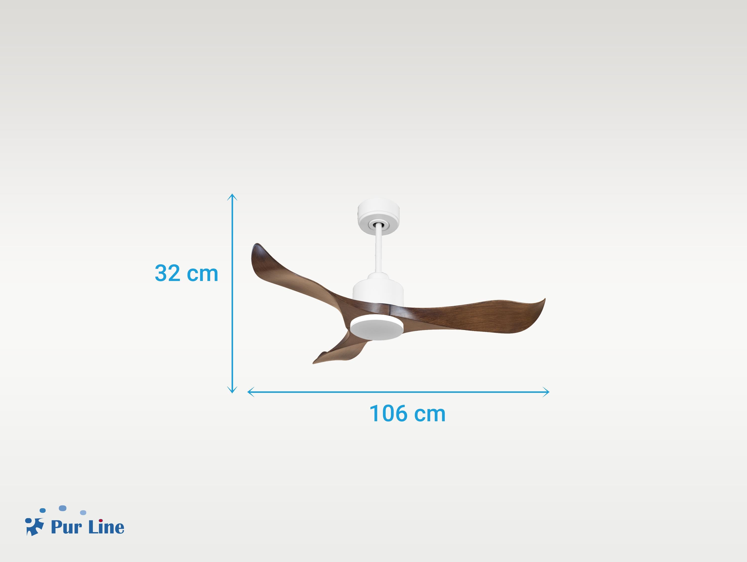 El motor de corriente continua (DC) Klassfan by Purline, es un motor de alta calidad con unas prestaciones de alto nivel. Permite instalaciones en techos de hasta 15º de inclinación y se sirve con dos tijas para que se instale a la altura adecuada (13.5 cm y 25 cm). Permite 2 o 3 aspas (dependiendo del modelo de aspa), pues dispone de una función de auto equilibrado. Todos los motores permite incluir un kit de luz.Es un motor con función Verano/Invierno (Desestratificador de aire), de forma que en invierno podrás invertir el movimiento del motor, para que su giro desplace el aire caliente hacia abajo, actuando como complemento de tu sistema de calefacción y favoreciendo un consumo optimizado con un importante ahorro energético. Además incluye un termostato en su base superior, que te permite programar el ventilador para funcione según la temperatura ambiente.Una ventaja muy destacada, es su sistema FullFlow patentado, que permite calibrar el consumo y la potencia del motor, a las necesidades de las palas elegidas, logrando unos resultados espectaculares en rendimiento energético. Nuestro sistema Fullflow permite una verdadera versatibilidad.Ademas cuenta con multitud de ventajas adicionales como 6 velocidades programables (fullflow), temporizador (8h) y posibilidad de control remoto mediante mando a distancia, mando de pared y conexión WiFi con la aplicación Tuya Smart, para poder utilizar el ventilador desde cualquier dispositivo móvil. Cuenta también con sistema certificado Hypersilence, una tecnología súper silenciosa a velocidad 3 y que permite utilizar el ventilador por las noches o en momentos de descansos, ofreciendo un rendimiento muy silencioso y con un consumo muy reducido, pudiendo llegar de 3 a 5 W, con aspas de 106 cm.También dispone de una función de memoria que guarda la configuración utilizada, tanto de velocidad como de luz, si así está equipado, de forma que cuando se apaga el ventilador se guarda y cuando se vuelve a encender arranca con la misma configuración. Las palas aerodinámicas de ABS otorgan al ventilador una gran ligereza. Han sido artesanalmente tratadas para estar equilibradas y no producir ningún tipo de vibración. Este modelo de 3 aspas en color marrón tiene un diámetro de 106 cm y alcanza gran velocidad.