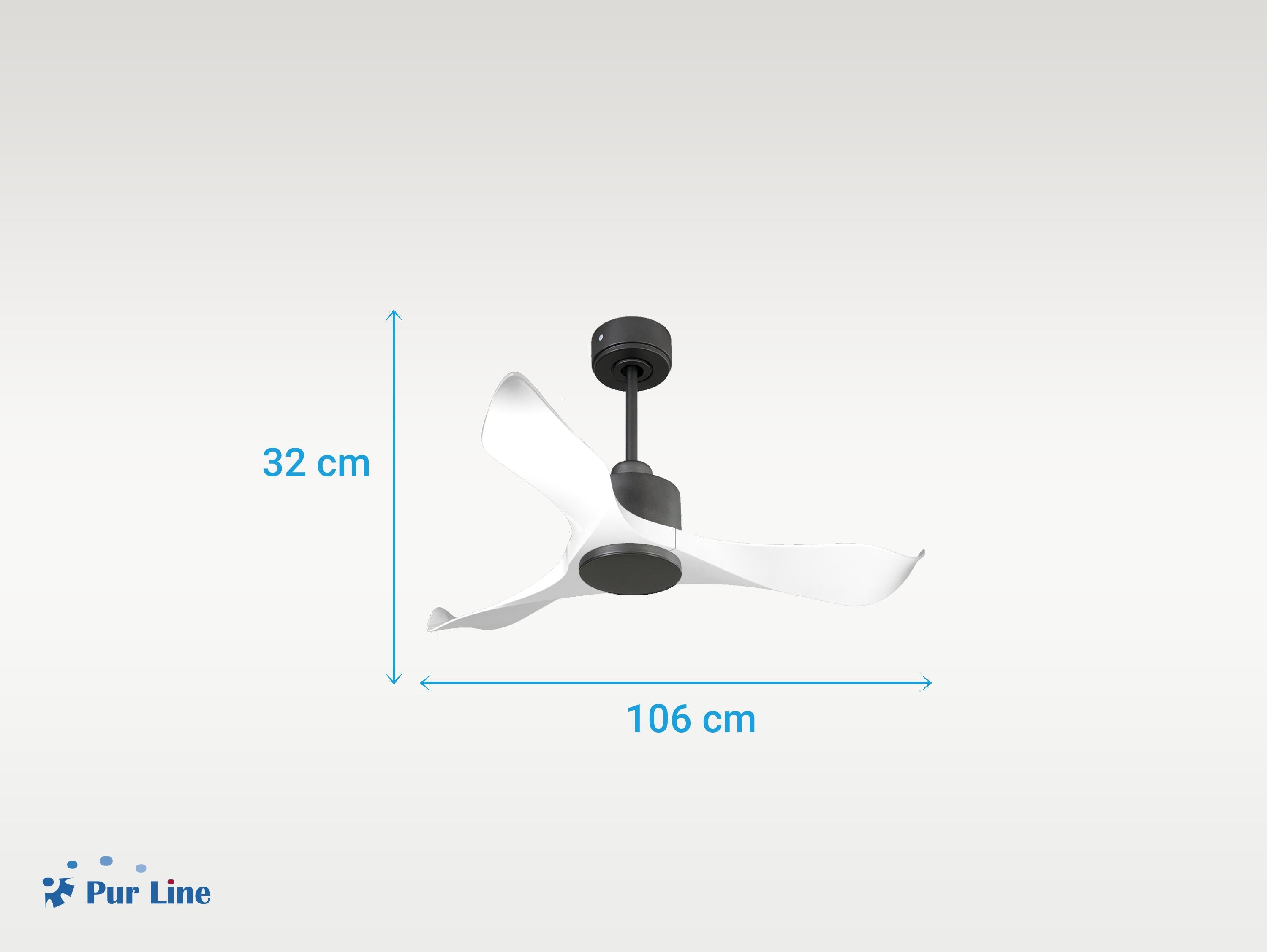 El motor de corriente continua (DC) Klassfan by Purline, es un motor de alta calidad con unas prestaciones de alto nivel. Permite instalaciones en techos de hasta 15º de inclinación y se sirve con dos tijas para que se instale a la altura adecuada (13.5 cm y 25 cm). Permite 2 o 3 aspas (dependiendo del modelo de aspa), pues dispone de una función de auto equilibrado. Todos los motores permite incluir un kit de luz.Es un motor con función Verano/Invierno (Desestratificador de aire), de forma que en invierno podrás invertir el movimiento del motor, para que su giro desplace el aire caliente hacia abajo, actuando como complemento de tu sistema de calefacción y favoreciendo un consumo optimizado con un importante ahorro energético. Además incluye un termostato en su base superior, que te permite programar el ventilador para funcione según la temperatura ambiente.Una ventaja muy destacada, es su sistema FullFlow patentado, que permite calibrar el consumo y la potencia del motor, a las necesidades de las palas elegidas, logrando unos resultados espectaculares en rendimiento energético. Nuestro sistema Fullflow permite una verdadera versatibilidad.Ademas cuenta con multitud de ventajas adicionales como 6 velocidades programables (fullflow), temporizador (8h) y posibilidad de control remoto mediante mando a distancia, mando de pared y conexión WiFi con la aplicación Tuya Smart, para poder utilizar el ventilador desde cualquier dispositivo móvil. Cuenta también con sistema certificado Hypersilence, una tecnología súper silenciosa a velocidad 3 y que permite utilizar el ventilador por las noches o en momentos de descansos, ofreciendo un rendimiento muy silencioso y con un consumo muy reducido, pudiendo llegar de 3 a 5 W, con aspas de 106 cm.También dispone de una función de memoria que guarda la configuración utilizada, tanto de velocidad como de luz, si así está equipado, de forma que cuando se apaga el ventilador se guarda y cuando se vuelve a encender arranca con la misma configuración. Las palas aerodinámicas de ABS otorgan al ventilador una gran ligereza. Han sido artesanalmente tratadas para estar equilibradas y no producir ningún tipo de vibración. Este modelo de 3 aspas en color blanco tiene un diámetro de 106 cm y alcanza gran velocidad.