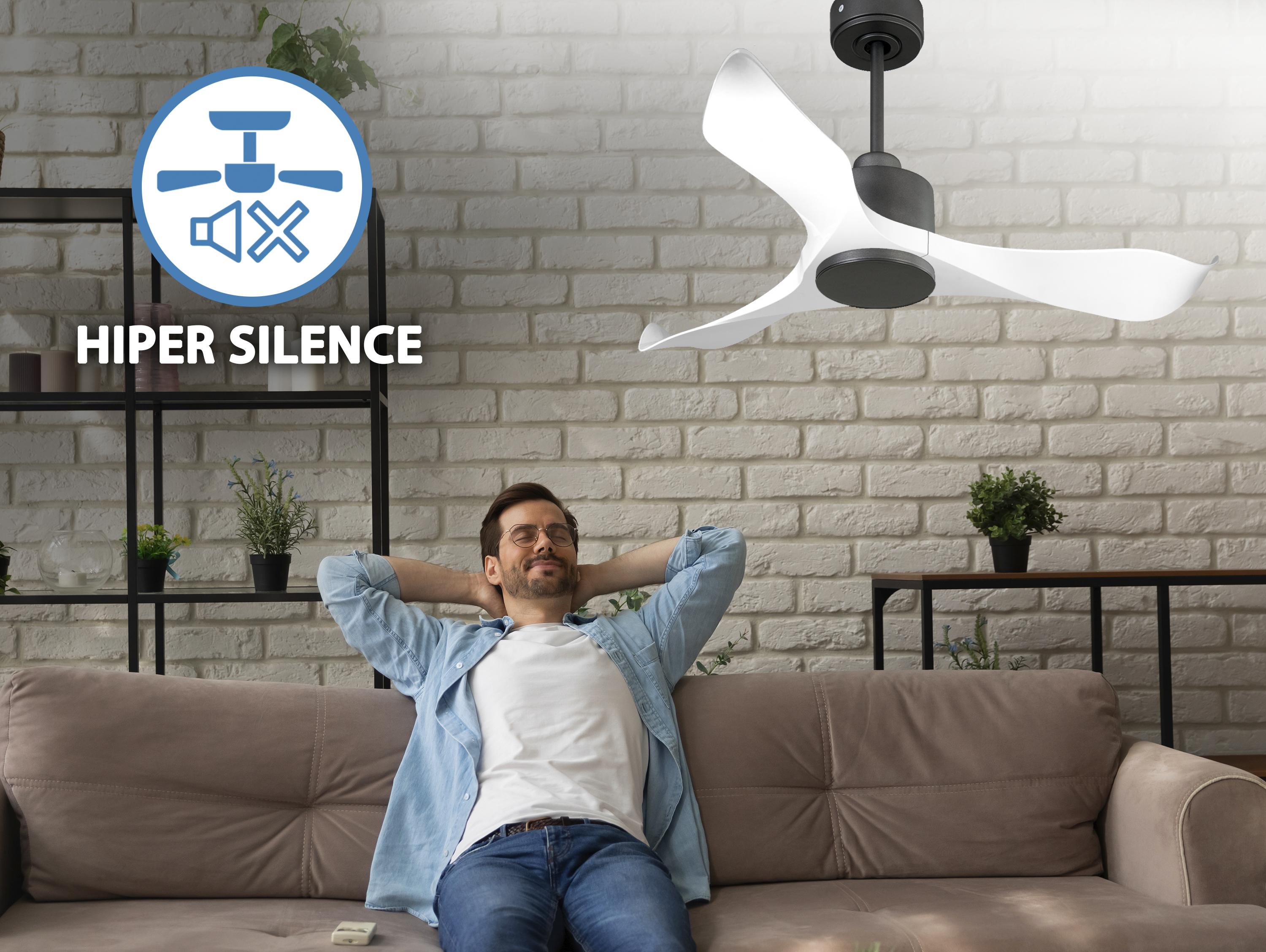 Ademas cuenta con multitud de ventajas adicionales como 6 velocidades programables (fullflow), temporizador (8h) y posibilidad de control remoto mediante mando a distancia, mando de pared y conexión WiFi con la aplicación Tuya Smart, para poder utilizar el ventilador desde cualquier dispositivo móvil. Cuenta también con sistema certificado Hypersilence, una tecnología súper silenciosa a velocidad 3 y que permite utilizar el ventilador por las noches o en momentos de descansos, ofreciendo un rendimiento muy silencioso y con un consumo muy reducido, pudiendo llegar de 3 a 5 W, con aspas de 106 cm.