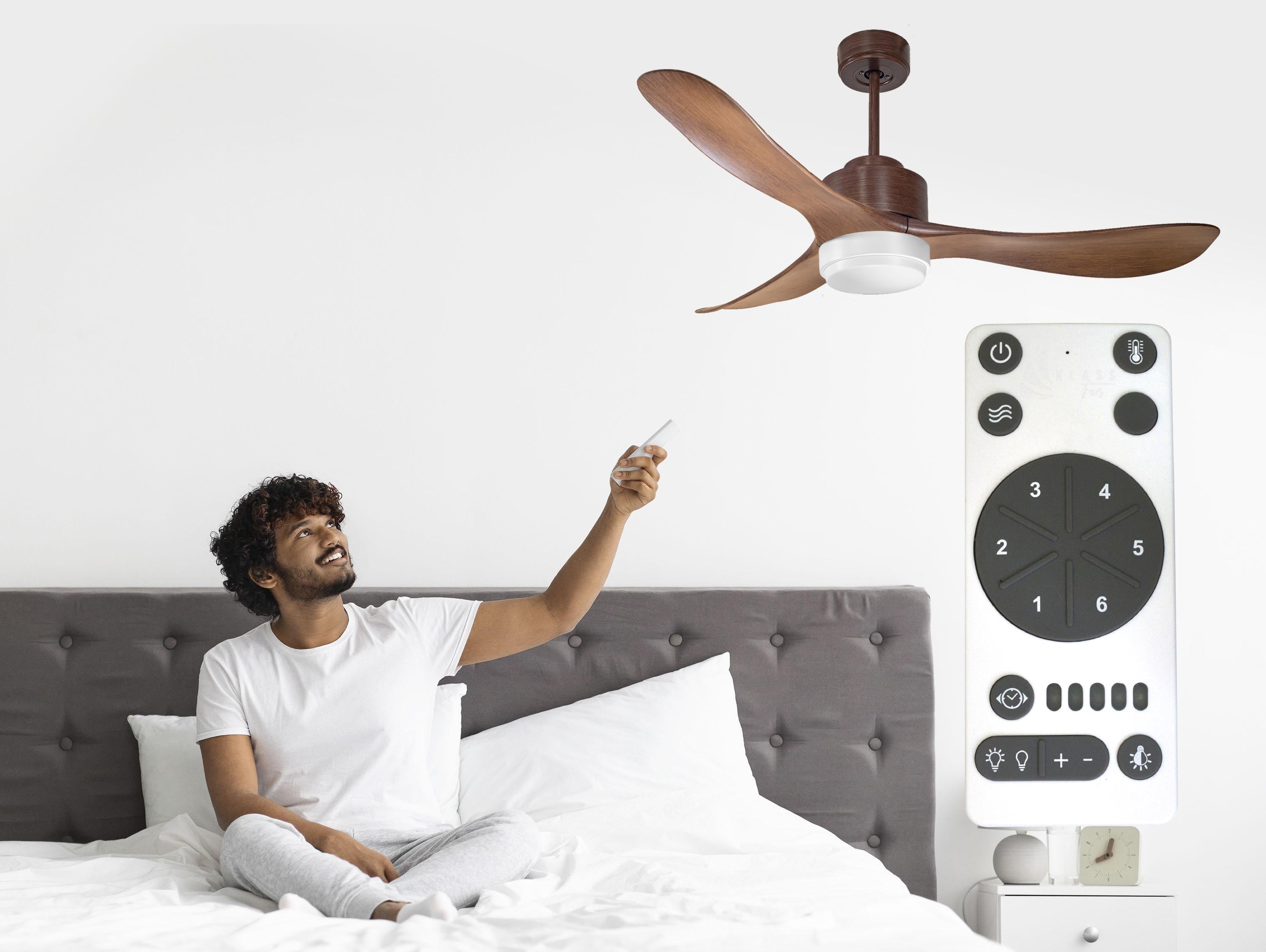 Ventilador de techo Reversible Termostato Dimable Wifi Motor DC Techos Inclinados Mando a Distancia Luz tres tonos Hypersilence Memoria
