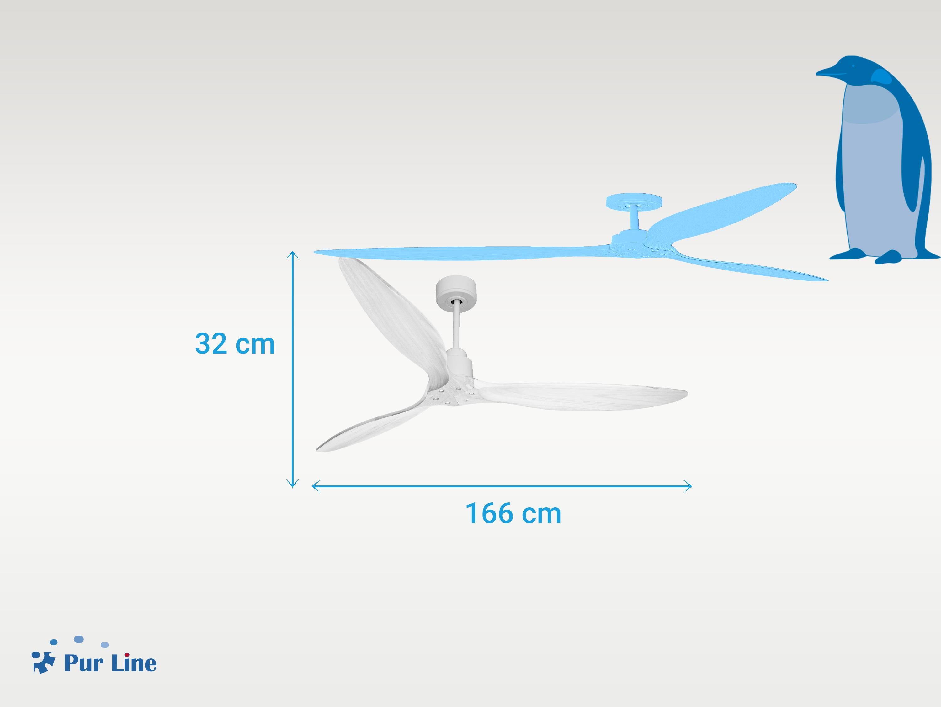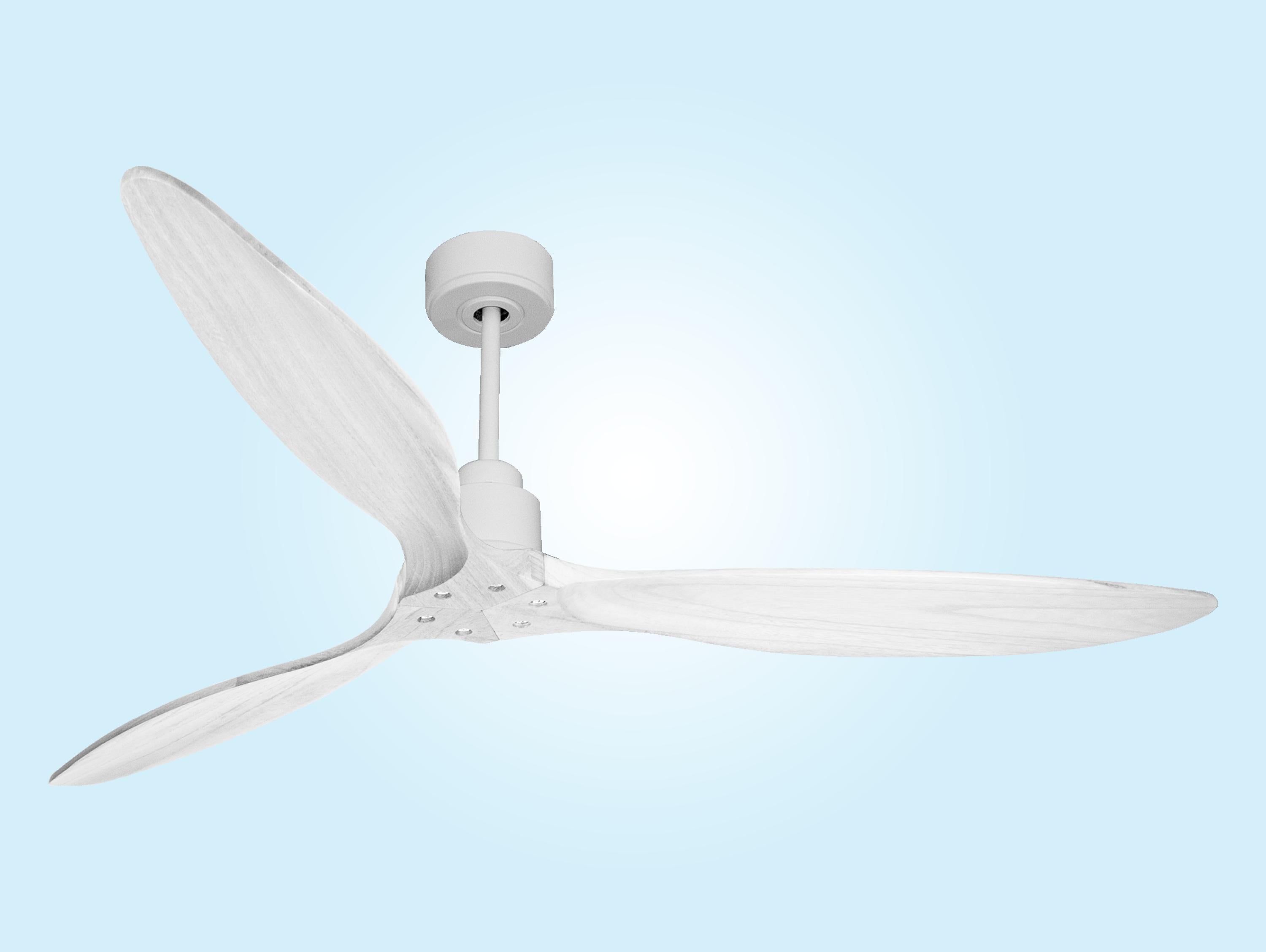 Las palas aerodinámicas de madera balsa maciza otorgan al ventilador una gran ligereza. Han sido artesanalmente tratadas para estar equilibradas y no producir ningún tipo de vibración. Este modelo de 3 aspas acabadas en madera blanca tiene un diámetro de 166 cm.