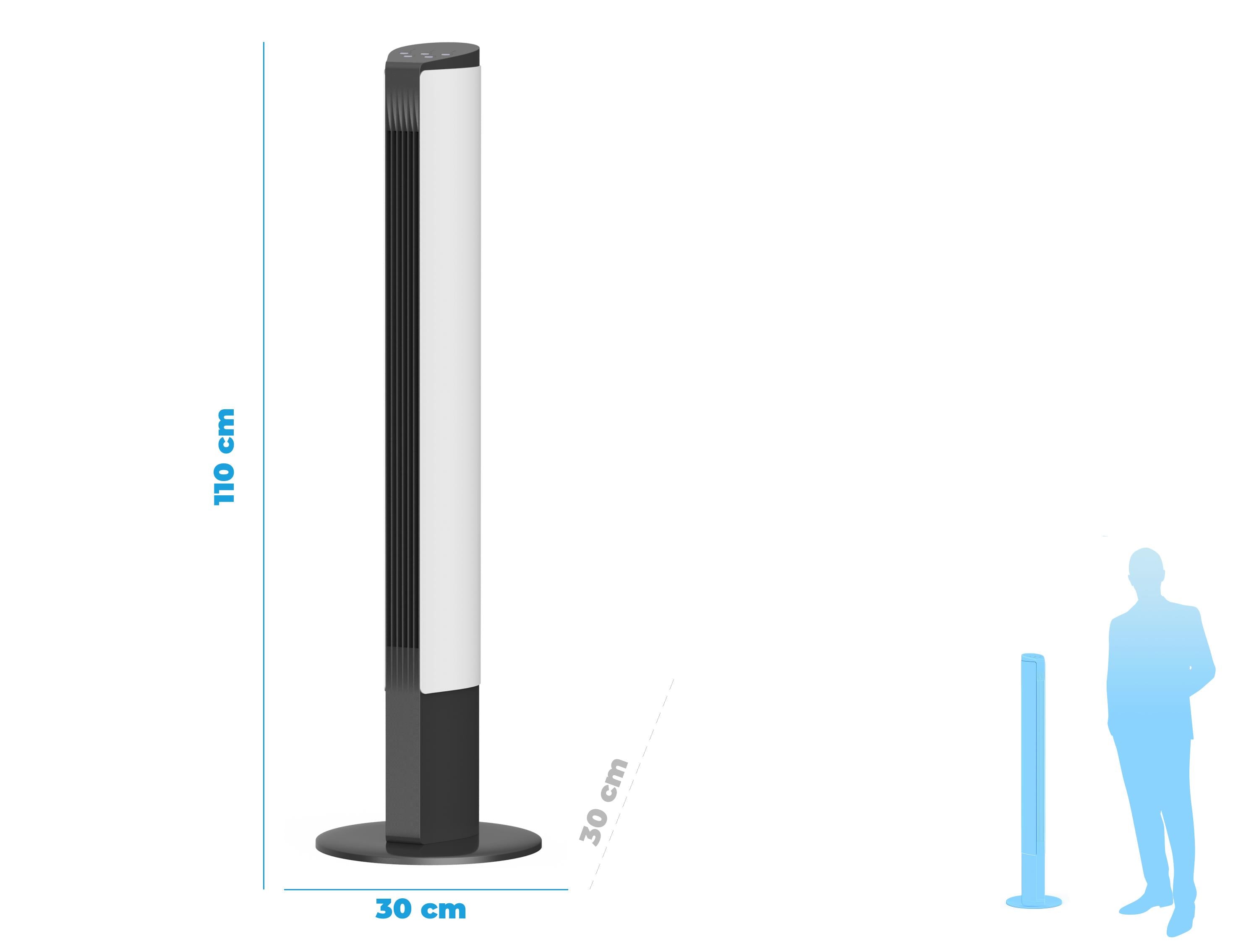 El ventilador tiene una altura de 110 cm, lo que permite una distribución del aire eficiente en toda la habitación.