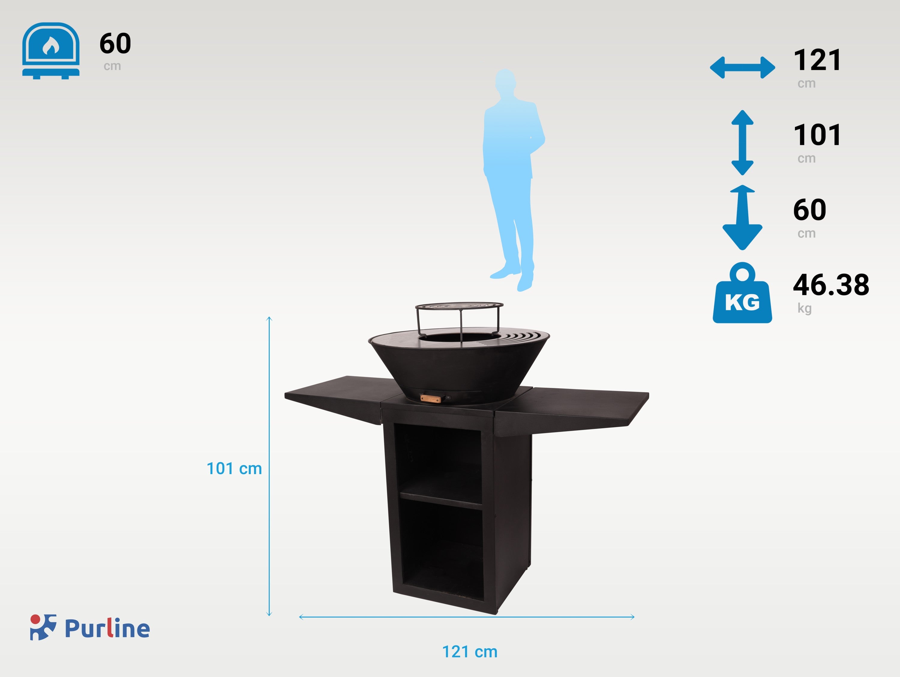 Las barbacoas de Purline son una novedosa forma de aprovechar la cocina. Funcionan a través de carbón, leña, que emiten una cantidad mínima de CO2, de forma que son totalmente independientes de cualquier fuente de energía y a la vez son ecológicas.La EFP57B Es una Barbacoa de 60cm de diámetro (LxPxH:121 x 60 x 101cm) y peso (43kg) que puede usarse también de brasero. Está fabricada en acero, puede soportar altas temperaturas sin deformarse. Además, cuenta con una parrilla de acero inoxidable de alta calidad, que es resistente a la oxidación.Tiene cajón recoge ceniza ,base con espacio para guardar la leña y bandejas laterales.Incluye grill adicional y funda protectora resistente al agua y a los rayos UV para proteger la barbacoa de las inclemencias del tiempo.Su instalación y su limpieza no te supondrán ningún problema, y gracias a su genuino diseño tu jardín ganará en personalidad.