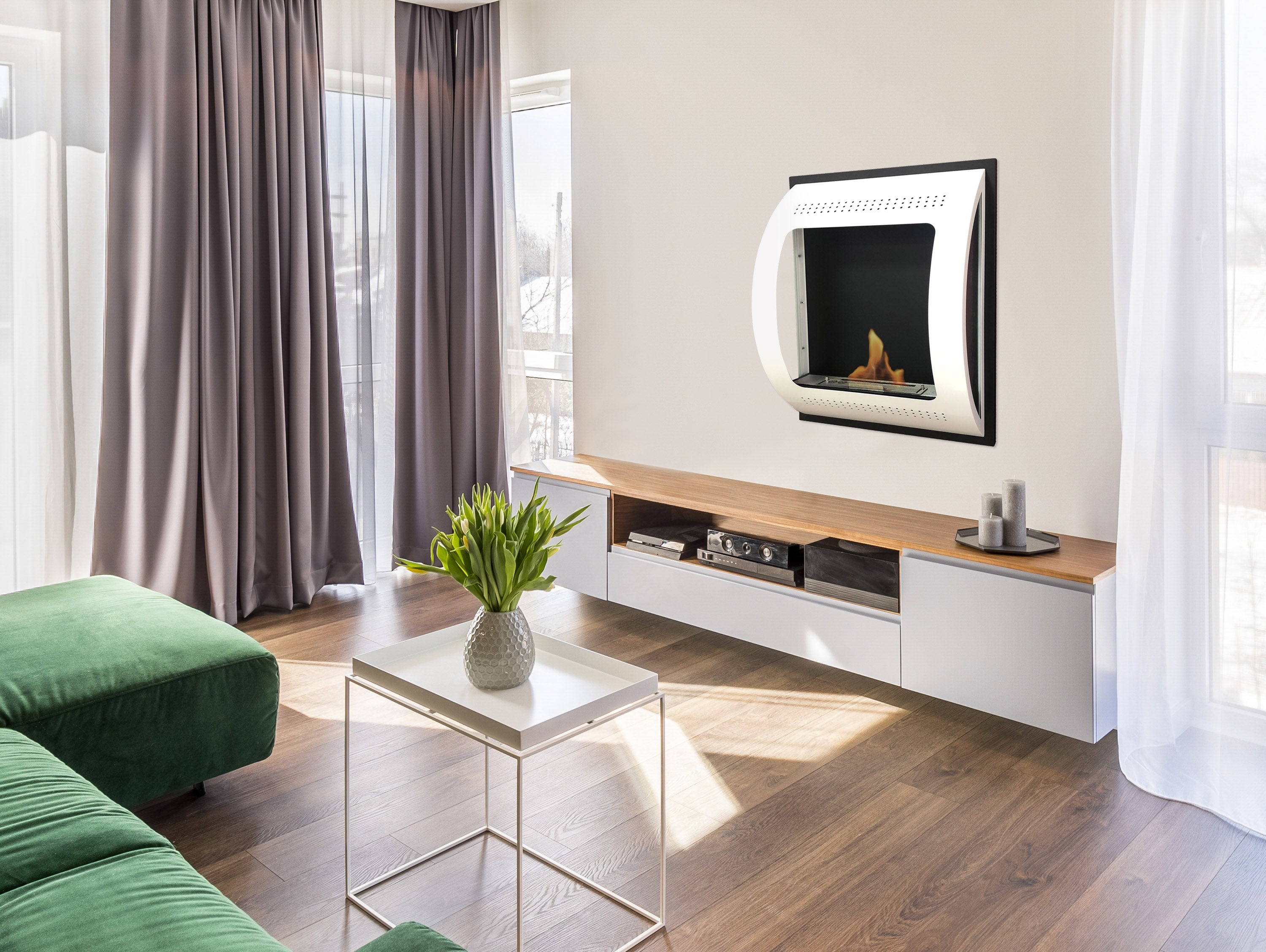 Chimenea de etanol mural de 2000W, diseño moderno en acero blanco