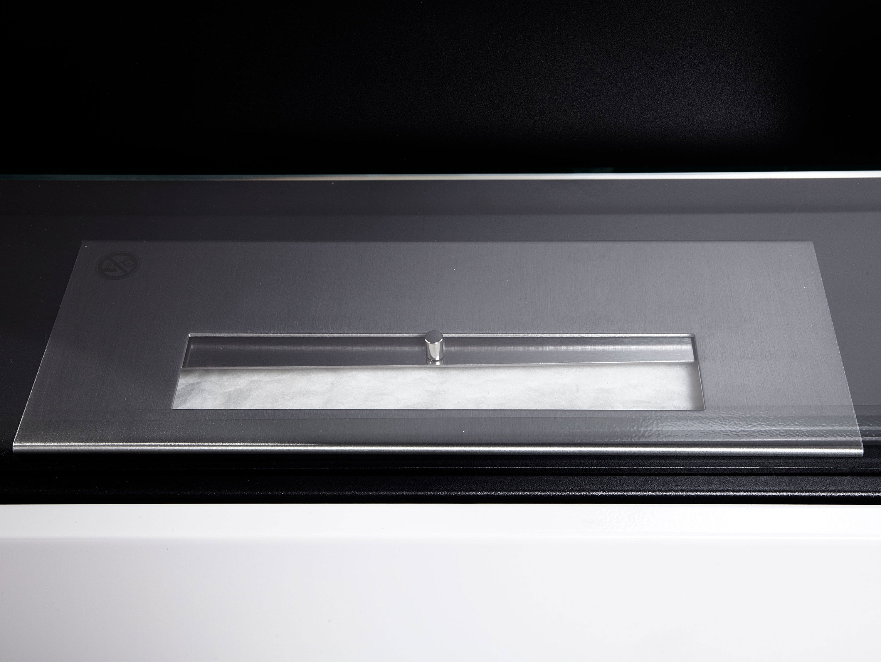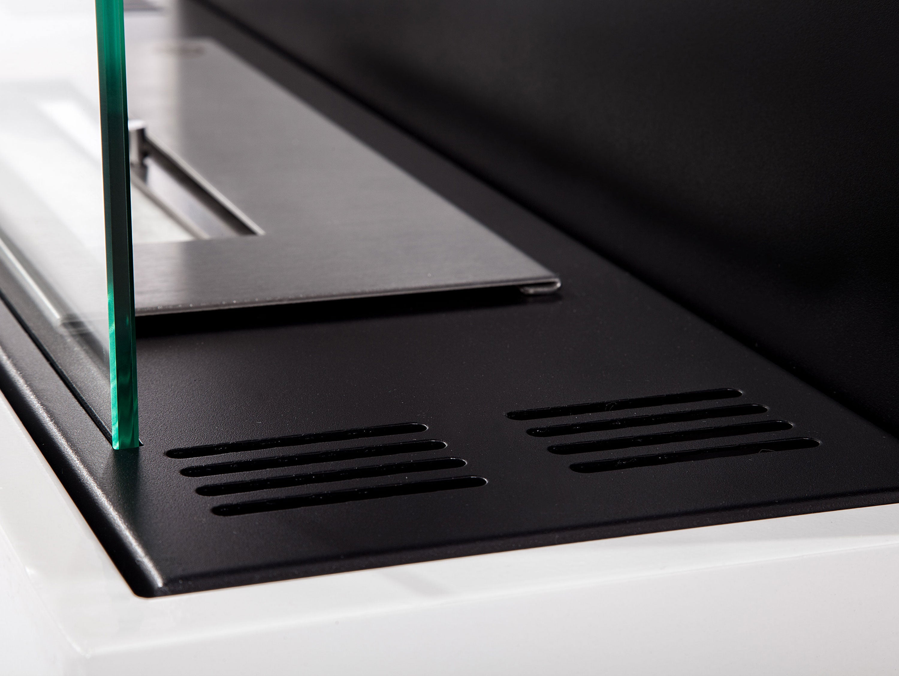 Biochimenea mural en acero blanco con fondo negro y vidrio templado