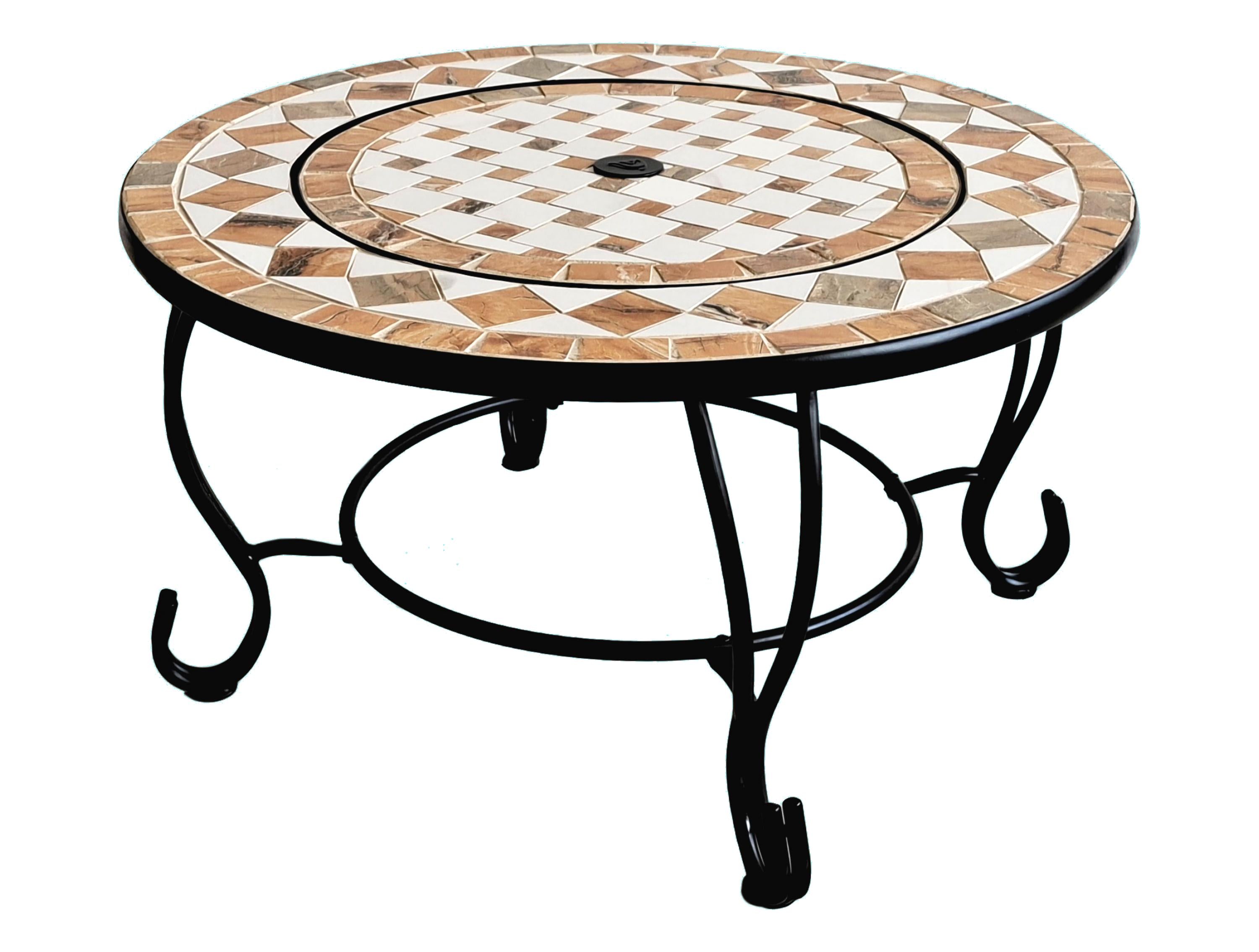Apto para usar en exteriores, su práctico diseño en forma de tablero redondo fabricado en acero cromado y losetas de cerámica, dispone de un brasero central para la leña y una tapa protectora contra las chispas. Además su diseño rústico en tonos cálidos aportará un toque único a tu hogar.