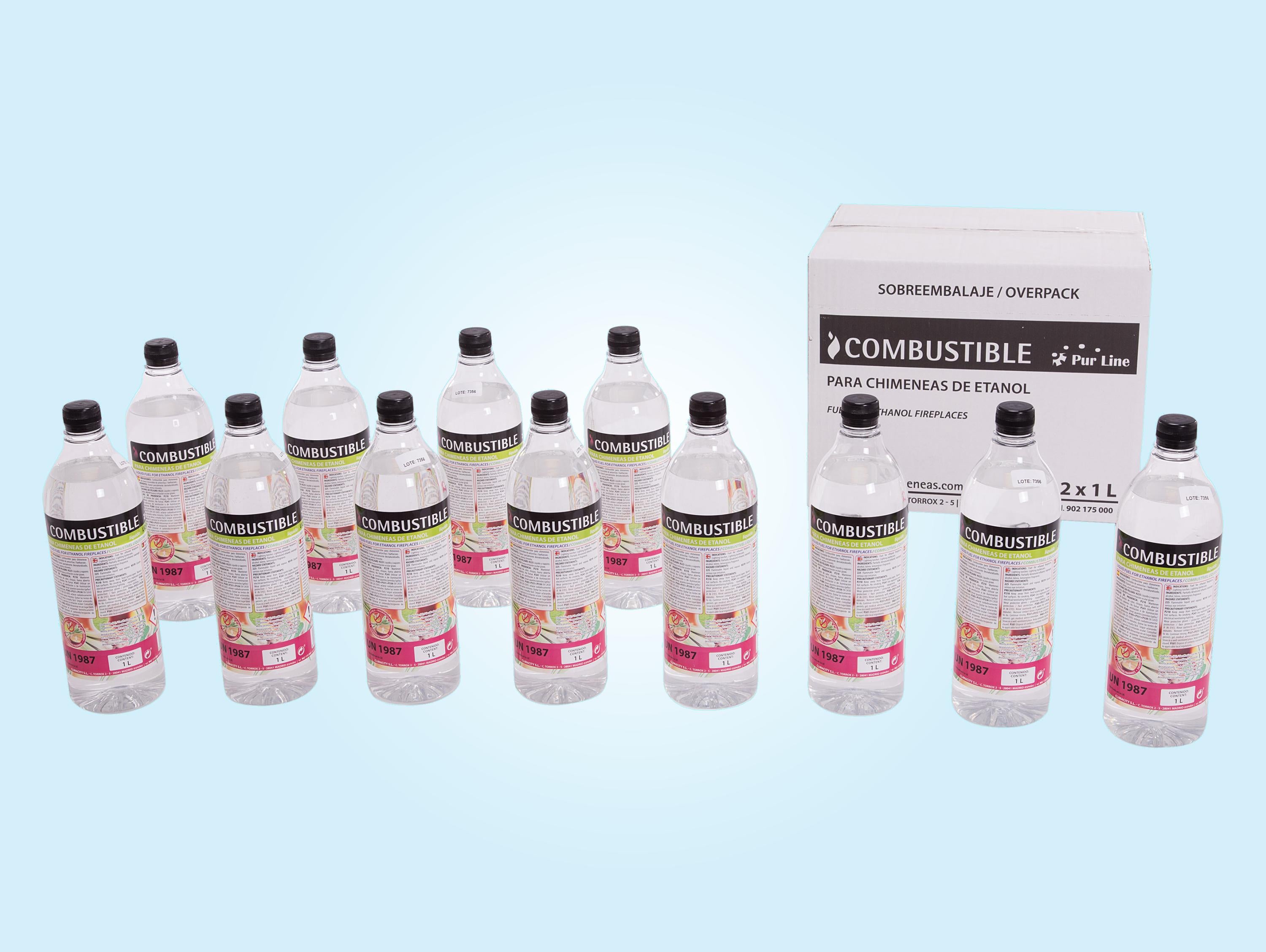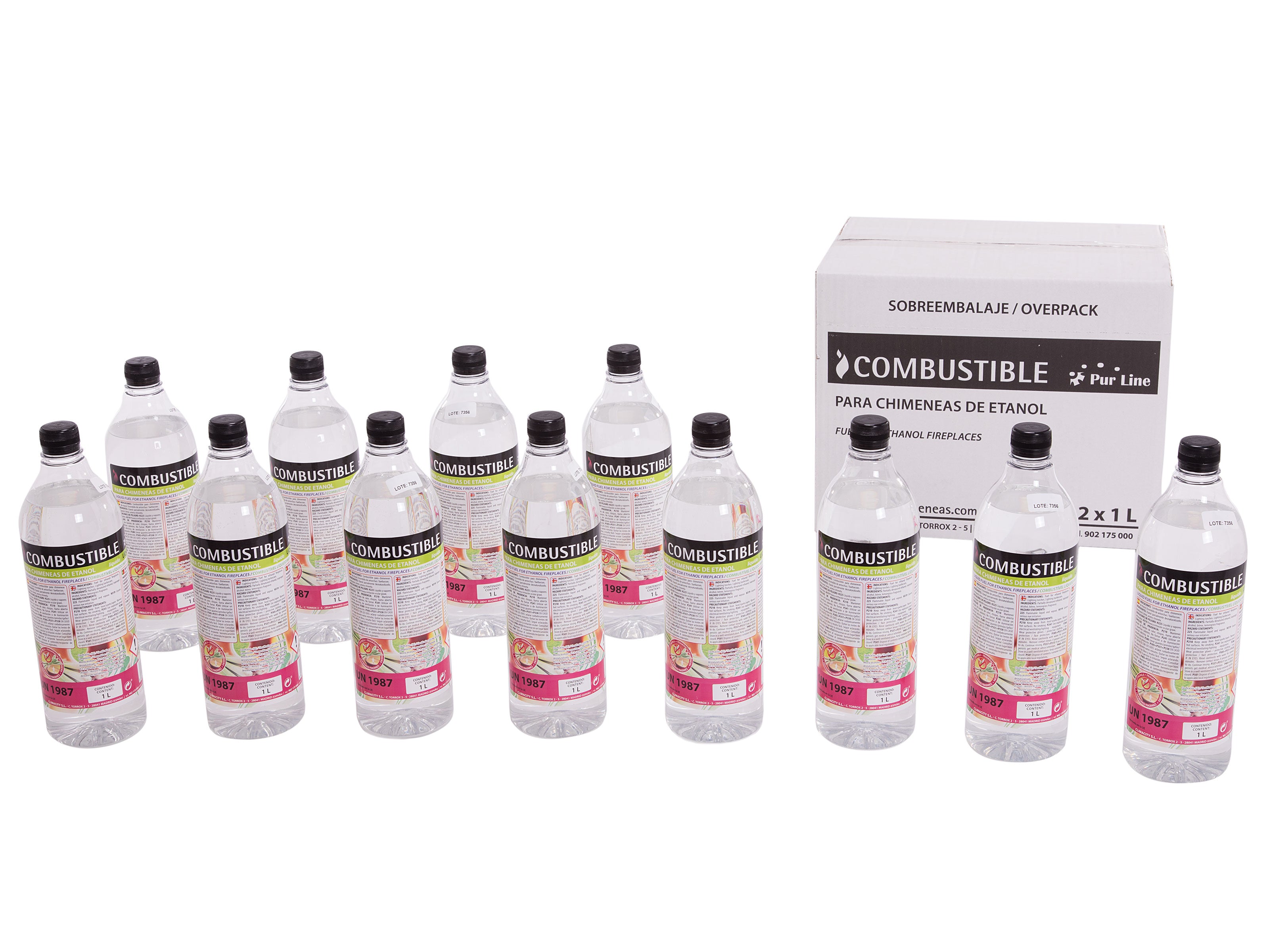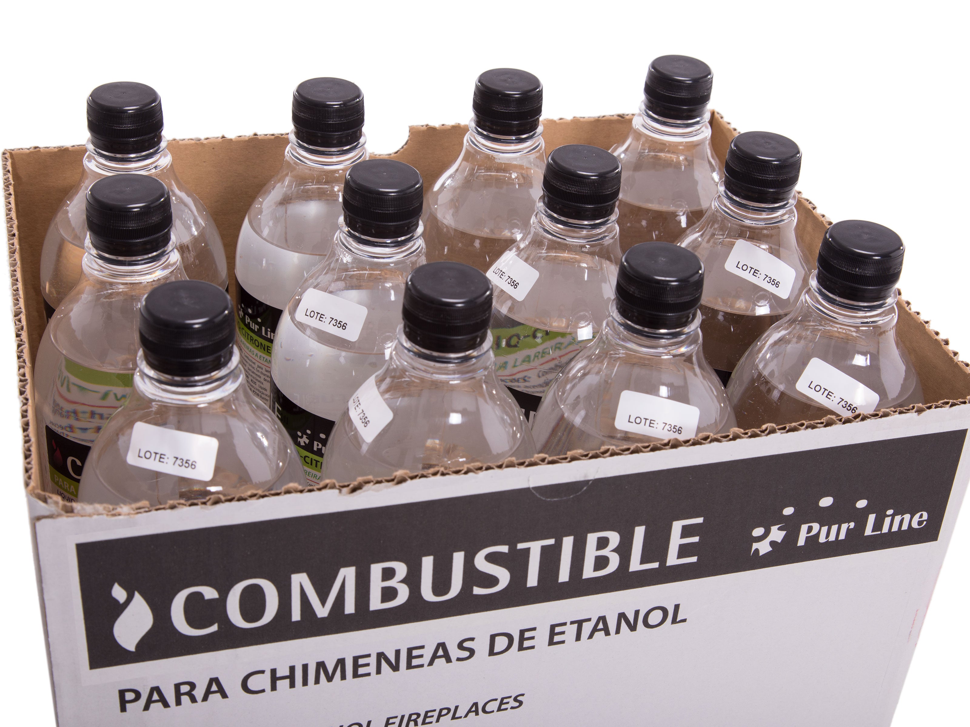 Cada caja contiene 12 botellas de 1 litro de combustible de etanol.