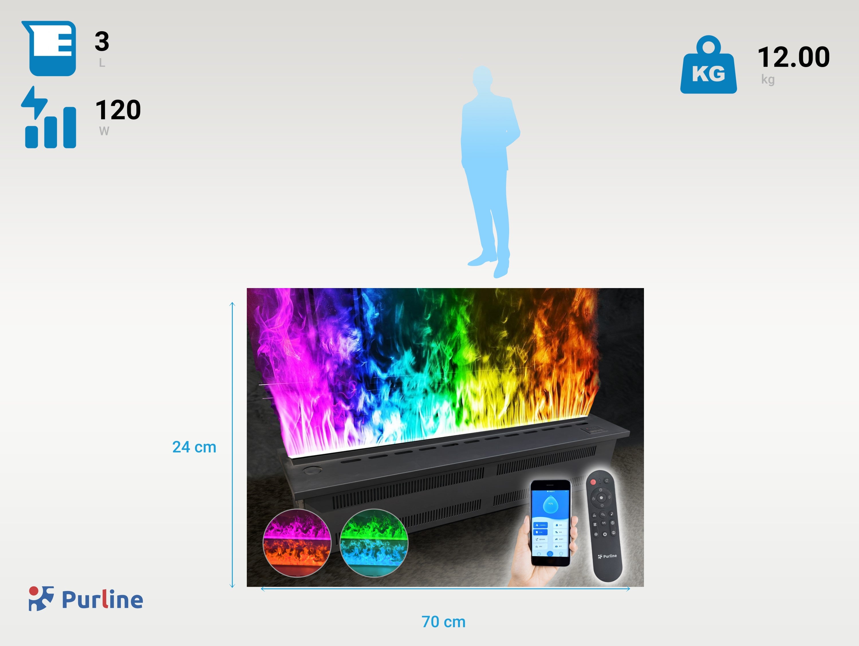 ¿Sabías que puedes disfrutar del ambiente acogedor de una chimenea sin preocuparte por el humo, el gas o el calor excesivo? Con la chimenea decorativa FIRECOOL COLORS 70 de vapor de agua, transforma cualquier espacio en un rincón moderno, colorido y completamente seguro.La FIRECOOL COLORS 70 una creación de lujo, diseñada para ofrecer una experiencia visual envolvente. Gracias a su tecnología de llama simulada mediante vapor de agua, genera una llama fría, suave y natural que imitel fuego real, sin emitir humo ni gases tóxicos. Además, su control por Bluetooth a través de una app en tu smartphone o tablet, junto con el mando a distancia incluido, permite un manejo fácil y cómodo desde cualquier lugar de la habitación.Fabricada con materiales de la más alta calidad, esta chimenea destaca por su resistencia y durabilidad. Su estructura de acero en color negro con acabado impecable se adapta con elegancia a cualquier estilo decorativo. Con unas medidas compactas de 70x24x19 cm y un peso de solo 11,7 kg, combina diseño y funcionalidad sin ocupar demasiado espacio.Entre sus prestaciones avanzadas, cuenta con turbinas hidráulicas ultra silenciosas para una experiencia relajante, un depósito de agua de 3 litros con aviso de nivel bajo y una autonomía aproximada de 6 a 8 horas gracias a su caudal máximo de 400 ml/h. Lo más destacado es su sistema de iluminación LED con múltiples colores, modos y funciones seleccionables, que intensifica el efecto hiperrealista del fuego y permite crear el ambiente perfecto según la ocasión.Ideal para quienes valoran el diseño, la tecnología y el confort, la FIRECOOL COLORS 70 es la opción ideal para disfrutar de una chimenea decorativa moderna y versátil, en cualquier época del año.