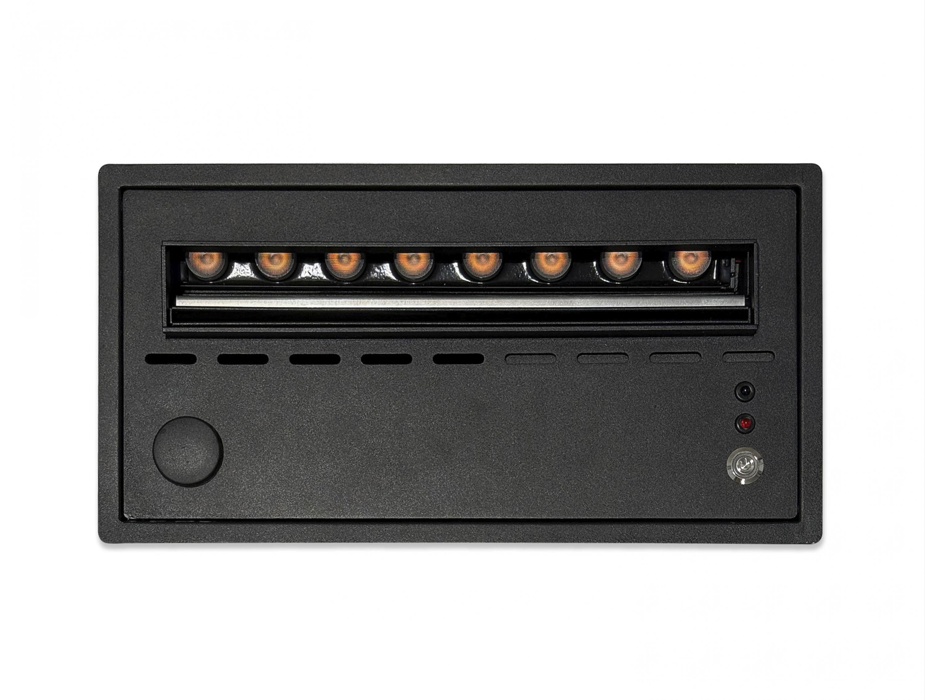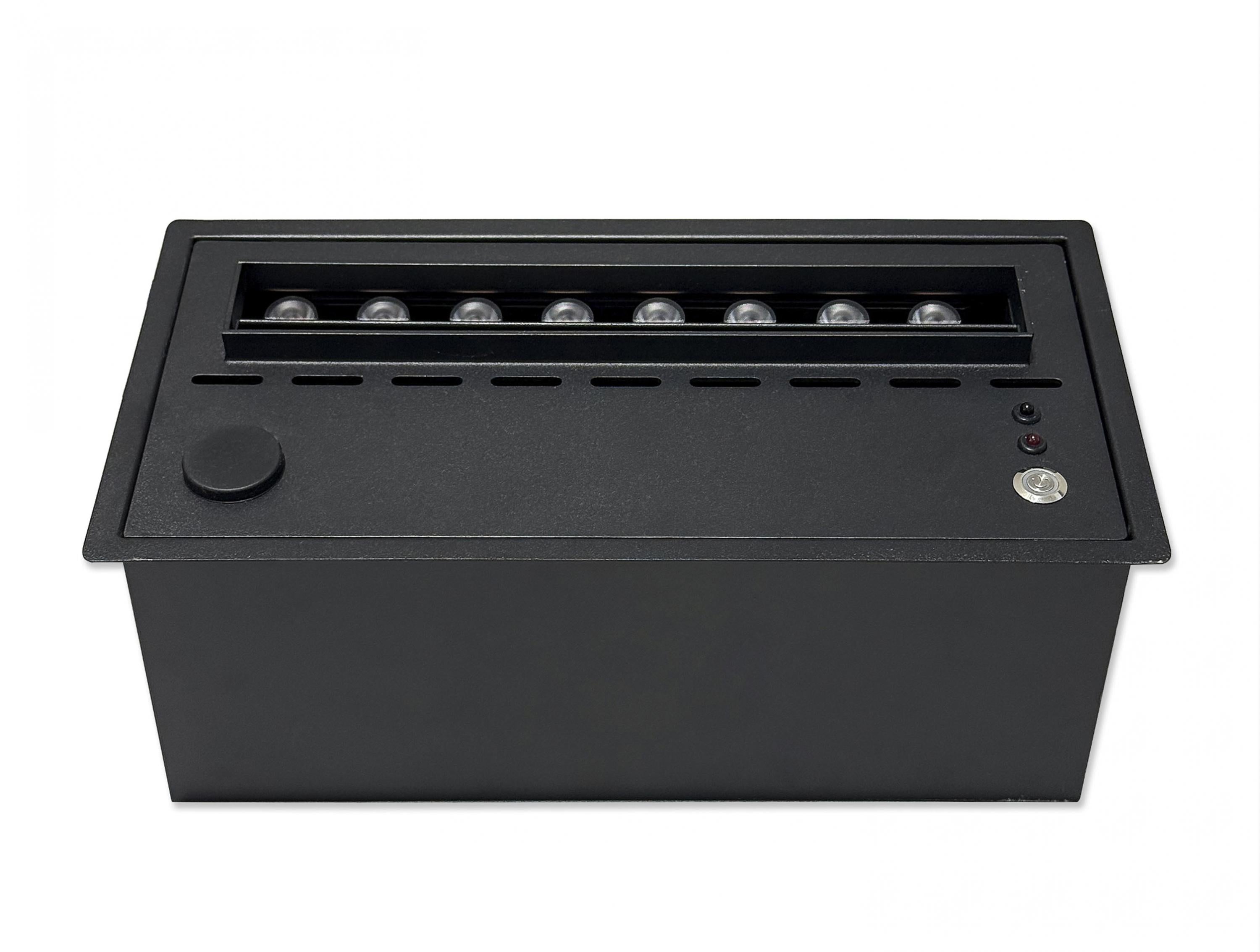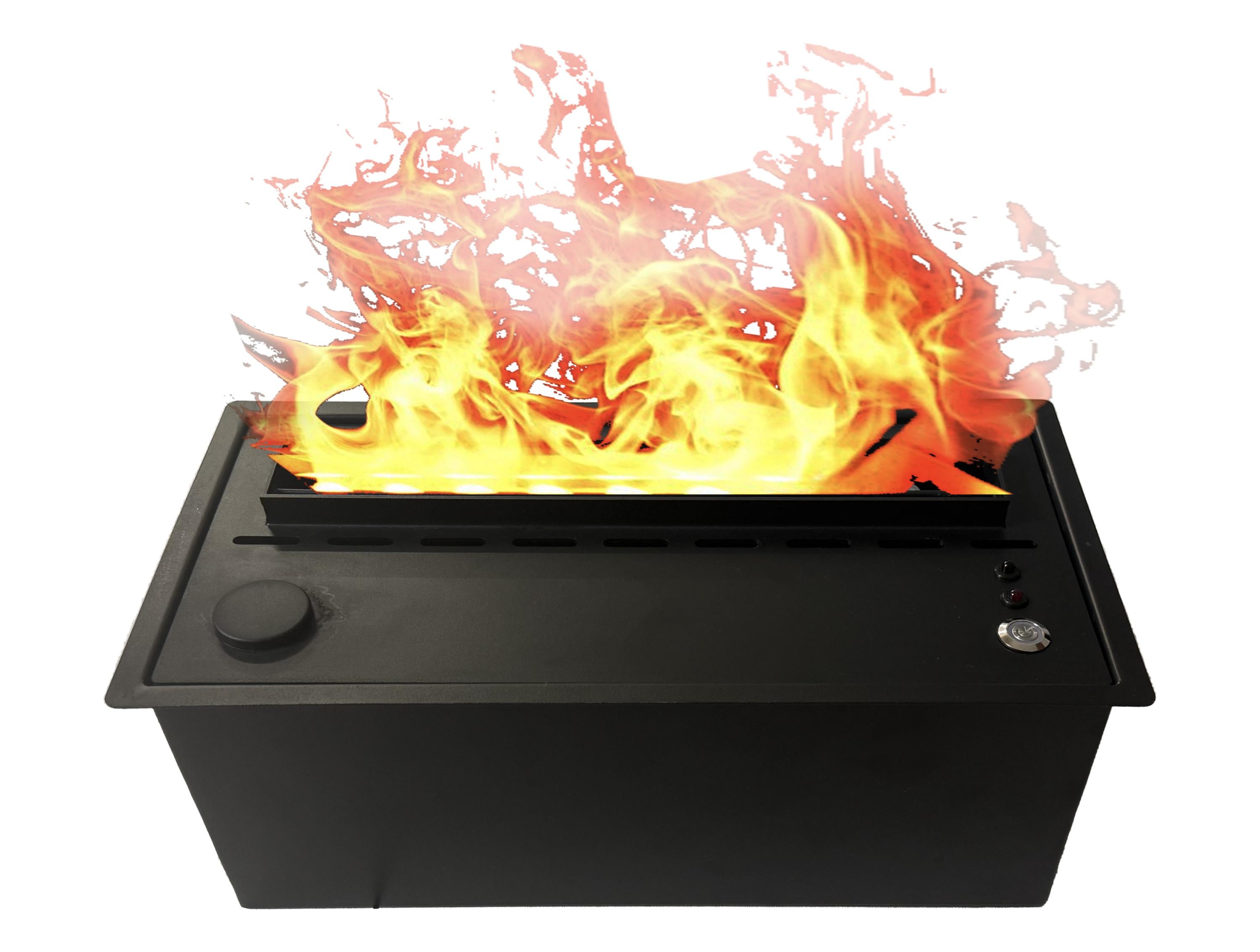 Imitación hiperrealista del fuego sin emisión de humo ni gases. Cuerpo adiconal de metal en color negro. Caudal máximo 100 ml/h. Autonomia: 5-8 horas. Aviso depósito vacio. Mando a distancia. Depósito de agua de 1.5L. Led color Naranja