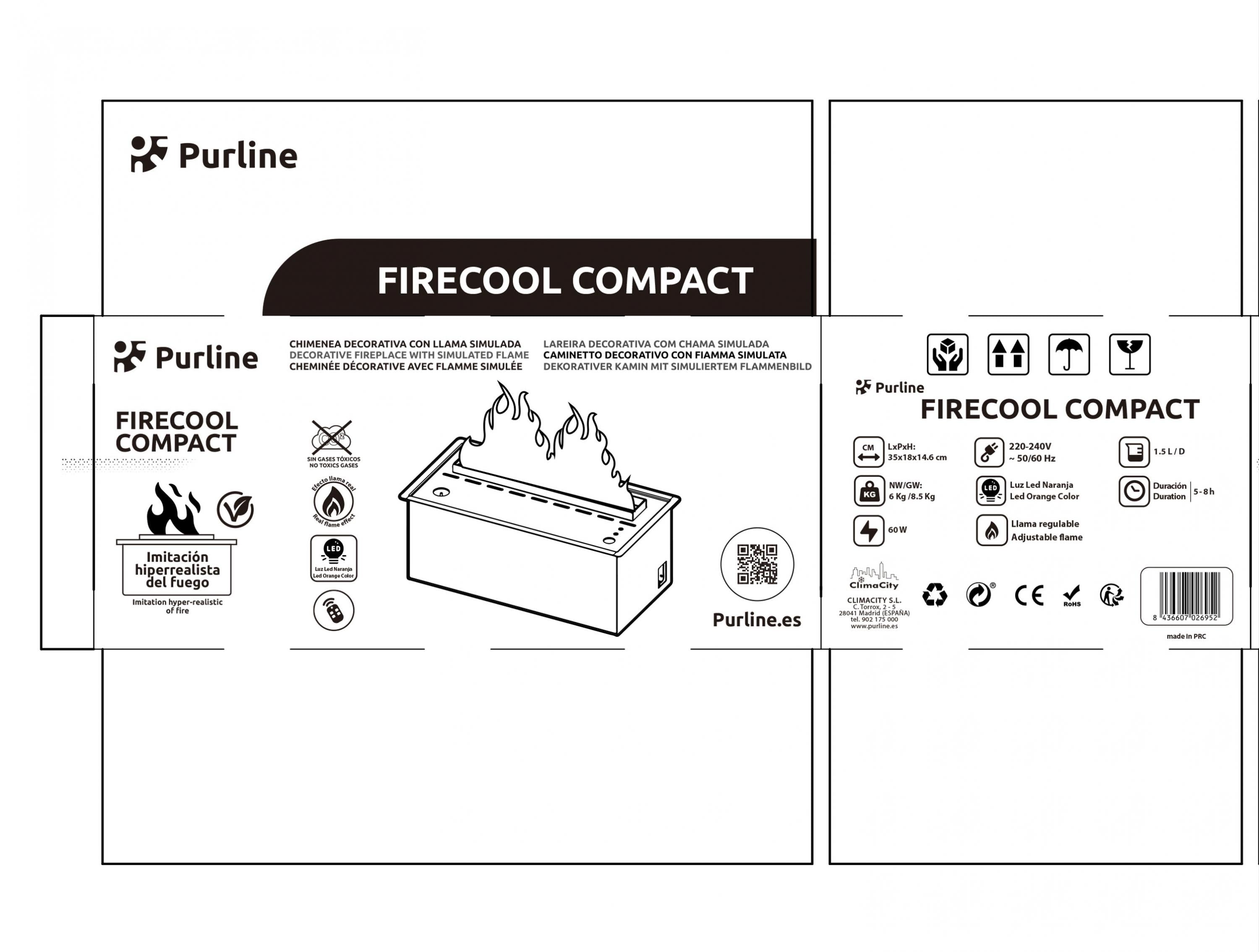 ¿Sabías que puedes disfrutar del ambiente acogedor de una chimenea sin preocuparte por el humo, el gas o el calor excesivo? Con la chimenea decorativa FIRECOOL COMPACT de vapor de agua, transforma cualquier espacio en un rincón moderno, compacto y completamente seguro.La FIRECOOL COMPACT es una chimenea decorativa diseñada para ofrecer una experiencia visual envolvente en un formato reducido. Gracias a su tecnología de llama simulada mediante vapor de agua, genera una imitación hiperrealista del fuego, suave y natural, sin emitir humo ni gases tóxicos o contaminantes.Fabricada en acero de color negro, combina resistencia y elegancia, adaptándose con facilidad a cualquier estilo decorativo. Su sistema de iluminación LED en color naranja intensifica el efecto de la llama, creando un ambiente cálido y acogedor. Además, permite el ajuste del tamaño de la llama en 3 niveles, para personalizar la experiencia a tu gusto.Su funcionamiento es ecológico y seguro, gracias a un depósito de agua de 1,5 litros y un caudal máximo de 100 ml/h, lo que le proporciona una autonomía aproximada de 5 a 8 horas. Incorpora también avisos de llenado máximo y de depósito vacío, garantizando un uso continuo sin preocupaciones.El manejo resulta muy cómodo gracias al mando a distancia incluido, que te permite controlar fácilmente sus funciones desde cualquier lugar de la habitación.Ideal para quienes valoran el diseño, la practicidad y el confort, la FIRECOOL COMPACT es la opción perfecta para disfrutar del efecto de una chimenea decorativa moderna y versátil en cualquier época del año.
