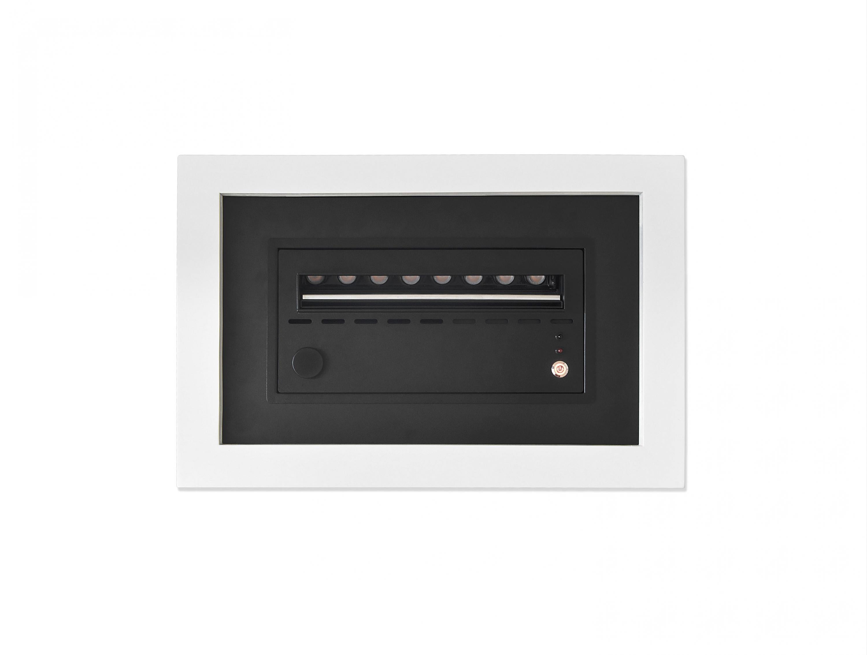 Imitación hiperrealista del fuego sin emisión de humo ni gases. Cuerpo adicional e metal en color blanco. Caudal máximo 100 ml/h. Autonomia: 5-8 horas. Aviso depósito vacio. Mando a distancia. Depósito de agua de 1.5L. Led color Naranja