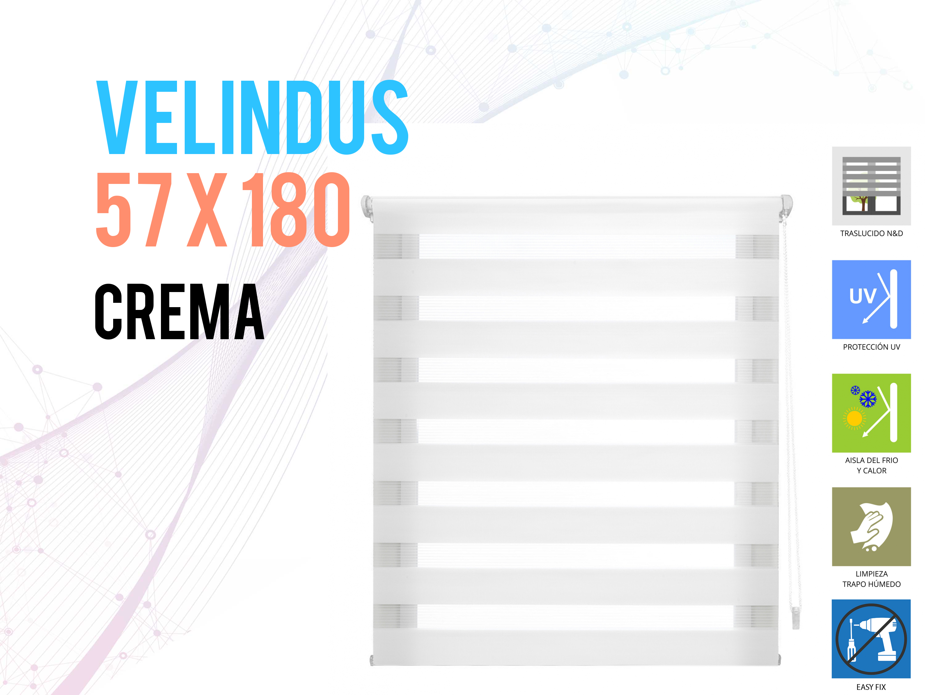 El VELINDUS es un modelo con tejido doble noche y día bicolor, con el que conseguirás un espacio personal y genuino. Gracias a su sistema de instalación easy fix sólo tendrás que colocar el estor mediante sus adhesivos o pinzas en el marco de tu ventana, sin necesidad de usar taladros. Además su mecanismo de cadena te permitirá subir y bajar el estor fácilmente para graduar el acceso de luz.